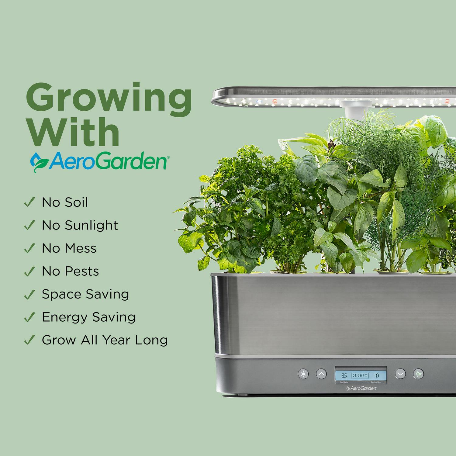 Why wait for the perfect weather to have a great gardening day Meet the AeroGarden Harvest Elite Slim, a sleek, stainless steel hydroponic garden that grows up to 6 of your favorite herbs, veggies, or flowers year-round – no sun, soil, or green thumb required. The indoor garden’s grow light hood contains 20W of white, red, and blue LED lights, giving your plants the full spectrum of light they need to grow quickly – up to 5x faster than in soil. The Harvest Elite Slim adjusts for up to 12″ of grow height and is slender in shape. Its automatic timer makes sure the lights go on and off at exactly the right time, and the digital display and illuminated push button controls tell you when to add water and plant food. Throw in vacation mode and you’ve got one of the most advanced indoor gardens ever. The AeroGarden Harvest Elite Slim looks great anywhere – kitchen, office, you name it. Not to mention, the included Gourmet Herbs Seed Pod Kit, featuring Genovese Basil, Curly Parsley, Dill, Thyme, Thai Basil, and Mint, lets you keep the fresh flavors of summer all year long.