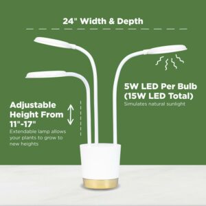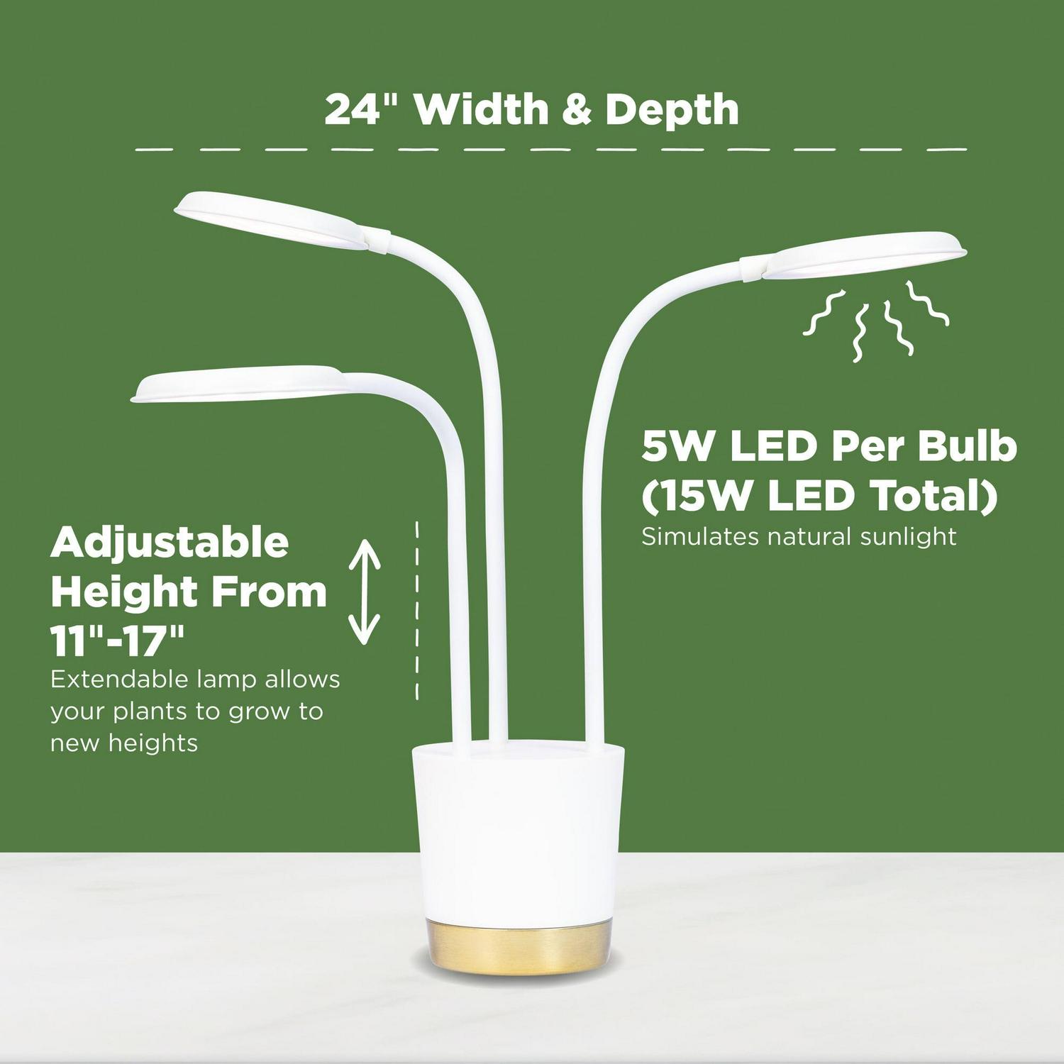 – The Trio Light is adjustable, suiting plants up to 12 inches tall, features three arms, each with a 5W LED light, for a total of 15W, and includes a 6 foot power cord