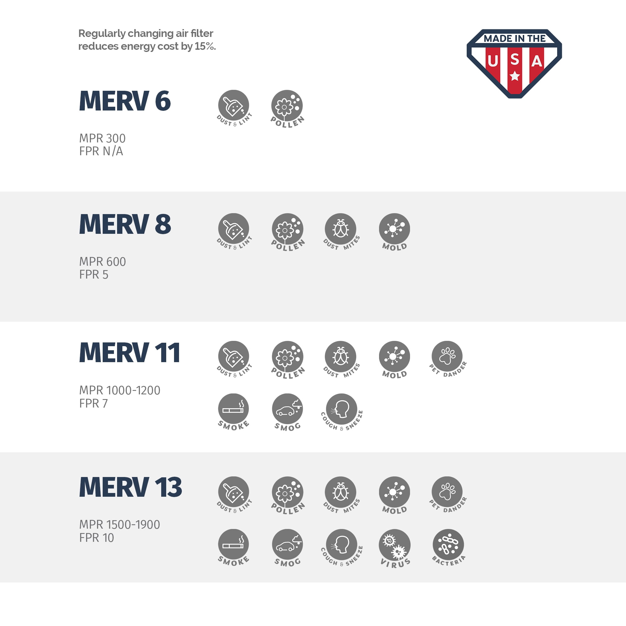 Nominal Size: 20 x 25 x 1, Actual Size: 19 3/4″ x 24 3/4″ x 3/4″ Comparable to 3M Filtrete MPR 1500 to 1900 Ultimate Allergen Defense Comparable to Honeywell Allergen Elite FPR 10 Fights lint, dust mites, mold spores, pollen, pet dander, fine dust, smoke, viruses, and bacteria. Change frequency 60-90 days.