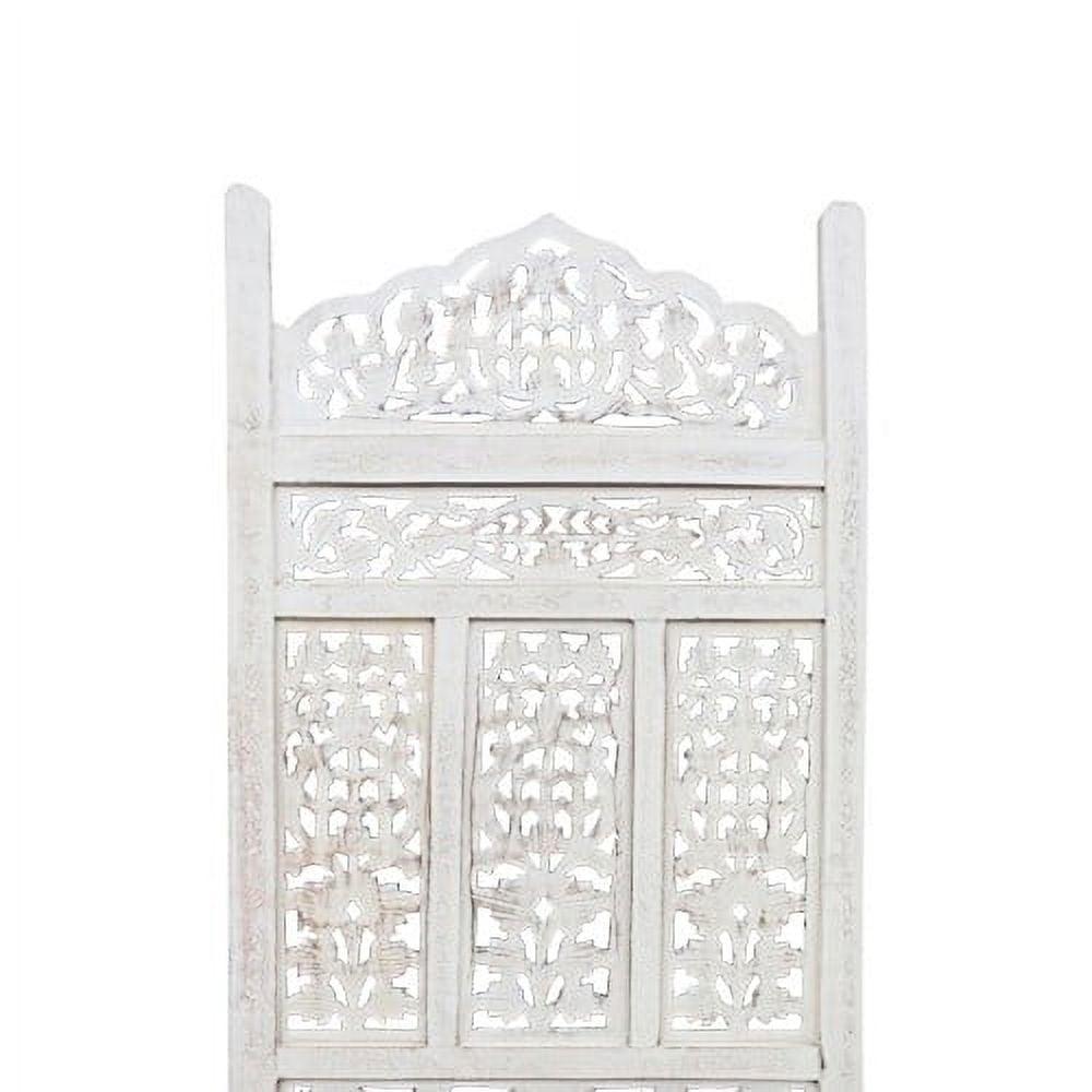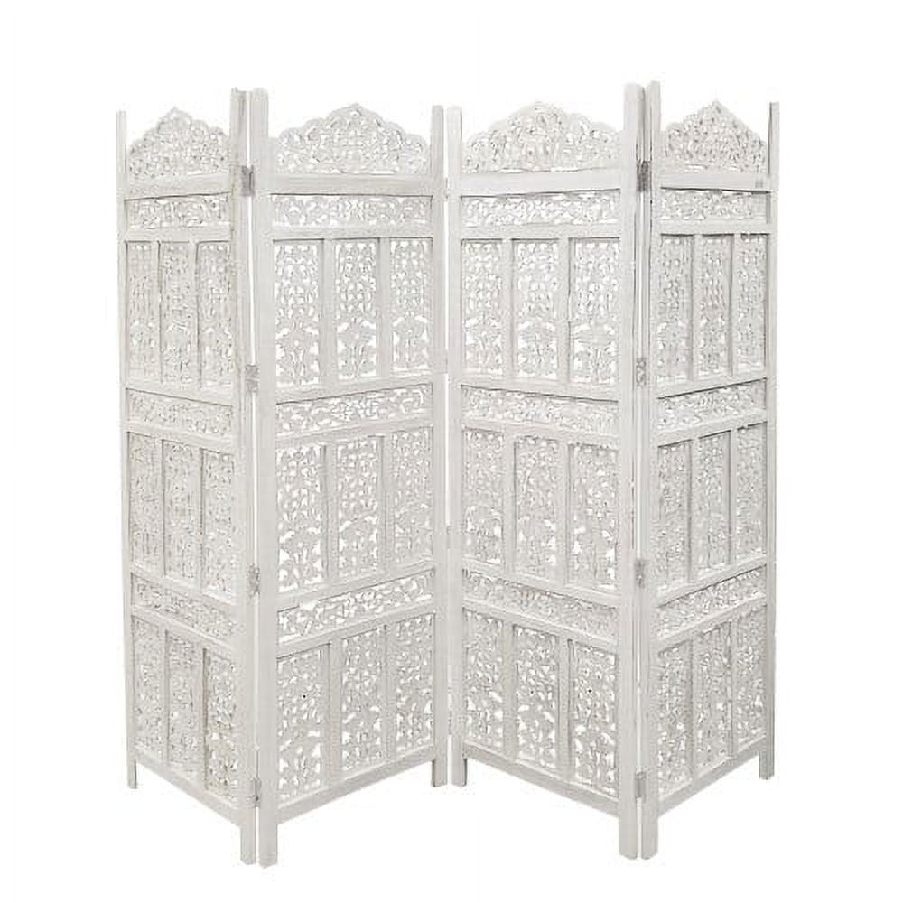 Aesthetically Carved 4 Panel Wooden Partition Screen Room Divider, Distressed White- Saltoro Sherpi