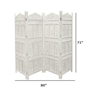 Aesthetically Carved 4 Panel Wooden Partition Screen Room Divider, Distressed White- Saltoro Sherpi This Room Divider Is Exquisitely Designed With An Antique White Finish. It Is Made Up Of Fine Quality Wood Which Can Complement Any Interior Style. Traditional In Design, This Wooden Screen Can Be Used Anywhere In Your Room, Apartment, Living Room, Bedroom, or Loft, Providing A Great Utilization Of Any Large Space.