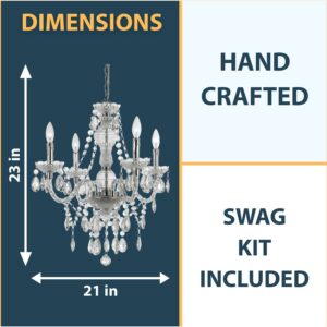 The AF Lighting 8350-4H Naples Four-Light Mini Chandelier is great to use in any décor to bring that pop of color and fun crafted in cut plastic our 4-light mini. Part of the Elements series, it comes with a swag kit, and it can also be hardwired if needed. Dripping with lots of teardrops and beads making this a fun item in your décor. Due to handcrafting, no two are alike. Poly fabric clip on shades (8528-4S) in white sold separately. Some assembly required.