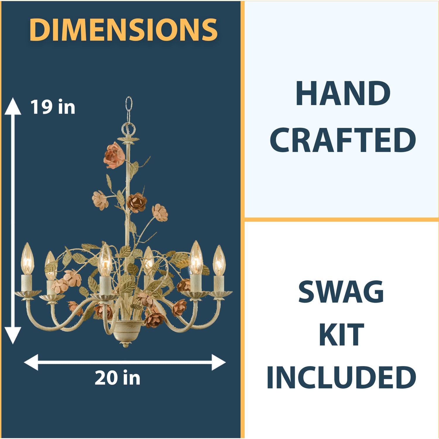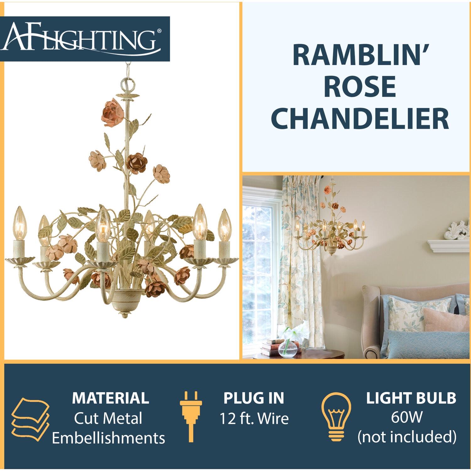 From charming table lamps to handcrafted chandeliers and everything in between, AF Lighting offers inspired lighting for today’s lifestyles. Our unique floral chandelier from the Ramblin Rose lighting collection features six candelabra-style lights arranged on scrolled arms with metal bobeches. Delicate cut-metal roses and leaves hand-painted pink and green trail along an antique cream frame. Hang it as an easy plug-in swag lamp or professionally hardwire it to a wall switch (hardware and instructions included). This charming garden-inspired lighting will attract attention in any room it is placed in – living room, dining room, bedroom, nursery, or walk-in closet.