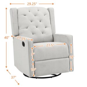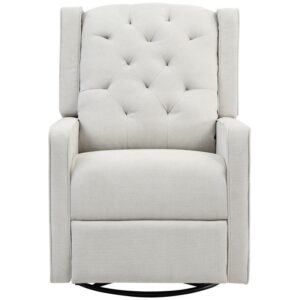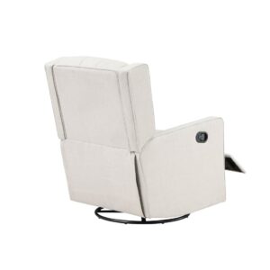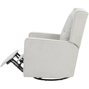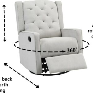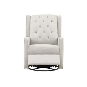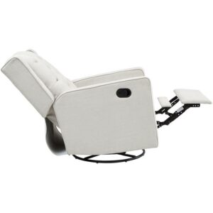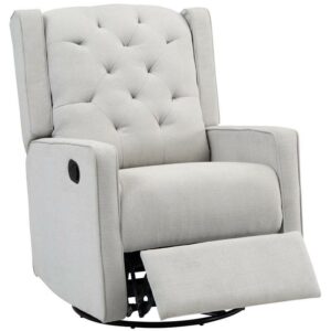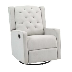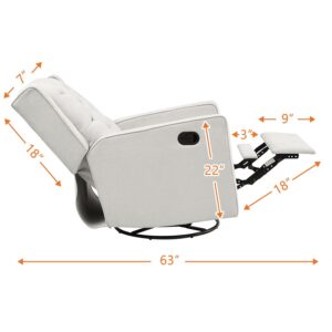 The Ava Manual Swivel Glider Recliner provides comfortable seating in the nursery, living room, or office. It is ideal for nursing a baby, watching tv, or simply relaxing after a long day of work. The long-lasting sturdy hardwood construction and generous puffed and cushioned seat, back, and squared arms with super-soft micro-suede fabric and button-tufted upholstery will ensure maximum comfort, support, and enjoyment. For even more added comfort, this swivel glider recliner features a built-in manual pull recliner mechanism, located on the exterior, right-hand side of the arm rest, that is used to kick your feet up or fully recline the chair back and relax.