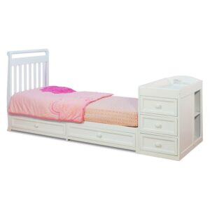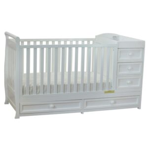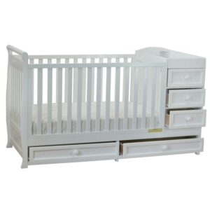 The Daphne I 2-in-1 Convertible Crib is perfect for the space conscious family. Its versatile build creates the perfect baby station. The changing table comes equipped with three drawers and two unit shelves that can later be used as a nightstand/dresser. Its durable nontoxic finish makes the crib easy to maintain.