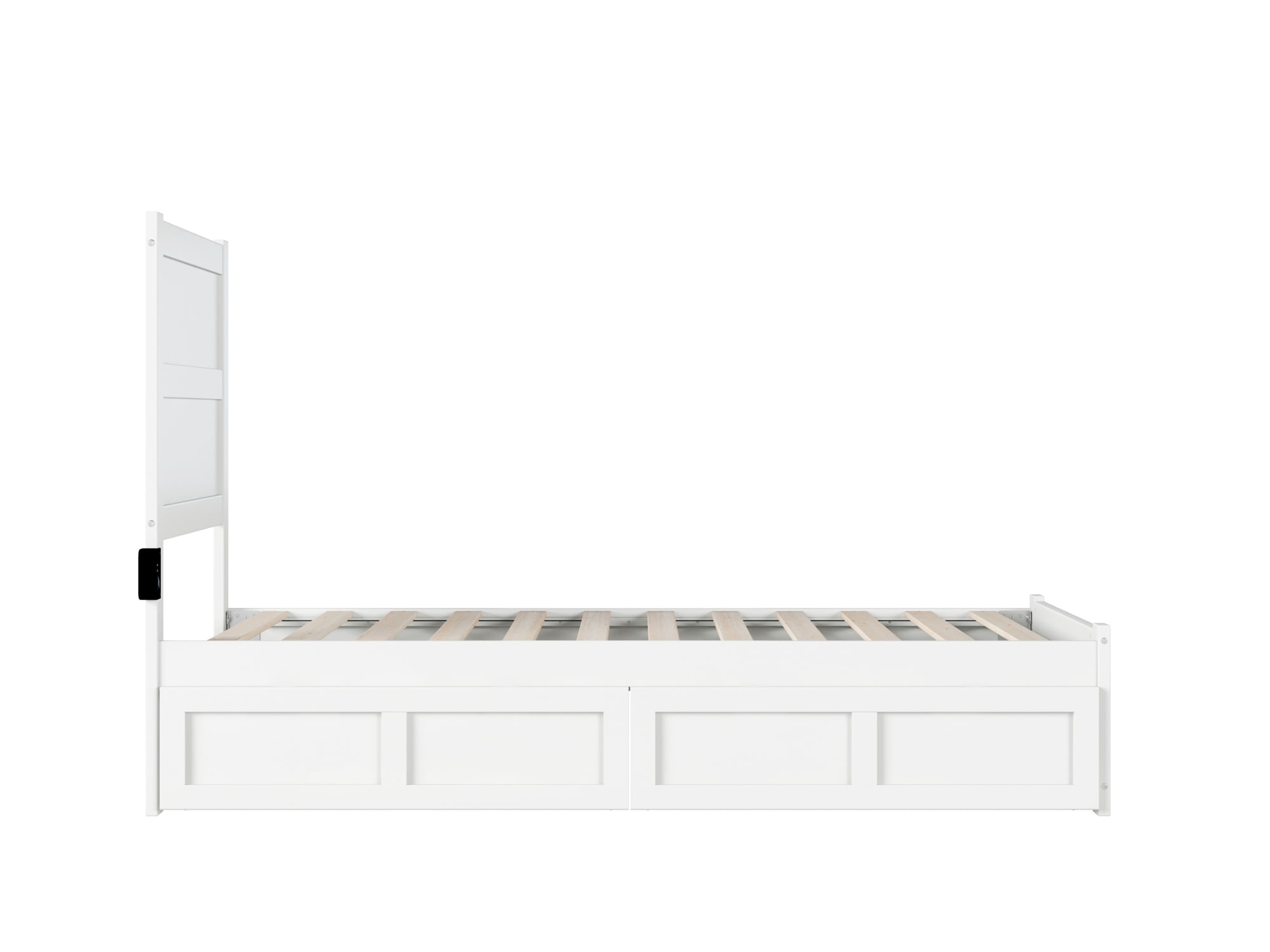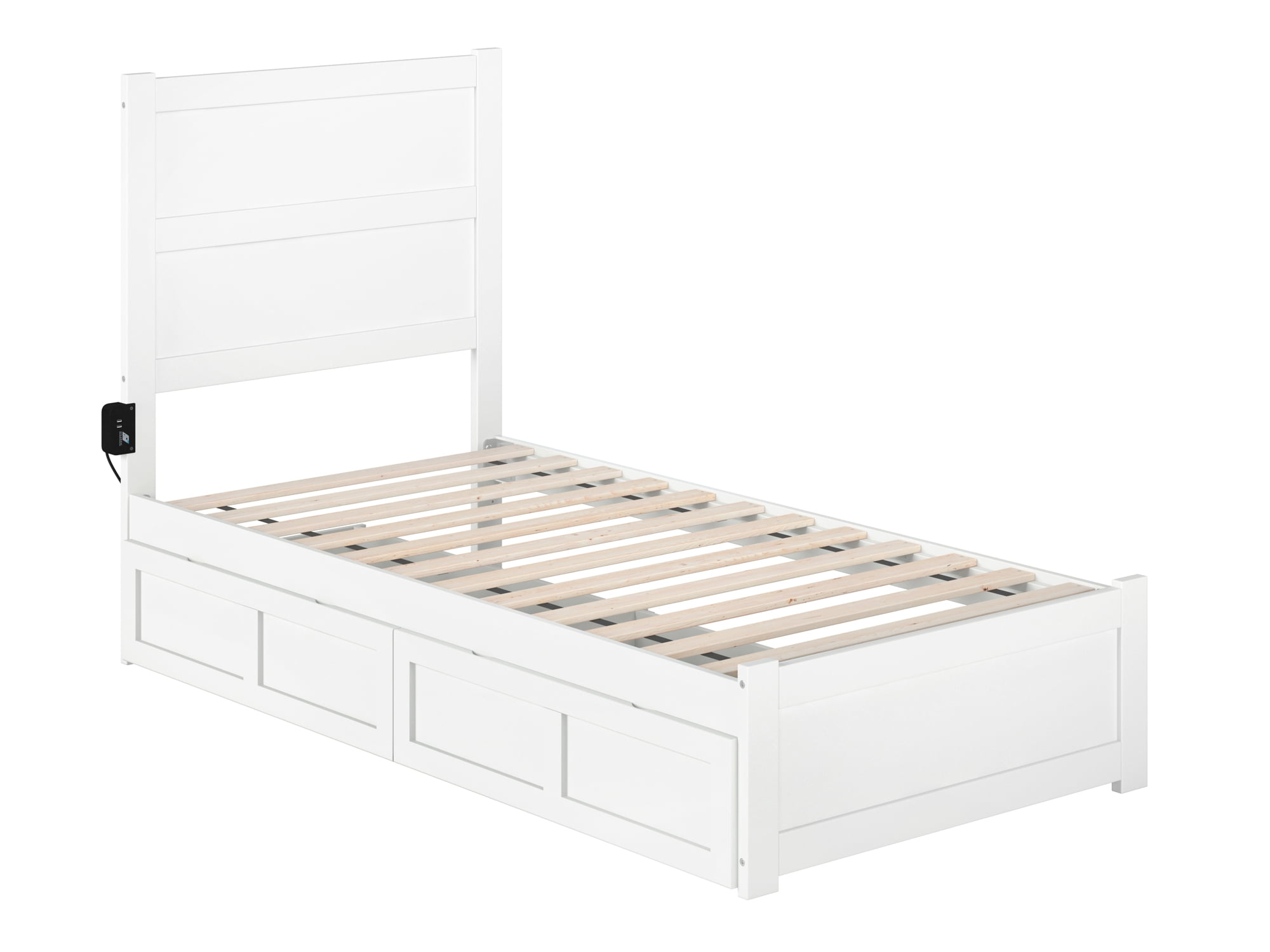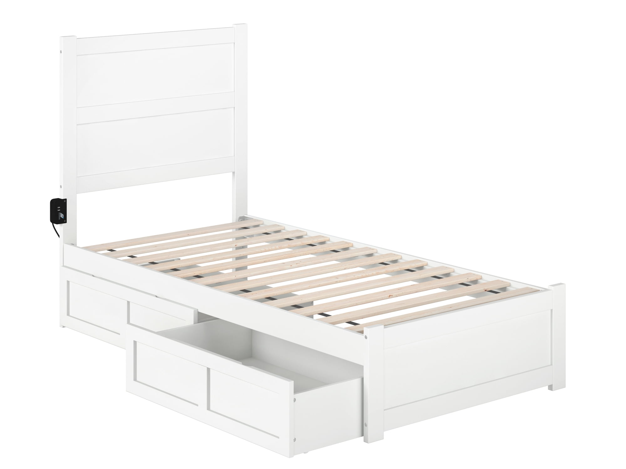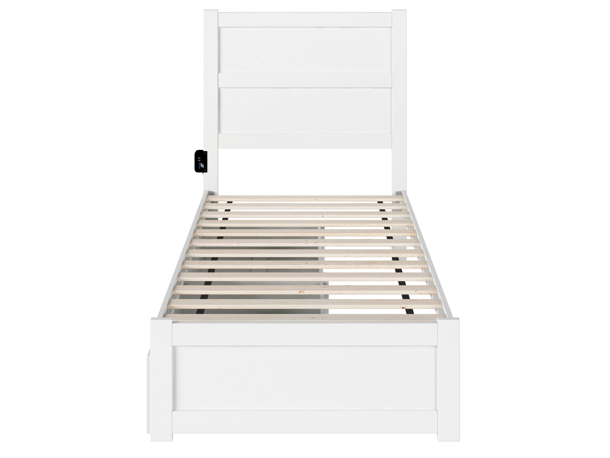 AFI NoHo Twin Wood Platform Bed with Headboard, Footboard & 2 Storage Drawers in White Mid-Century Modern Design: Sturdy, Solid Wood Construction features simple, minimalist design that will complement any room Bed & Storage Drawers Feature Solid Hardwood and Veneers with a 5 Step Non-Toxic Finish Bed comes with 2 free floating underbed drawers that can be placed on either side of the bed No Box Spring Needed: Designed for lasting durability, our slat kit supports your mattress to increase air flow for a more comfortable, cooler sleep Charging Station: Includes Surface Mount Turbo Charger, 6-foot cord, ETL listed, 18GA wire,2 USB Ports .5V/3.5A Assembled Dimensions: 76″L x 38.25″W x 47.625″H Weight Capacity: 600lbs