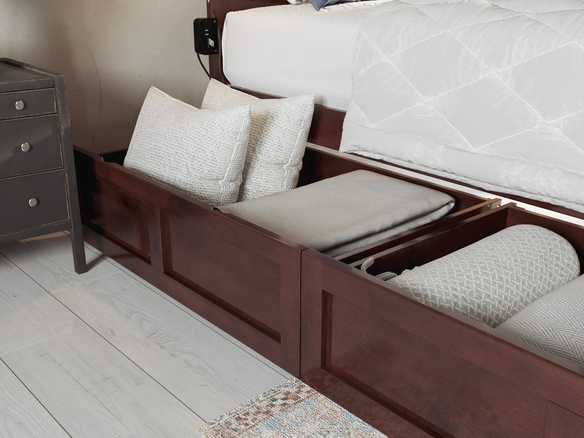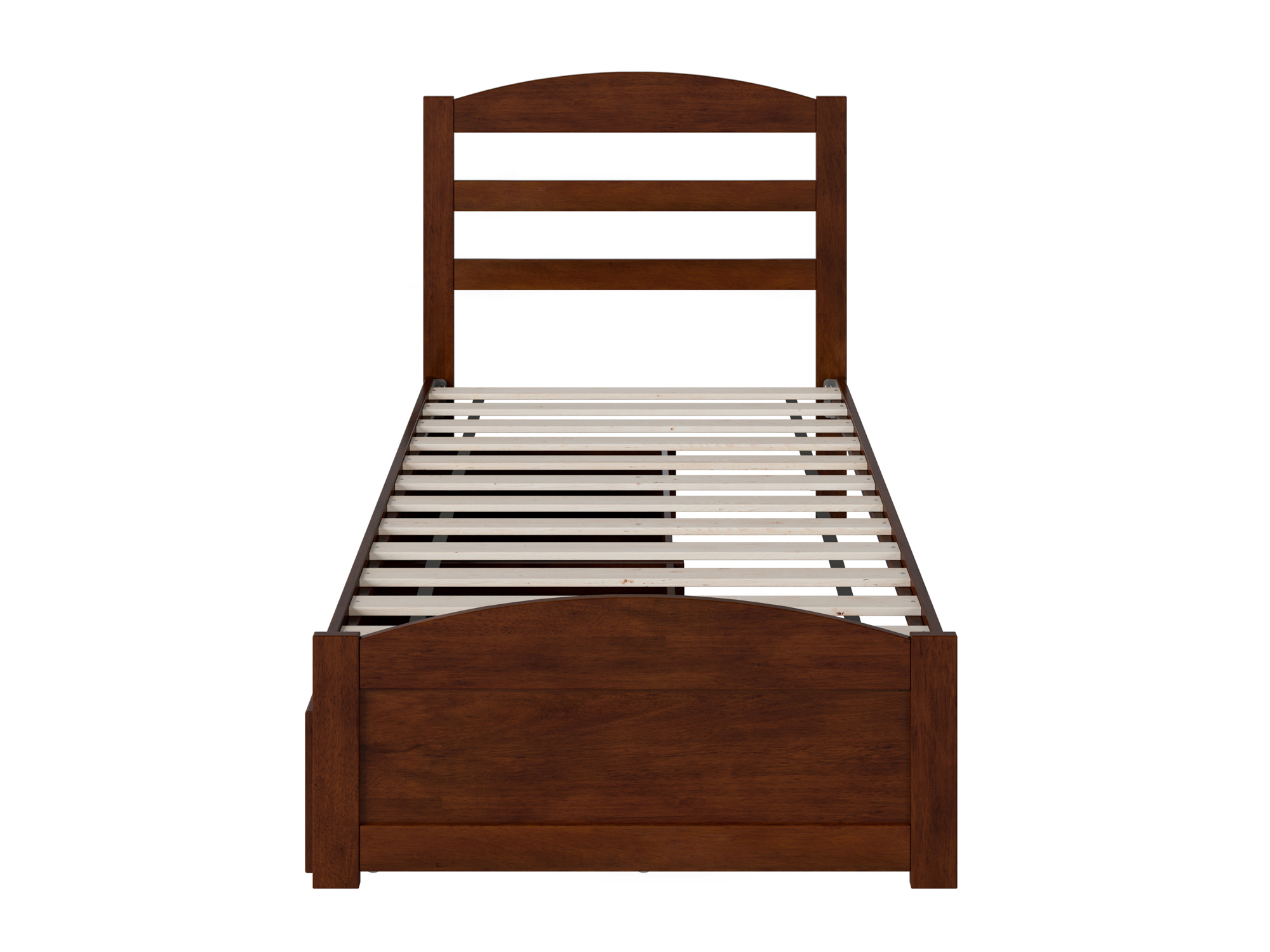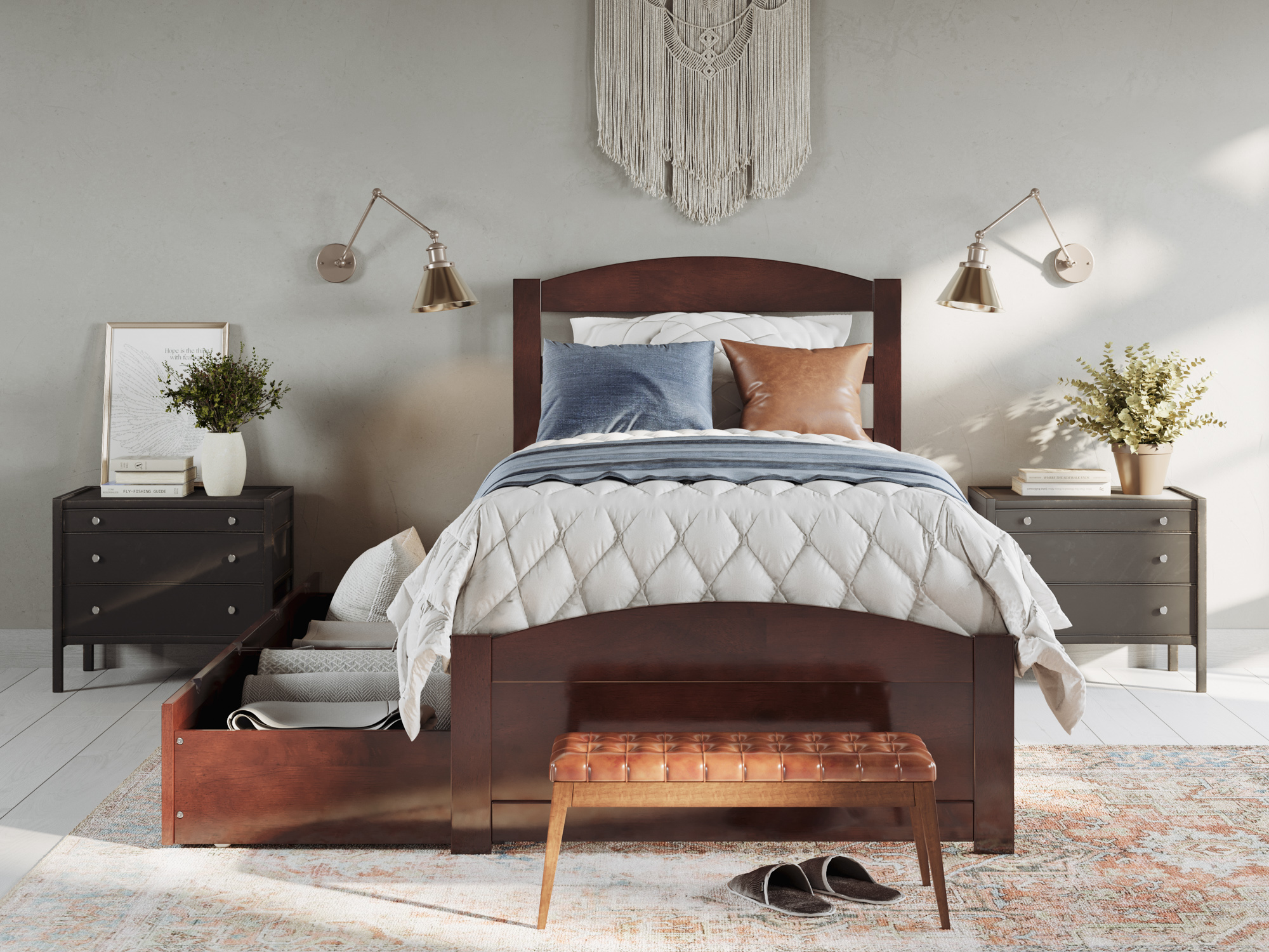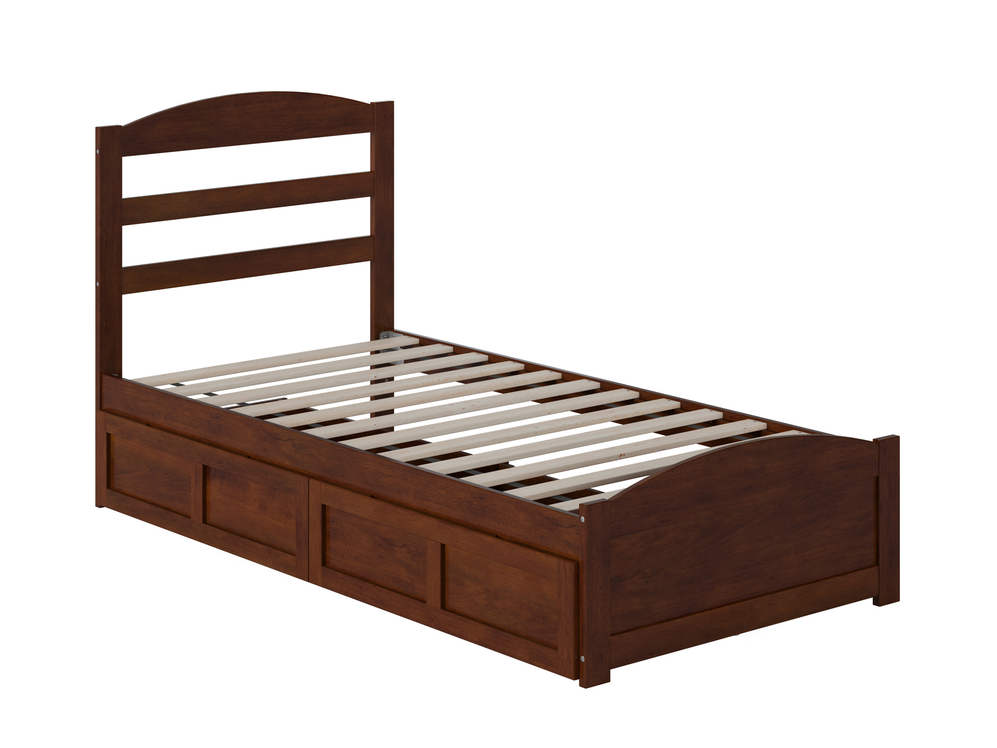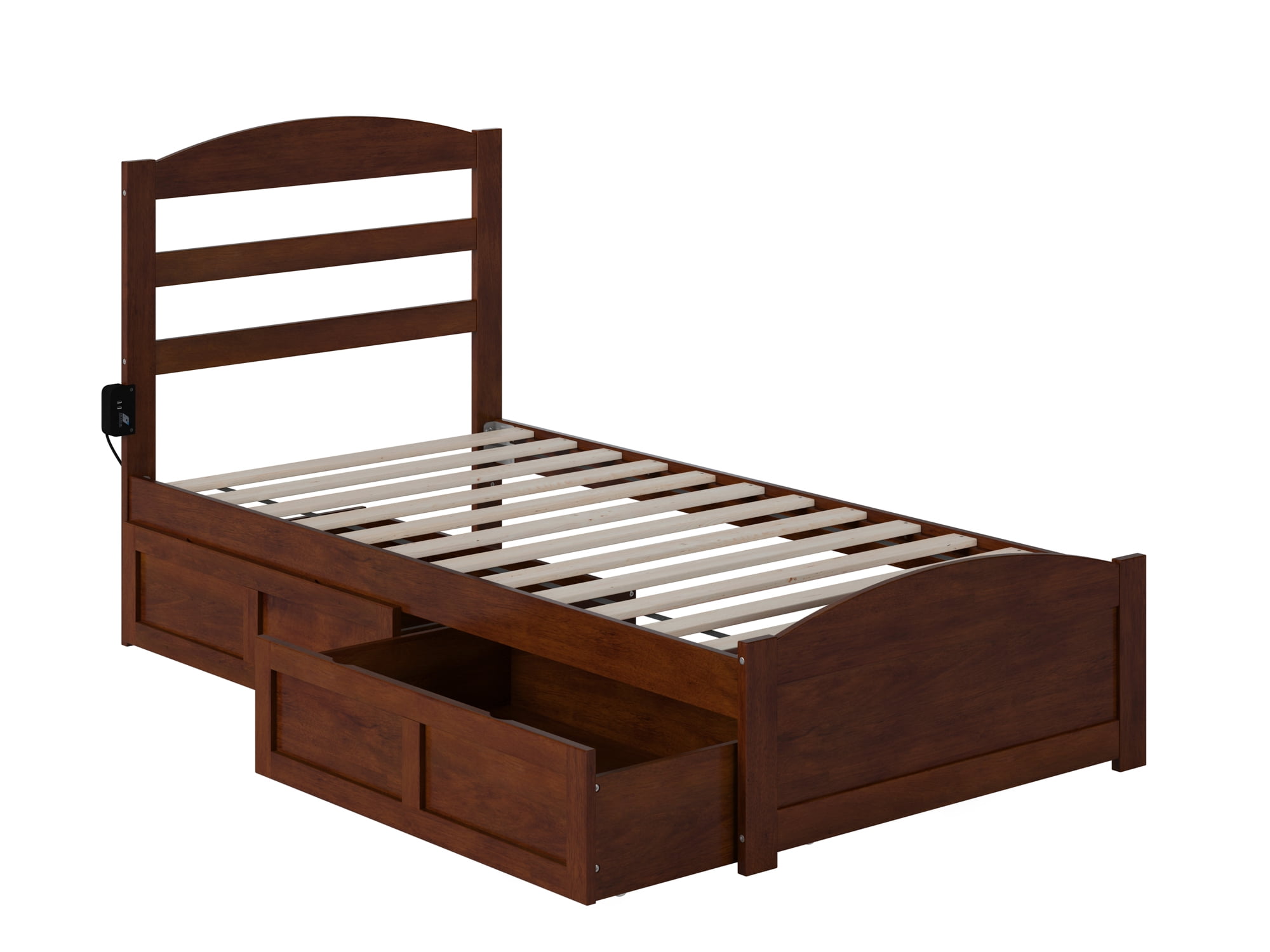 AFI Warren Twin Wood Platform Bed with Headboard, Footboard & 2 Storage Drawers in Walnut Minimalist Mission Inspired Design Sturdy, solid wood construction features simple, mission inspired design that will complement any room Bed & Storage Drawers Feature Solid Hardwood and Veneers with a 5 Step Non-Toxic Finish Bed comes with 2 free floating underbed drawers that can be placed on either side of the bed No Box Spring Needed: Designed for lasting durability, our slat kit supports your mattress to increase air flow for a more comfortable, cooler sleep. Charging Station: Includes Surface Mount Turbo Charger, 6-foot cord, ETL listed, 18GA wire,2 USB Ports .5V/3.5A Assembled Dimensions: 76″L x 38.38″W x 41.38″H