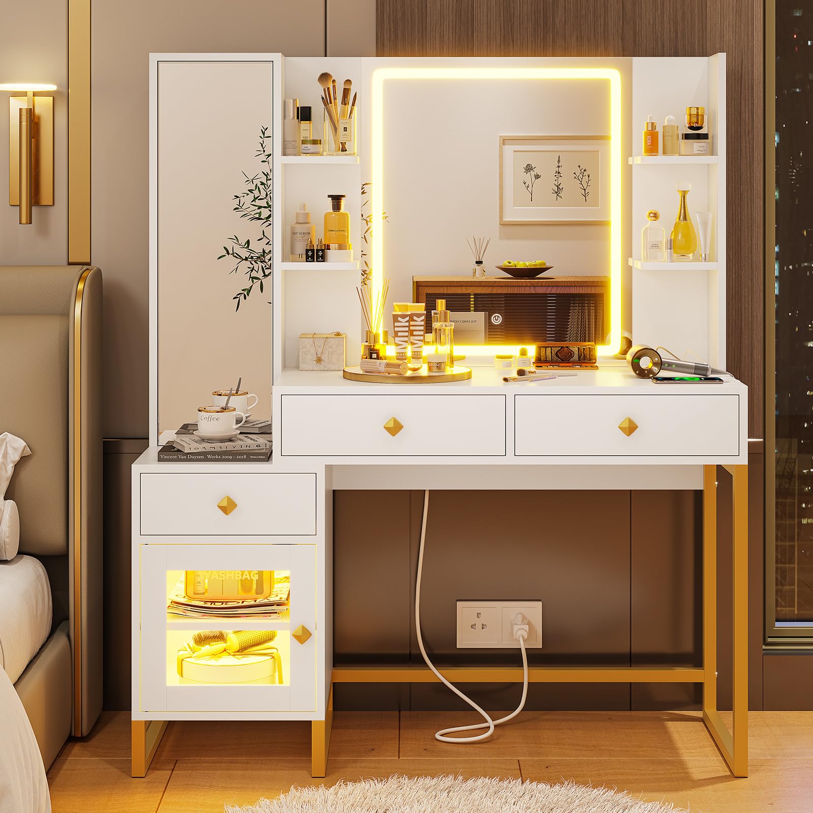 Afuhokles Vanity with Lighted Mirror and Charging Station, Makeup Table with Jewelry Armoire, Full Length Mirror, RGB Cabinet, White