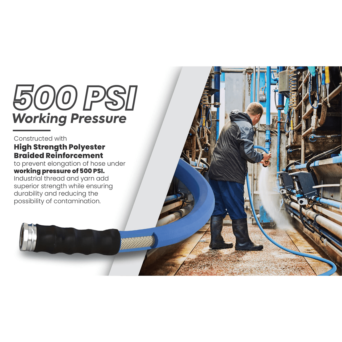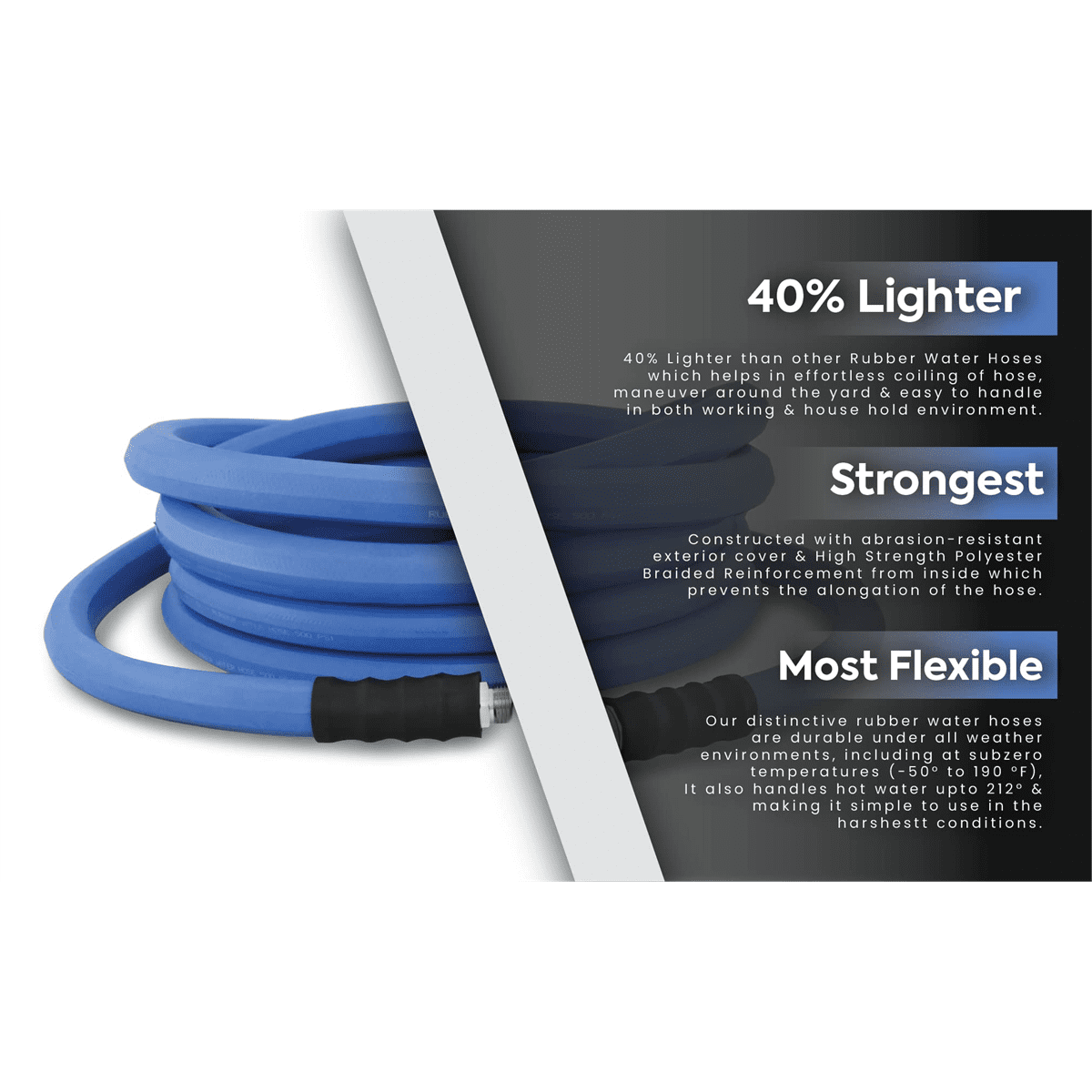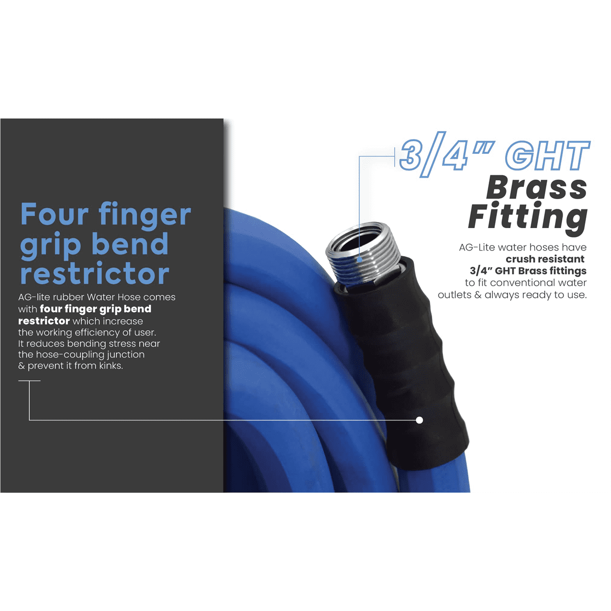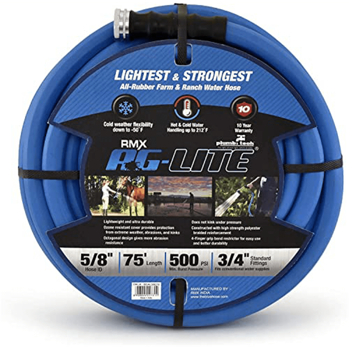 LIGHTEST, STRONGEST: 30% lighter and still rubber, AG-Lite is a professional grade next-generation rubber hose with a 10-Year replacement warranty. The lightest and strongest rubber garden hose on the market. HIGH STRENGTH AND PRESSURE: 500 PSI max pressure. Can run both hot and cold water. Hot water up to 200F. Ideal for both home, farm and ranch use. COLD WEATHER FLEXIBILITY: The best cold-weather flexibility in its category, down until -50F. No chance of cracks with an ozone resistant cover that provides protection from extreme weather and UV. Resistant to abrasion and kinks. FITTING: AG-Lite’s revolutionary end fitting design fits all 3/4″ GHT conventional style outlets and water equipment. EASE OF USE: Each hose comes with a 4 Finger-grip bend restrictor to avoid damage at ends.
