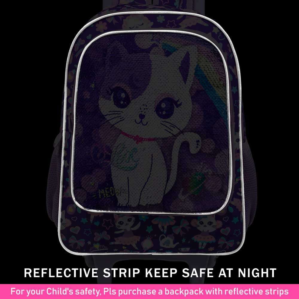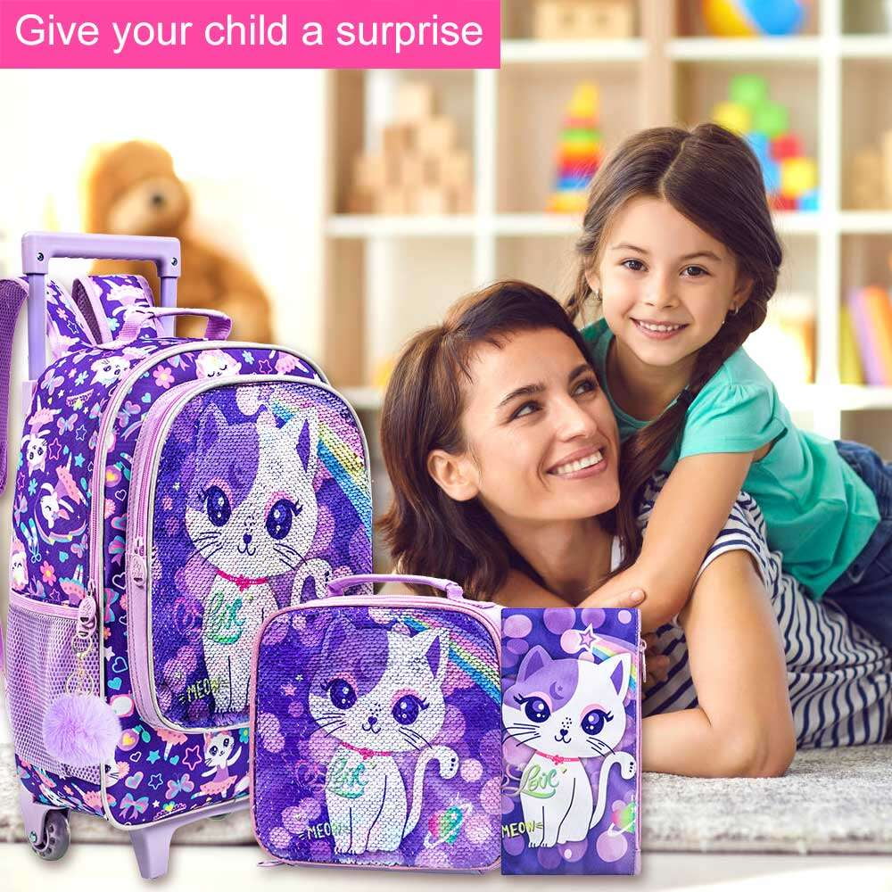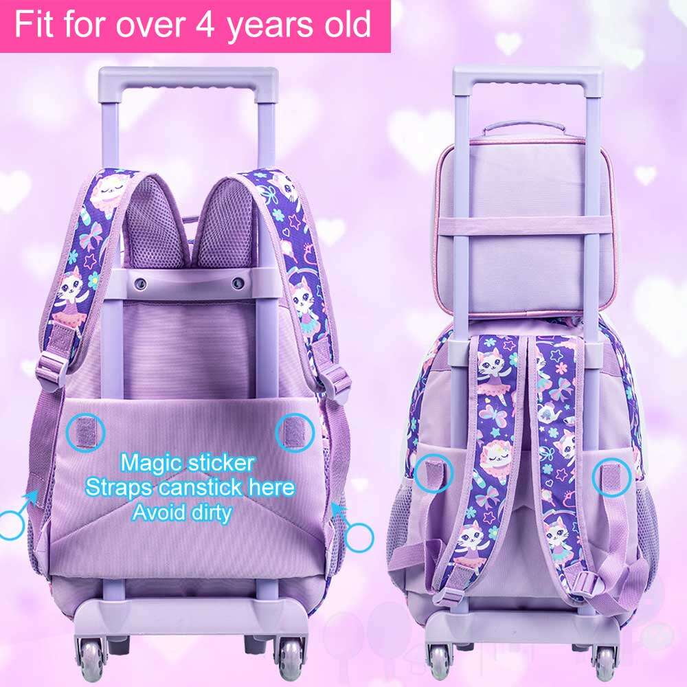 3 in 1 Girls Rolling Backpack: Kids rolling backpack+ lunch bag+ pencil bag, rich set for choice. Premium water-resistant fabric, precise stitching , durable zips for longer and smoother use. Increased Capacity: Rolling backpack for girls: 18″x12.5 “x6”, Lunch bag: 9.5 “x8.5 “x4”, Pencil bag: 8.66 “x4.72 “x0.2”, plenty of capacity to carry more stationery, books, food, toys, etc. Optimized Design: The upgraded wheels of this roller backpack for school effectively reduce noise. Smooth trolley, no jamming, low center of gravity, more stable and refuses to overturn. Trendy Pattern: Cute and well-behaved cat image makes your girl fall in love with this kids backpack with wheels at the first time, and the elegant purple color is very popular among girls. Multi-Occasion Use: This girls rolling bookbag is sturdy and reliable, but not bulky (about 3.30LB). It can be carried and pulled, suitable for going to school, picnic, traveling and so on.