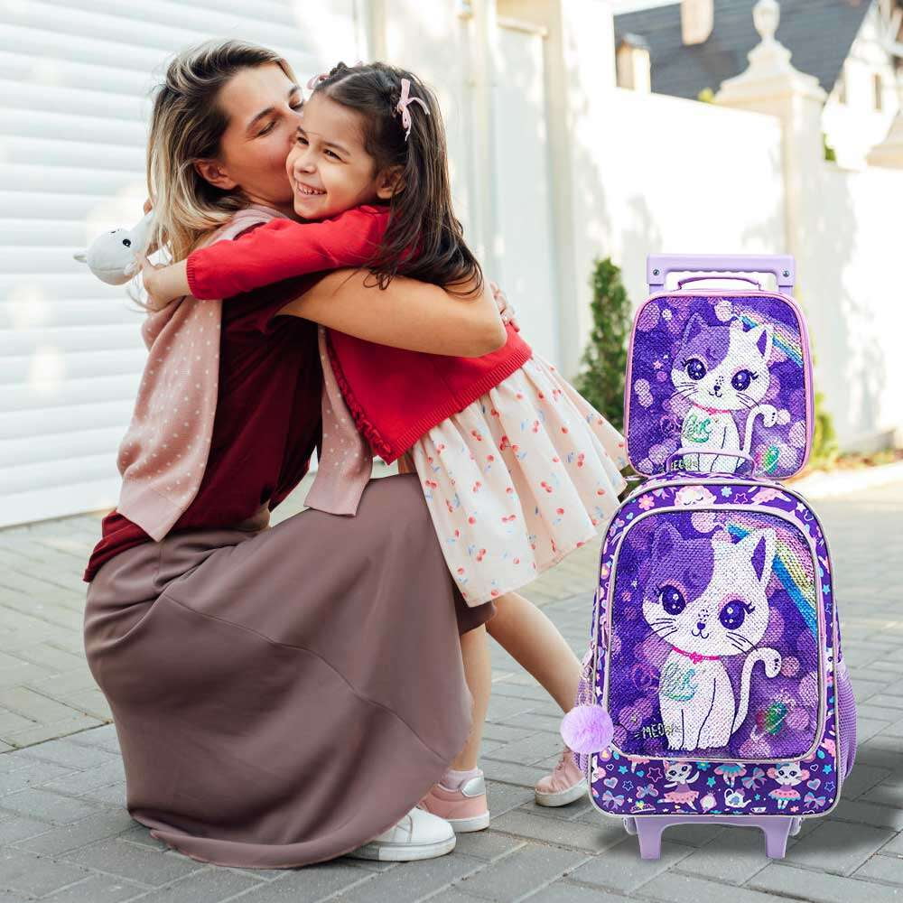 AGSDON 4PCS Rolling Backpack for Girls, Kids Cat Sequin Wheeled Bookbag, Travel Roller School Bag with Wheels