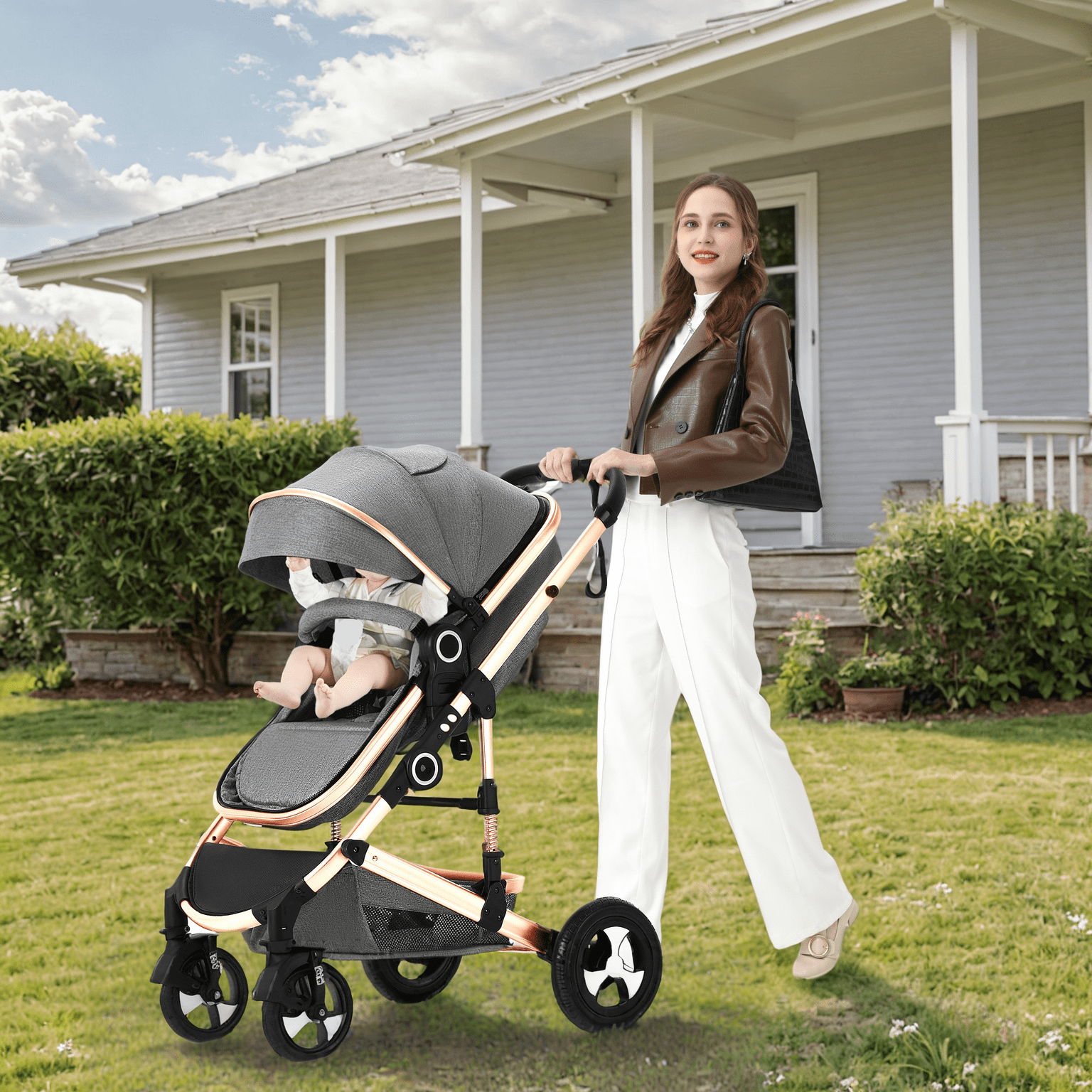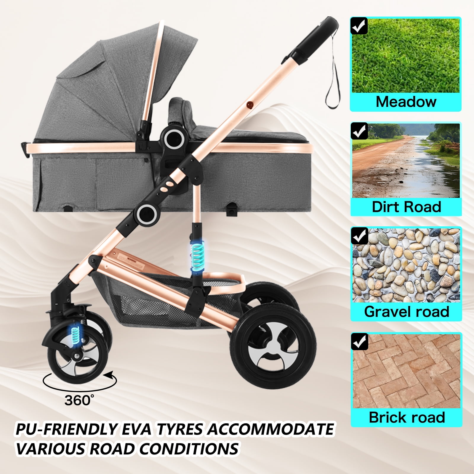 CONVERTIBLE BABY STROLLER: With the 2 in 1 design, this is not only a ordinary baby stroller, but also a warm moving baby bassinet. Reversible mode to meet your various needs. When the seat faces forward, the high landscape stroller allows your kids to enjoy the view outside and stay away from car fumes. In backward mode, mom and baby can interact face to face. MULTIPLE ADJUSTMENT: The seat of the baby stroller bassinet can be reclined to different positions for sleeping, lying and sitting. The angle of the backrest and feet can be adjusted. Foot cover can be detached according to your needs. The 3 – position canopy and removable visor will protect your baby from direct sunlight. Oxford cloth is a good protection against rain. Removable handle is convenient for boys girls to get in and out. ONE-HAND FOLD & PORTABLE DESIGN: The infant stroller can be easily assembled and requires no tools. Parents can easily fold the infant carriage with one hand. The direction adjustable front wheels can 360 degrees rotate or keep straight. The aluminum alloy material makes the bassinet pram light and easy to carry, suitable for family travel or going out. Extra you can get: a soft cushion, a mosquito net, a cup holder, a diaper bag. SPACIOUS ROOM & POWERFUL STORAGE: The baby pram stroller for newborn contains breathable screen windows to keep the space fresh. There is a mesh skylight at the top so you can observe baby’s condition at any time. The whole body of the toddler pushchair stroller adopts skin-friendly material. The large storage basket can be used to store your baby’s necessities or as a shopping basket. There is also a storage net behind the seat of the stroller for parents to access. SAFETY CERTIFICATION: The baby boy stroller is equipped with spring suspension system to easily adapt to various surfaces. The 5-point harness is effective in protecting the baby’s safety. Widening tires are silent and wear-resistant. Safety wrist strap to prevent it from slipping away. Rear wheels will brake with one foot. The product net content quality is 1. It’s a great choice for baby shower, birthday gifts, Christmas and other holidays.