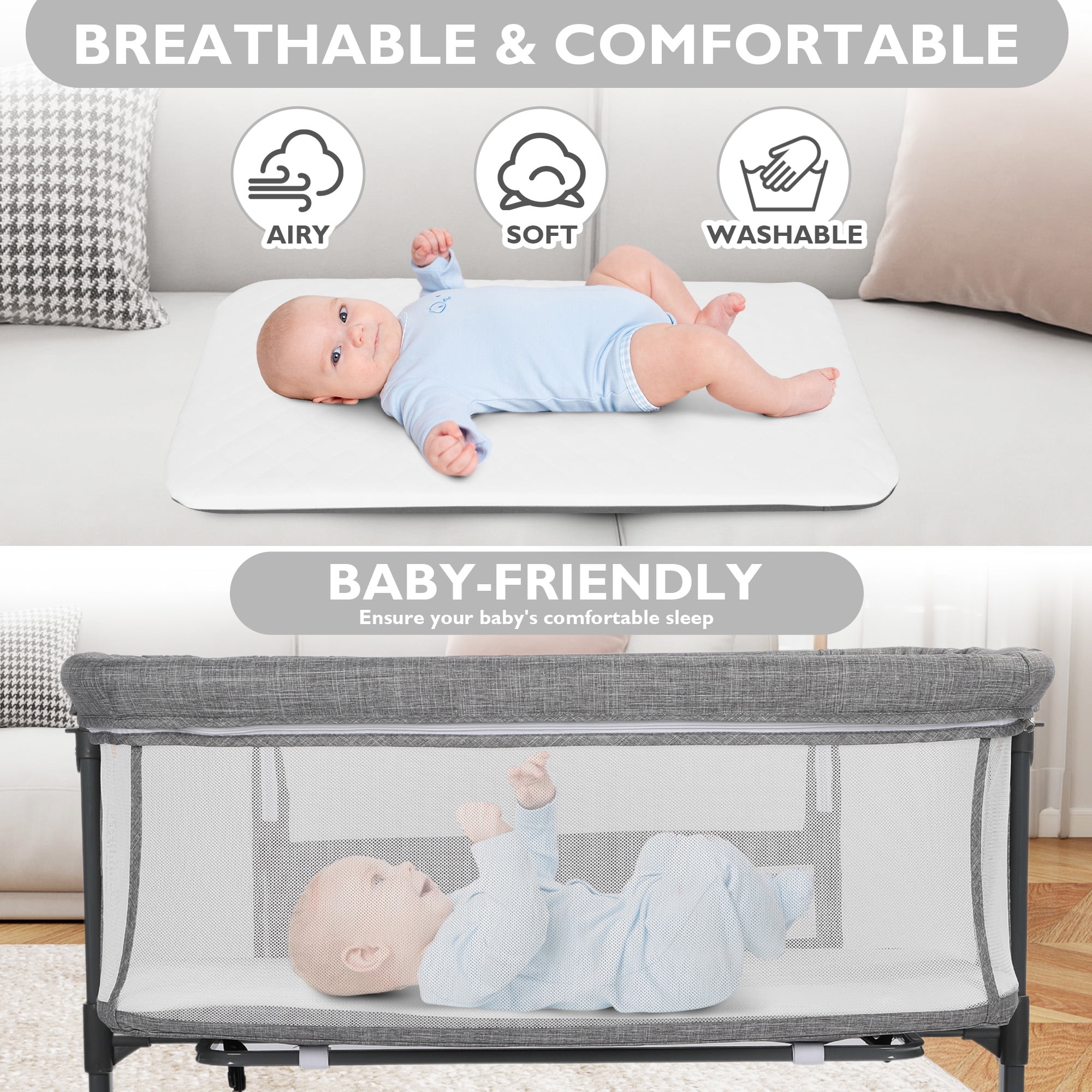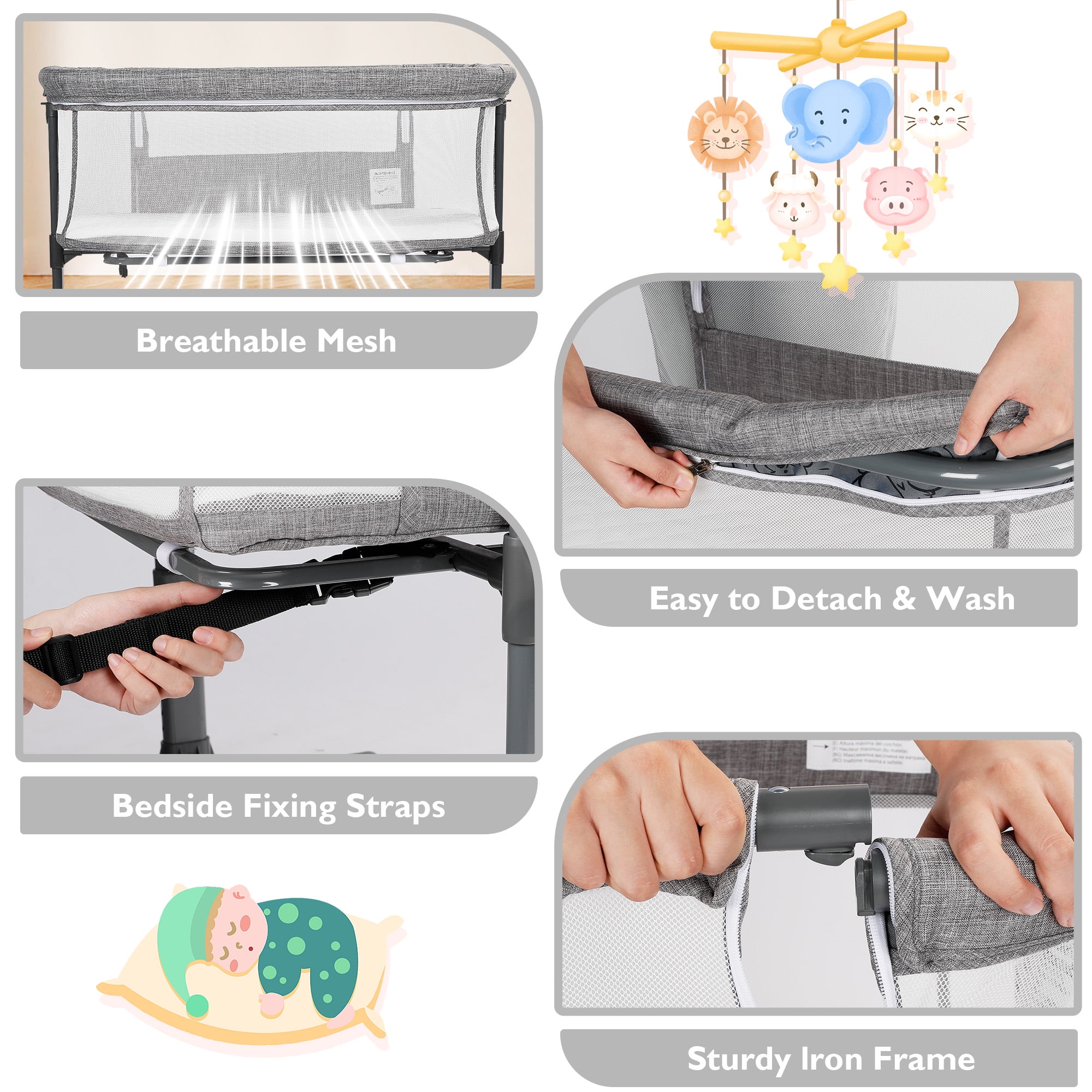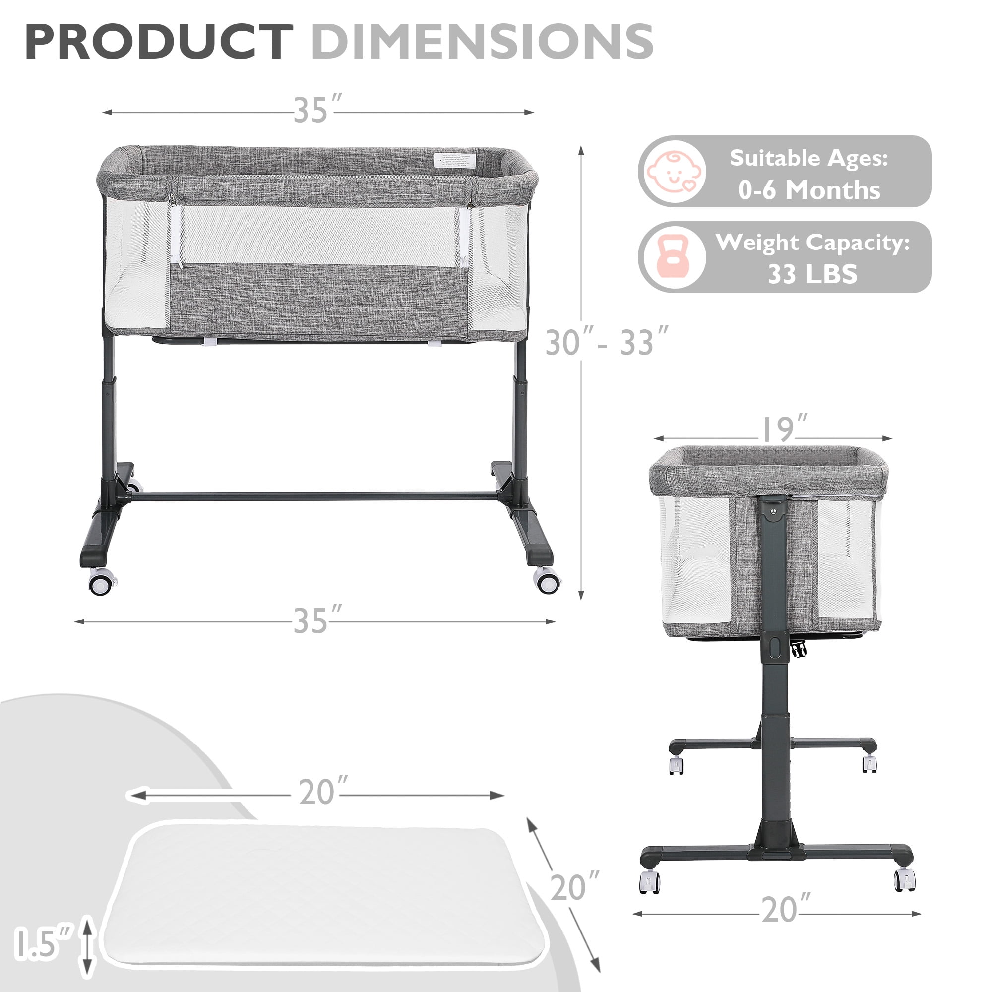 [Adjustable Height &Angle] With 6 adjustable heights, this baby bassinet can adapt to different heights of beds and sofas. Even in the midnight, the newborn bedside bassinet can provide comprehensive care and protection for babies. The bassinet sleeping surface incline angle at 7° and meets CPSC standards for baby bassinet. They are under the ten degree cut off. [Upgraded Stability & Safety] The iron frame structure has outstanding stability and durability. Equipped with a safe belt, our newborn bedside cribs can be securely secured to the parents’ bed for additional stability and safety. Recommended age: 0-6 months(33 lbs). [Soft & Detachable Mattress] The unisex bassinet for baby uses soft skin friendly linen fabric to protect the delicate skin of newborns. our newborn crib for baby is equipped with a detachable mattress, which can more effectively protect the baby’s spine. The entire cloth cover can be removed for easy cleaning. Size of the mattress: 32” X17”X1.5”. [Perfect for Newborn Mothers] All side perspective mesh not only provides a breathable sleeping space, but also makes it convenient for mom to observe their baby’s state . AILEEKISS bassinet with wheel for infant is perfect for newborns and lactating mothers. A zipper design for convenient night feeding. [Easy to Move & Carry] With 360° universal wheels, this baby bedside crib can smoothly travel between different rooms at home, and each wheel has a brake to ensure smooth and silent movement without scratching the floor.