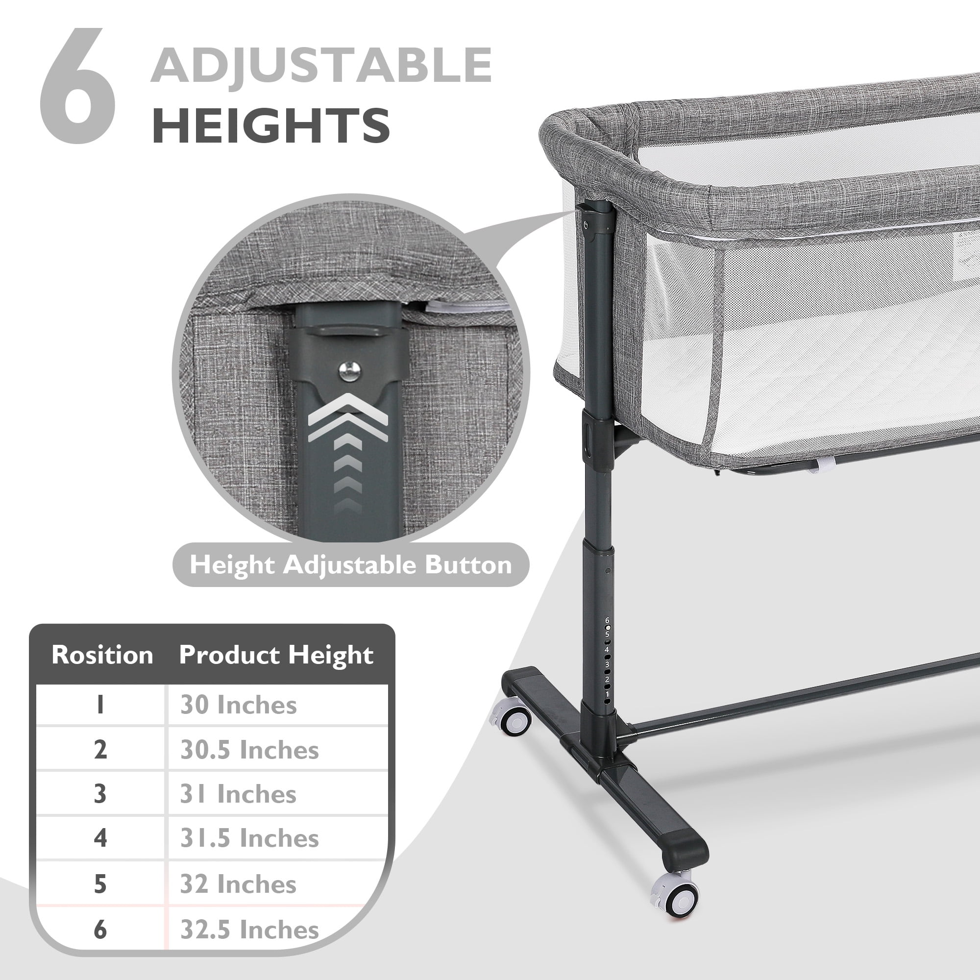 AILEEKISS baby bassinet is made of sturdy iron pipes and skin friendly linen fabric, which has good stability and durability. 6 adjustable heights make this newborn bedside crib can adapt to different heights of beds and sofas. The bassinet sleeping surface incline angle at 7° and meets CPSC standards for baby bassinet. They are under the ten degree cut off. With 360°universal wheels, our unisex bedside sleeper can smoothly travel between different rooms.