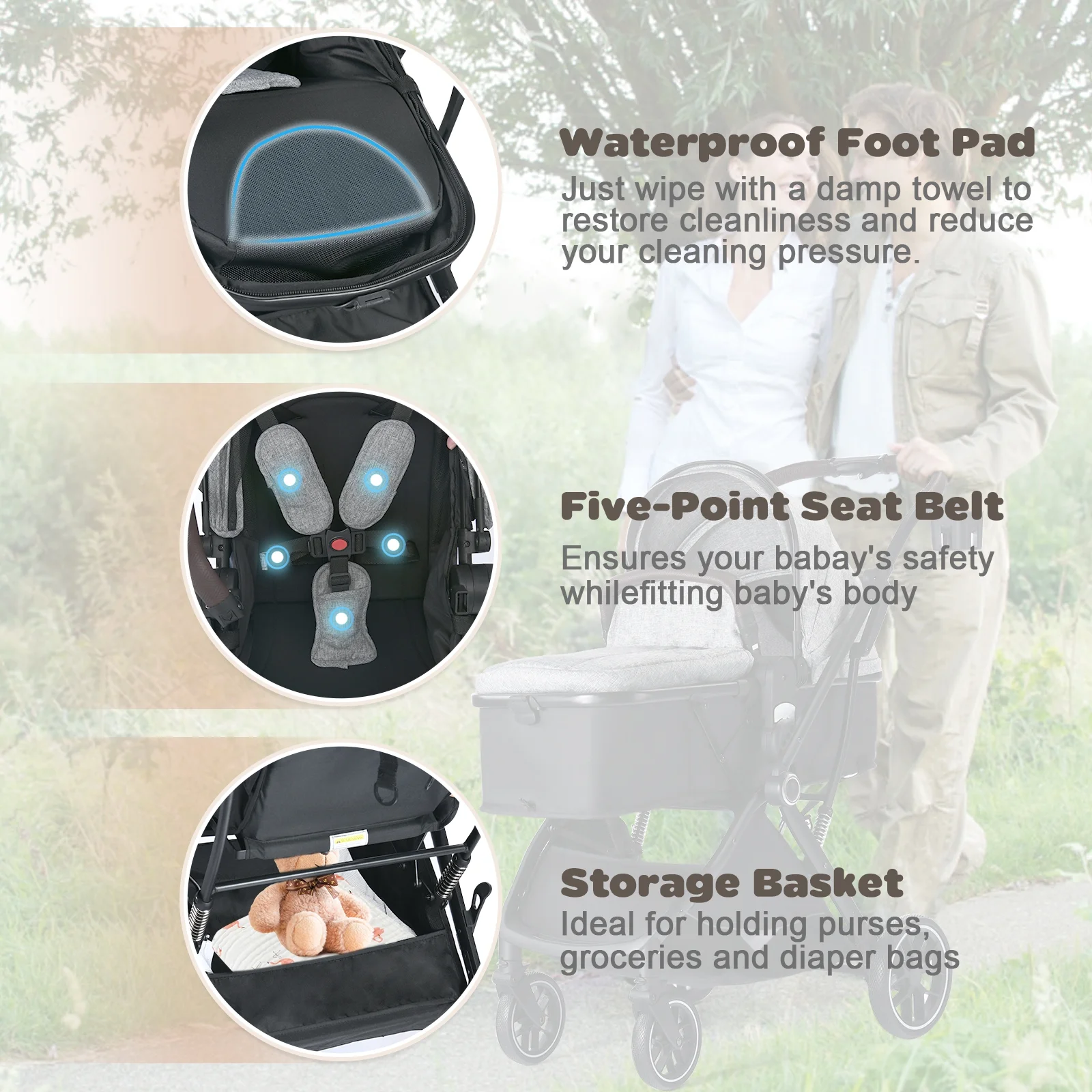 [Convertible to Bassinet Pram] Our landscape baby stroller is designed with a reversible seat, allowing you to easily adjust baby’s position. This flexibility ensures that you can engage with your little one in bassinet pram mode; And let your baby enjoy the outside scenery with free from automobile exhaust pollution in landscape stroller mode. [Quick Folding Design] With a simple press and push, you can effortlessly collapse the toddler pushchair into a compact size, making it incredibly convenient for storage or transport. Meanwhile, artificial leather baby stroller handles increase grip and facilitate sliding effortlessly. [Multifunctional & Flexible Adjustment] The seat of the stroller can be tilted to different positions for lying down and sitting. The sleep surface angle is about 7 degrees, which is comply with the requirements of the bassinet standard. Detachable canopy can be adjust to 3 different positions, which will protect your baby from direct sunlight. Foot cover and seat guardrail can be moved according to your needs. The front wheel can rotate 360 degrees, making it convenient for you to adjust the direction. [Stable & Trusted Construction] Crafted with aluminum materials and featuring a sturdy frame, this baby pram stroller offers a smooth and comfortable ride for your baby. The spring suspension system ensures smooth maneuverability over various terrains, making it suitable for urban walks or outdoor adventures. Also, the safety wrist strap to prevent it from slipping away. [Spacious & Storage-Friendly] Say goodbye to cramped spaces! This Baby Pushchair offers ample room for your baby to stretch out. The breathable peek-a-boo mesh windows to keep the space fresh and observe baby’s condition at any time. It also features a generous storage basket underneath, providing convenient space for all your essential items during all-day outings. Additional cup holder to keep your drinks or feeding-bottle. 1 x Baby stroller 1 x Cup holder 1 x Foot cover 1 x Front armrest 1 x User Manual