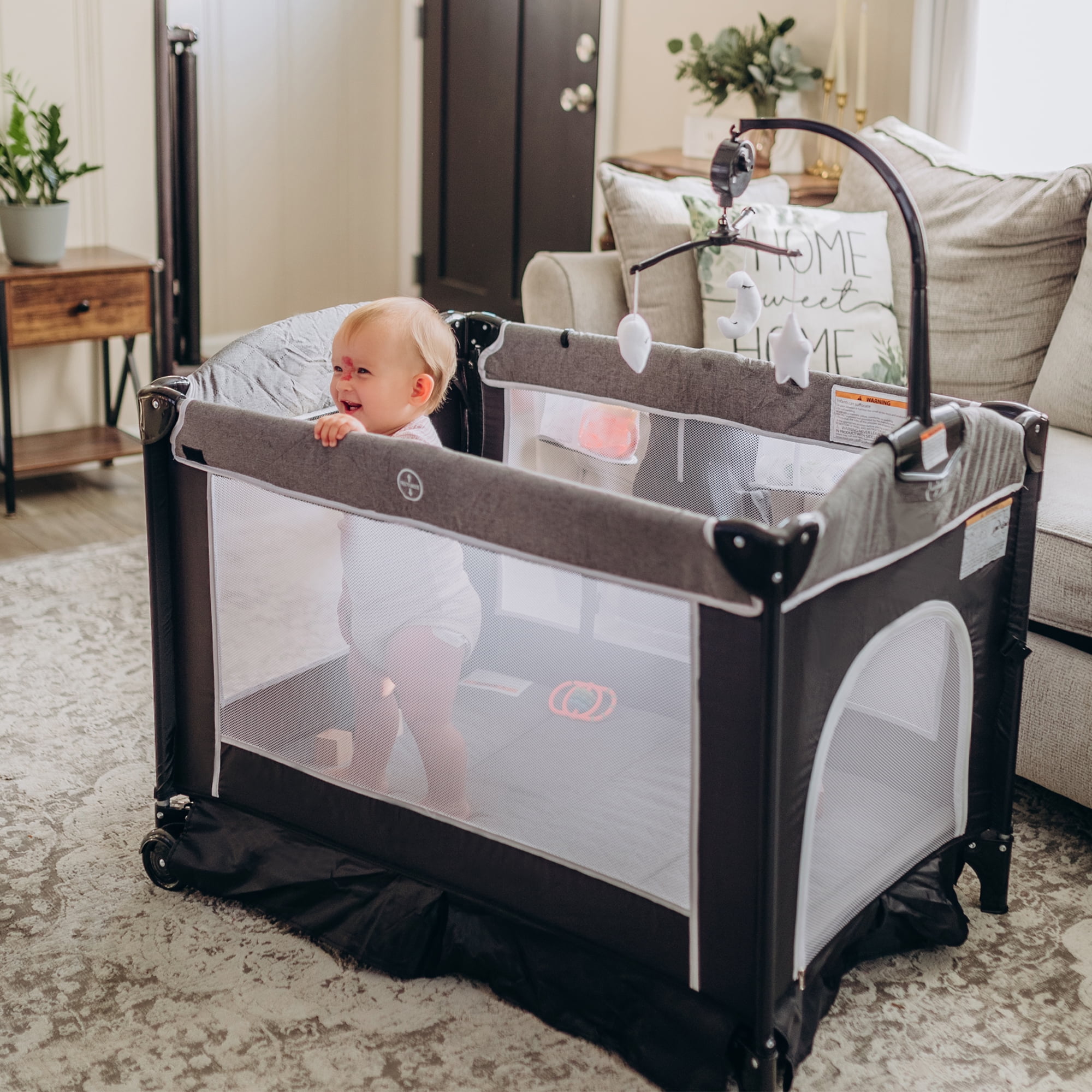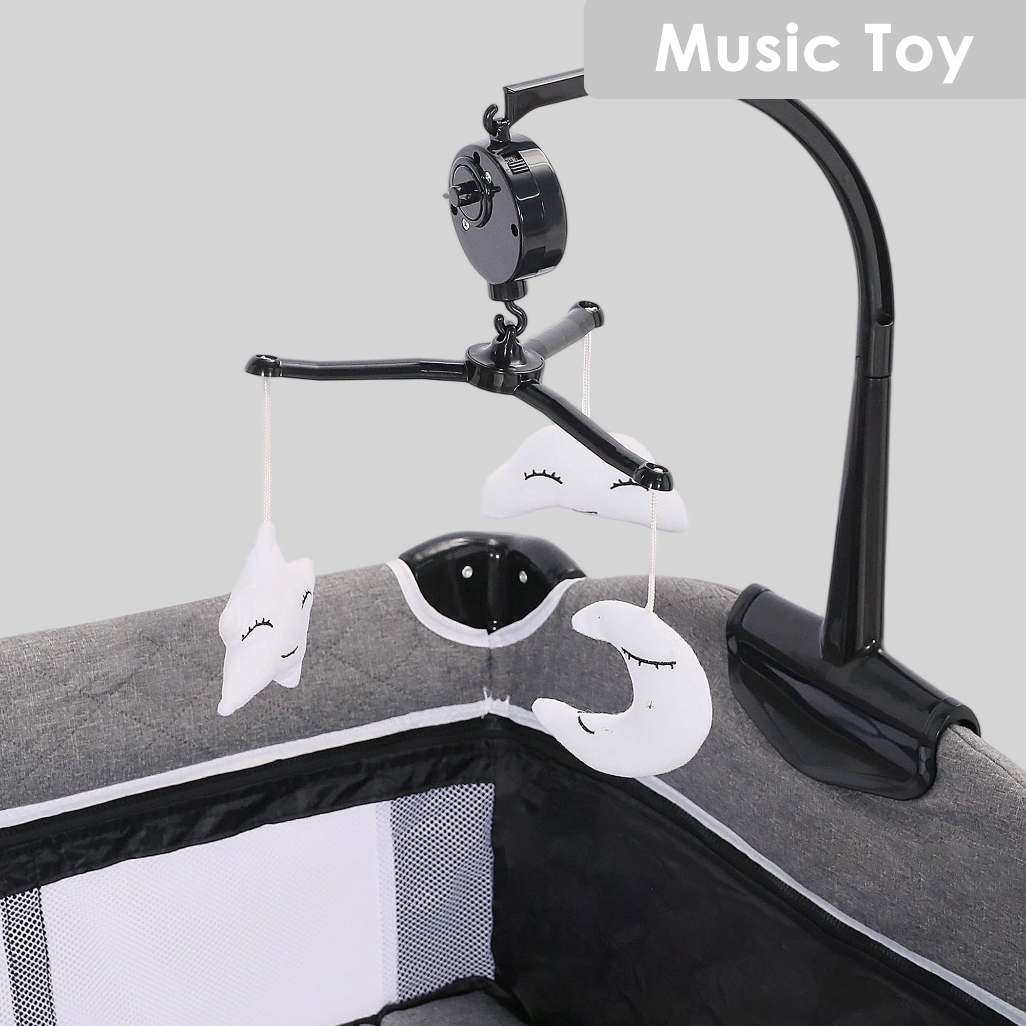 Four-side mesh design for air circulation and easy observation of the baby Unisex infant bassinet provides more room as the child grows older Diaper organizer for storing baby’s daily necessities Equipped with seat belts on the diaper table Changing table for easy diaper changes without bending over AILEEKISS playards suit for climbing and walking for toddlers Complies with bassinet standard requirements The sleeping surface incline angle at 7° and are under the ten degree cut off Smooth and quiet wheels that won’t damage the floor One-click lock for standing position Great choice for baby showers, birthday gifts or Christmas Hanging toys with natural and sleep music for baby entertainment No tools required for quick set-up and breakdown Includes carry bag for family travel or visiting friends Assembled product weight only 26 lbs for easy carrying Latching and locking design for safety use Thick cloth wrap and crash-proof corners to prevent accidental collisions Removable and foldable mattress for easy cleaning Comfortable and breathable Oxford fabric