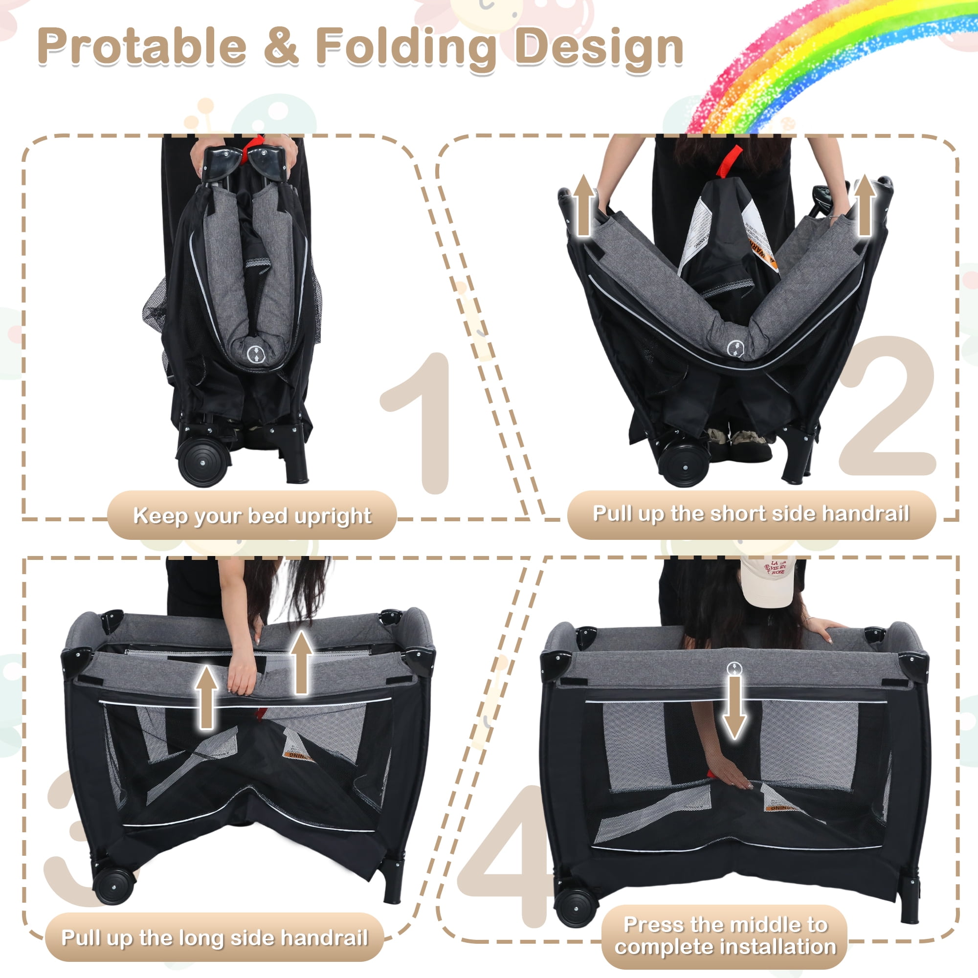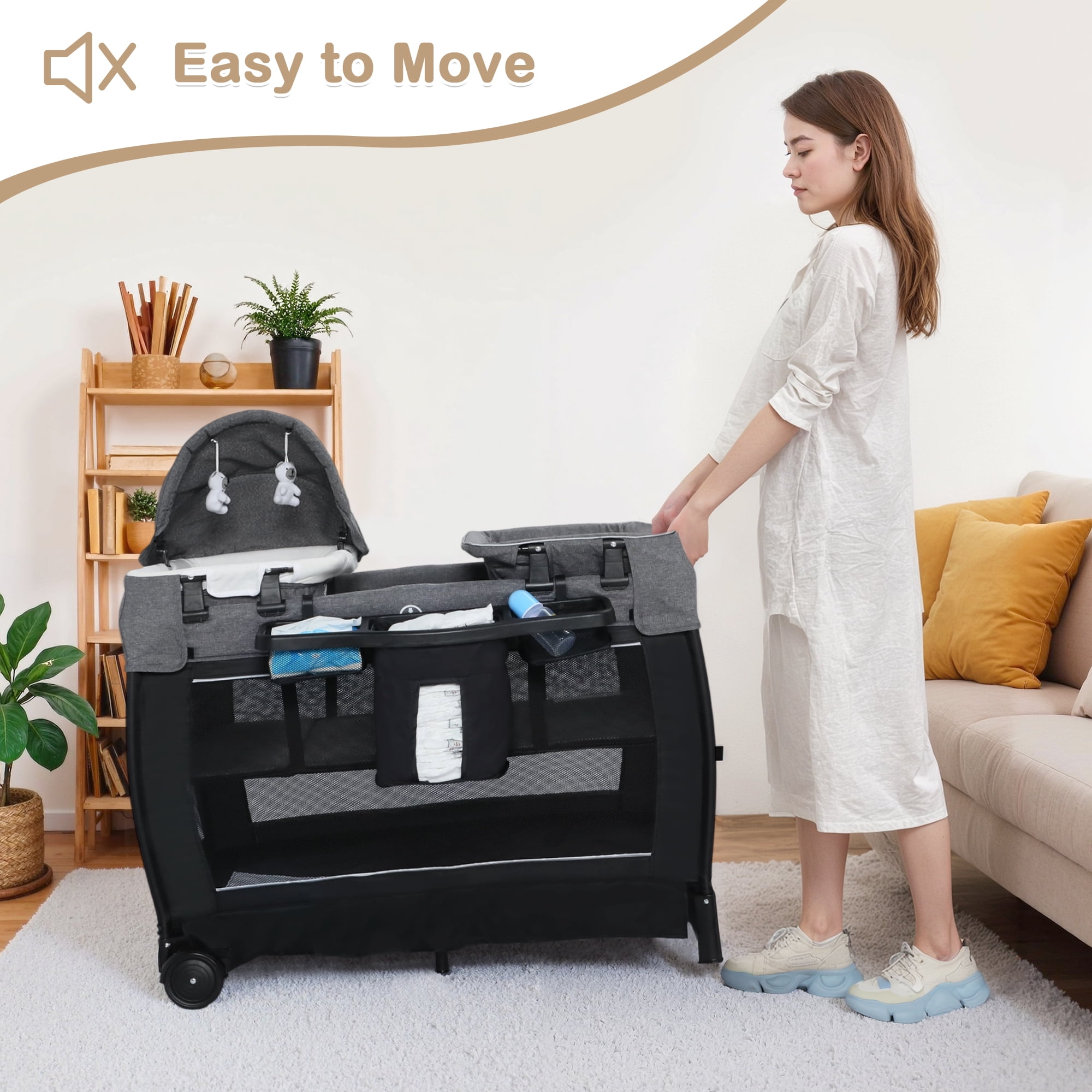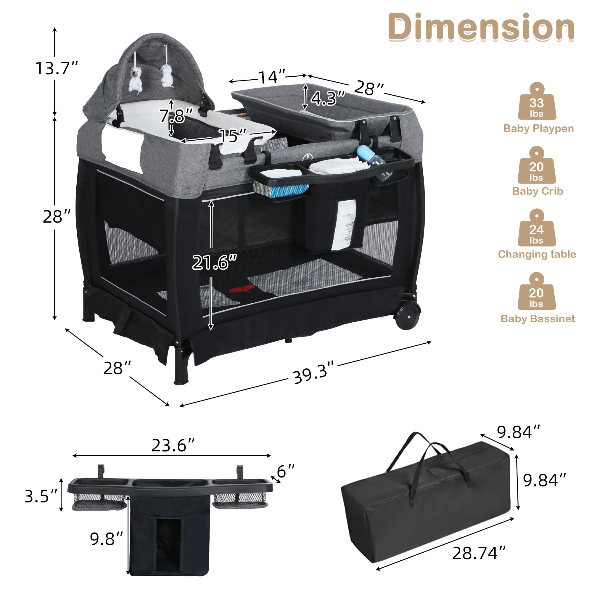 Four-side mesh design for air circulation and easy observation of the baby Comfortable and breathable Oxford and cationic linen fabric to protect delicate skin Changing table for easy diaper changes without bending over Equipped with seat belts on the diaper table for safety Unisex infant bassinet provides more room as the child grows older Playard for climbing and walking for toddlers The sleeping surface incline angle at 7° and are under the ten degree cut off AILEEKISS nursery center complies with bassinet standard requirements Hanging toys with natural and sleep music for baby entertainment Additional large diaper storage rack for storing baby’s daily necessities Thick cloth wrap and crash-proof corners to prevent accidental collisions Great choice for baby showers, birthday gifts or Christmas Removable and foldable mattress for easy cleaning One-click lock for standing position Latching and locking design for safety use No tools required for quick set-up and breakdown Assembled product weight is only 27.6 lbs for easy carrying Includes carry bag for family travel or visiting friends Smooth and quiet wheels won’t damage the floor