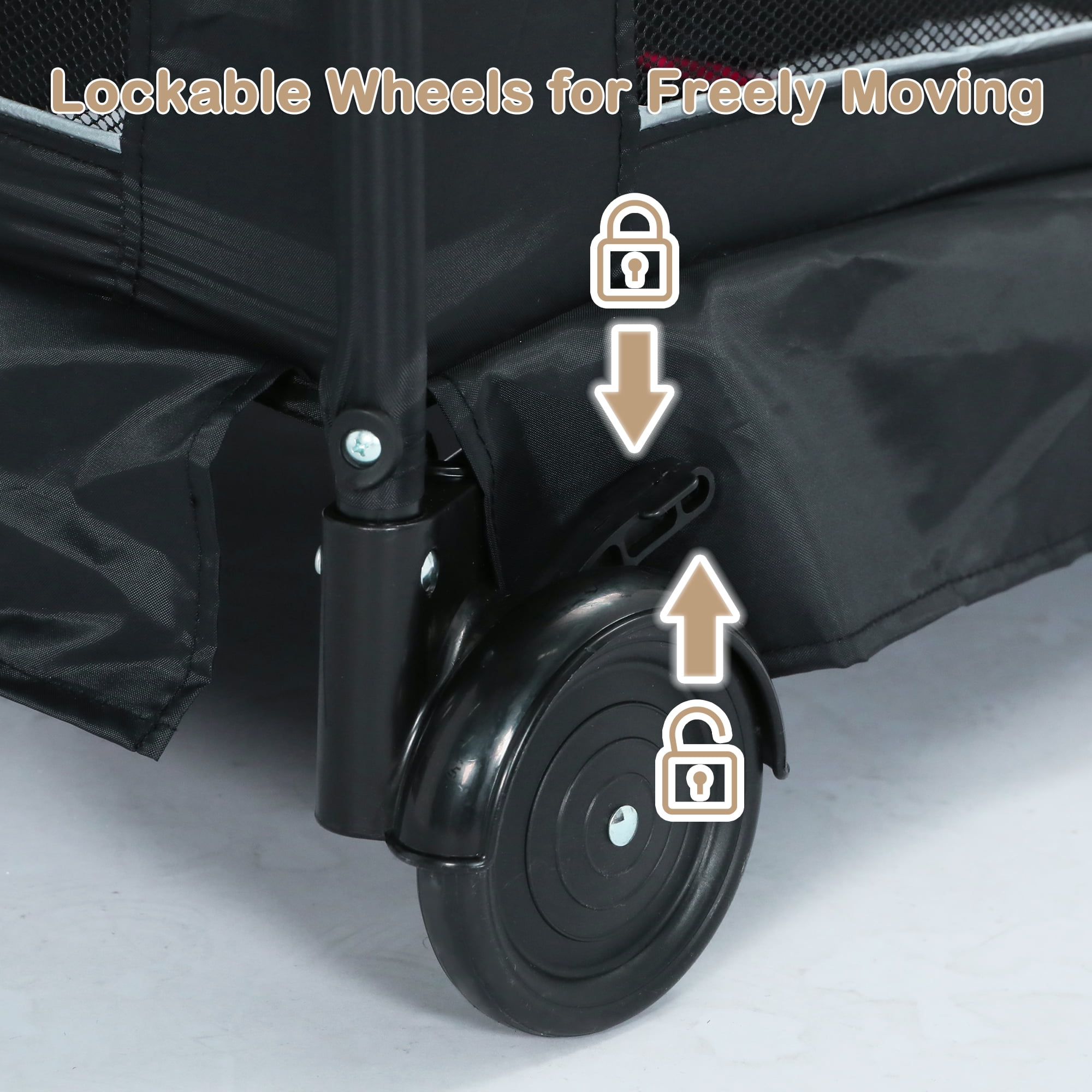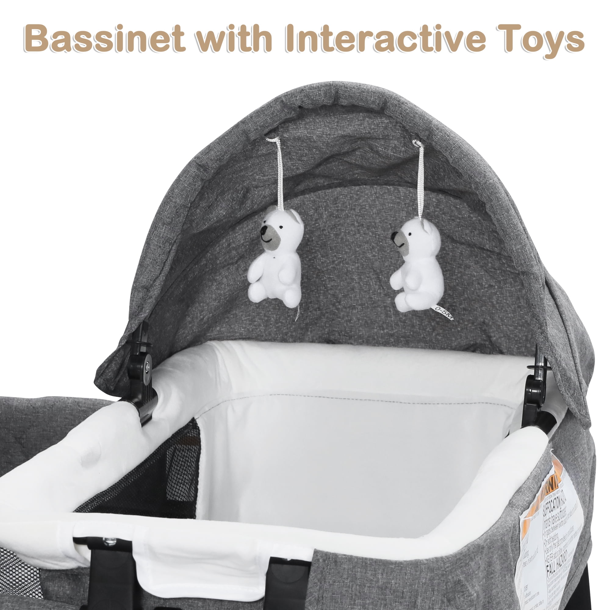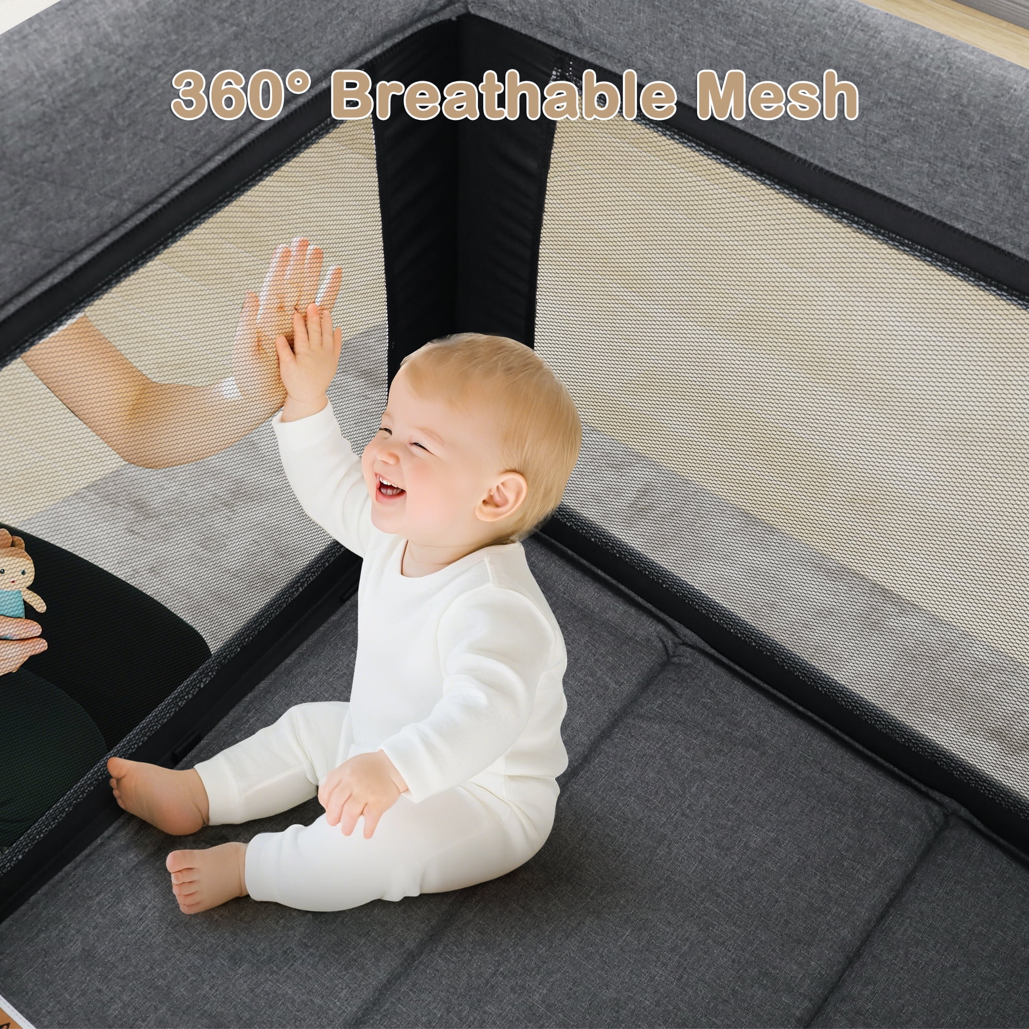 Four-side mesh design for air circulation and easy observation of the baby Comfortable and breathable Oxford and cationic linen fabric to protect delicate skin Changing table for easy diaper changes without bending over Equipped with seat belts on the diaper table for safety Unisex infant bassinet provides more room as the child grows older Playard for climbing and walking for toddlers The sleeping surface incline angle at 7° and are under the ten degree cut off AILEEKISS nursery center complies with bassinet standard requirements Hanging toys with natural and sleep music for baby entertainment Additional large diaper storage rack for storing baby’s daily necessities Thick cloth wrap and crash-proof corners to prevent accidental collisions Great choice for baby showers, birthday gifts or Christmas Removable and foldable mattress for easy cleaning One-click lock for standing position Latching and locking design for safety use No tools required for quick set-up and breakdown Assembled product weight is only 27.6 lbs for easy carrying Includes carry bag for family travel or visiting friends Smooth and quiet wheels won’t damage the floor