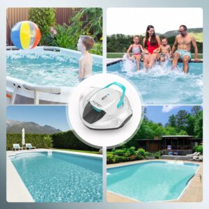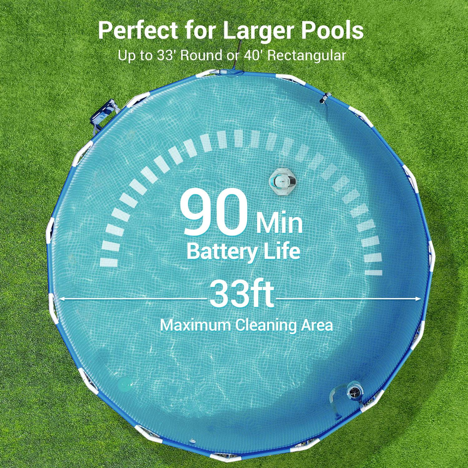 – No more unsightly tangles and much less hassle with this cordless robotic cleaner, bringing greater convenience. Besides, with ETL certified, the cordless robotic pool vacuum cleans ABOVE GROUND pools (FOR FLAT POOL FLOOR with No Slopes) up to 40ftx20ft rectangular or 33ft diameter round with never a worry of safety.
