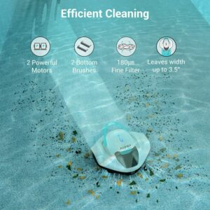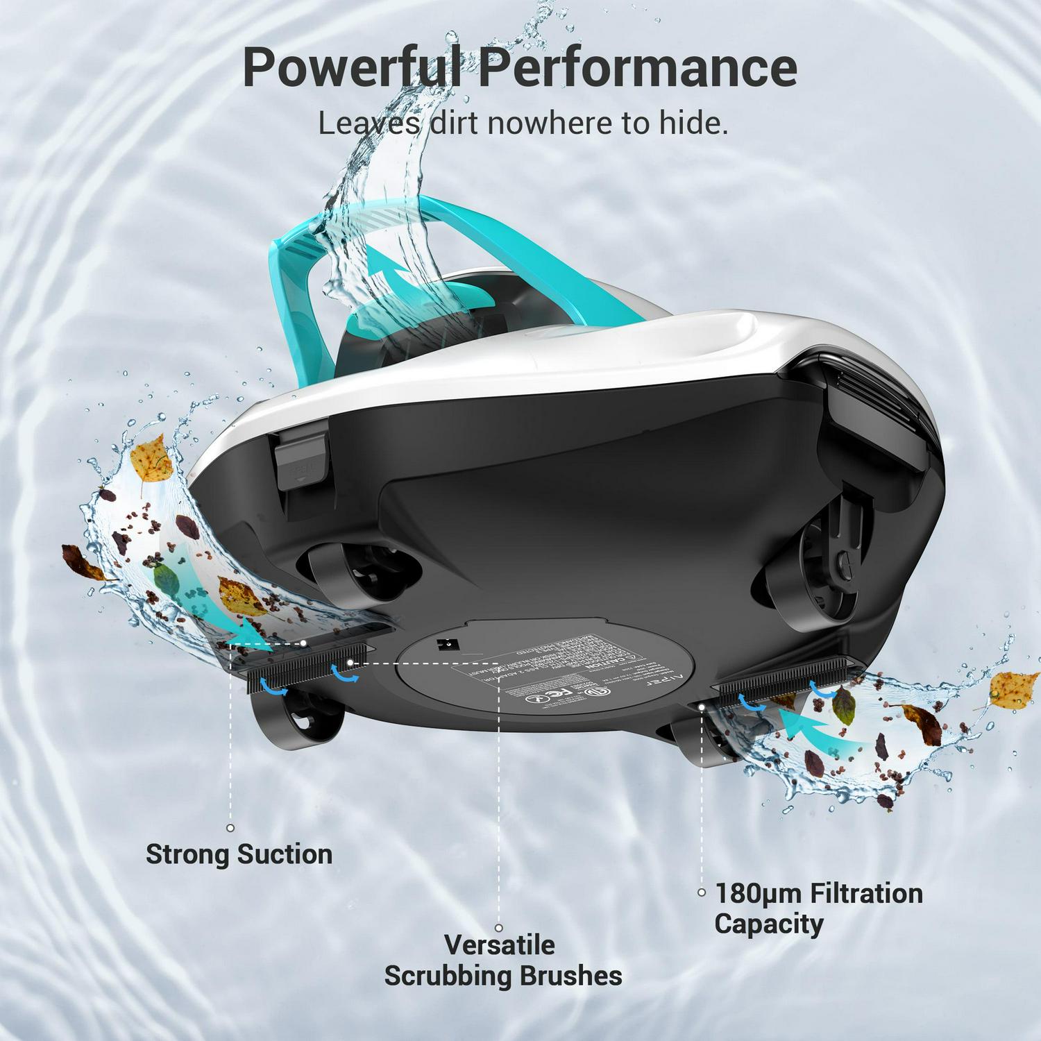 Say goodbye, pool boy! Because cleaning your pool has never been simpler. The newly upgraded Aiper Seagull 800 cordless robotic pool cleaner is the perfect solution for your flat-floored pools up to rectangular 40x20ft or round 33ft. Completely cordless, this hassle-free robotic pool cleaner features dual-drive motors, 90-minute battery life, and the robotic pool vacuum is lightweight and is activated with just one click. When the robotic pool cleaner has completed its cleaning cycle or its battery is low, it will automatically stop near your pool’s wall for easy retrieval.