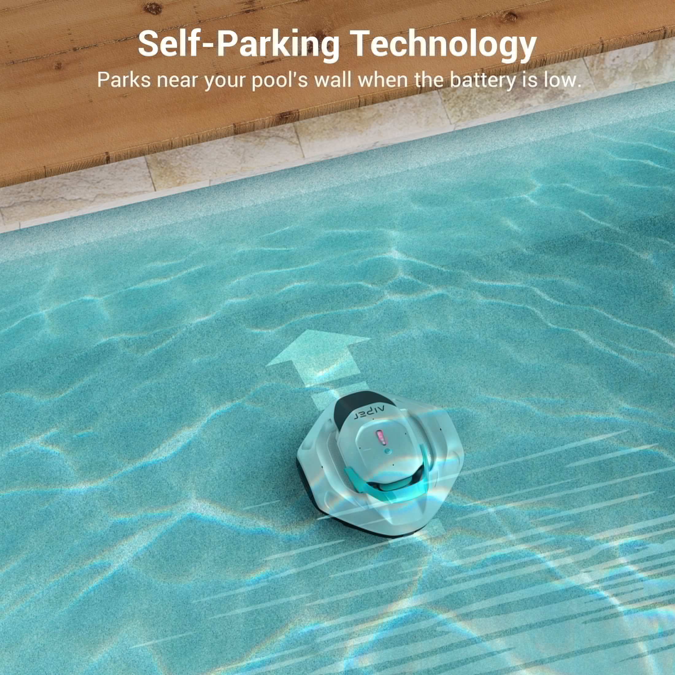 – It automatically parks near a wall of your pool after completing the cleaning cycle or battery is low.
