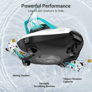 – Smaller and more hydrodynamic than previous models to decrease resistance, this robotic pool cleaner picks up fine leaves, sands, dirt and other debris with ease. It removes grime and sediment so that you do not have to get in the water for cleaning.