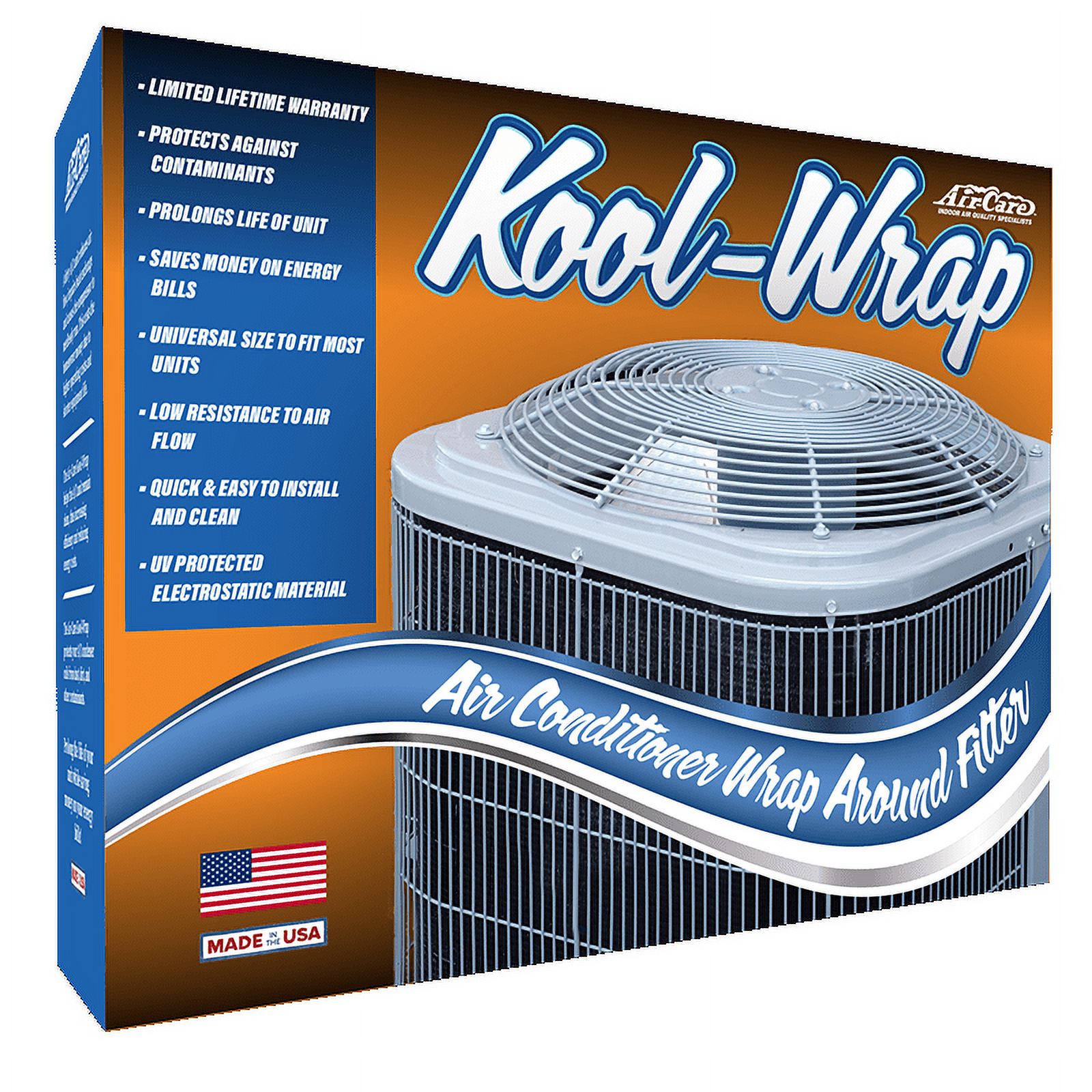 Air-Care Kool-Wrap Universal Air Condenser Filter Universal fit for all outdoor air conditioning units UV protected heavy duty material Cut-to-fit design that simply wraps around unit and secures with the use of 3 magnets (included) Easy to clean with water, or just brush off debris with a broom 90 Day manufacturer’s warranty