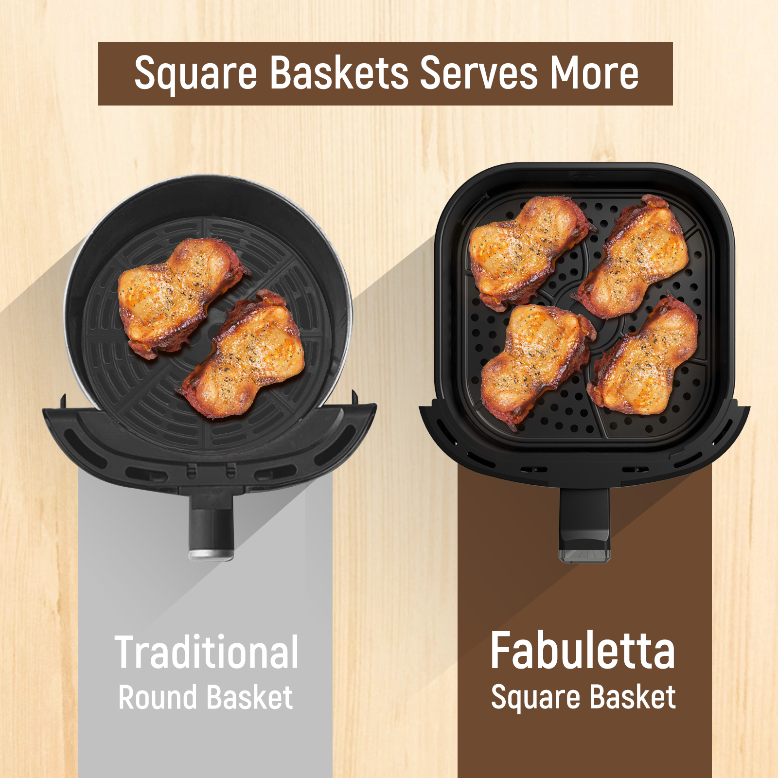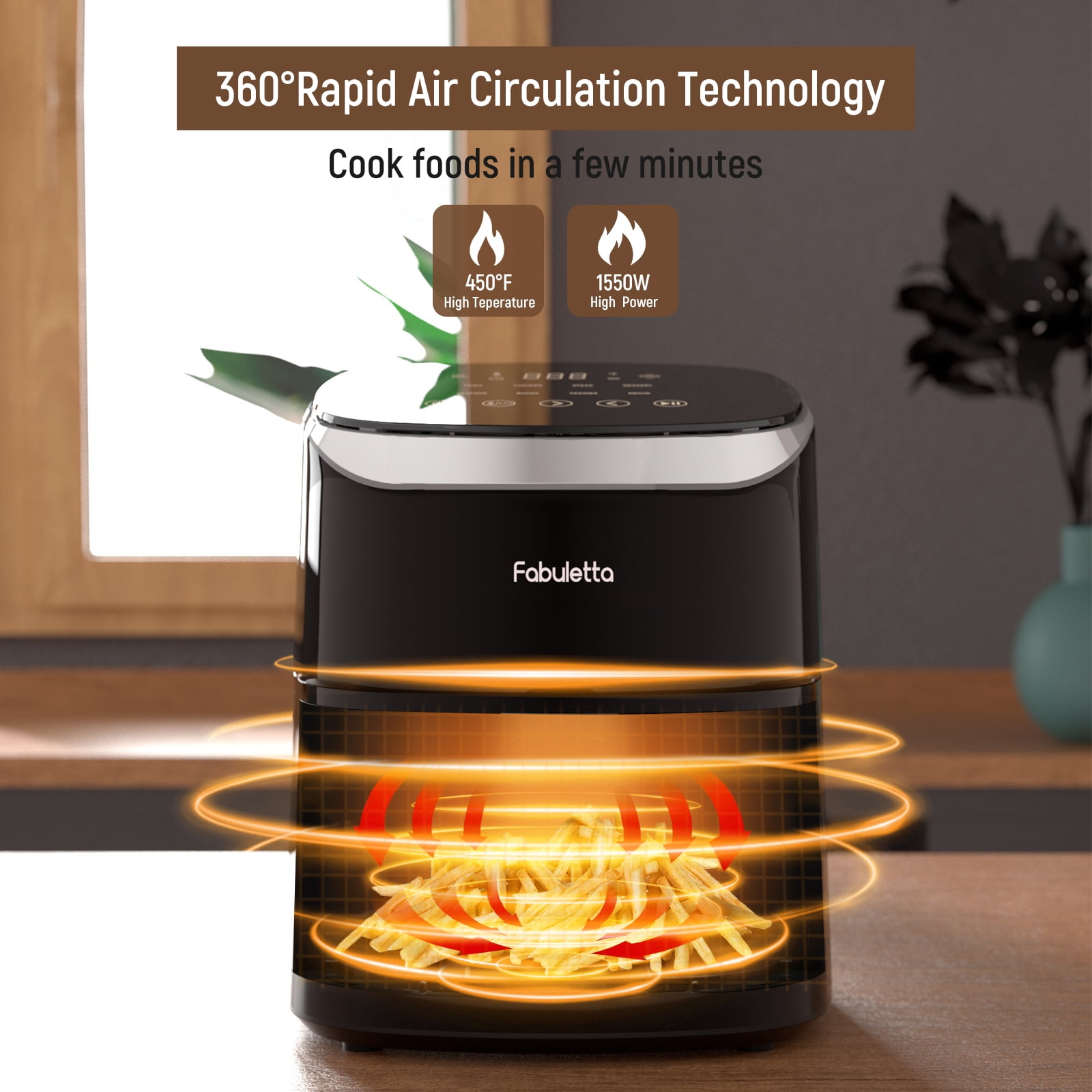Fabuletta 4.2QT home air fyer equips with 9-in-1 cooking functions, which is perfect choice for 2-4 people family. It can help you enjoy crunchy, even and tender food quickly with up to 85% less fat every time. Also,140℉-450℉ wide temperature range allows you to cook various foods for breakfast, desserts and appetizers.We offer the quality, convenience and versatility your expectation from Fabuletta.