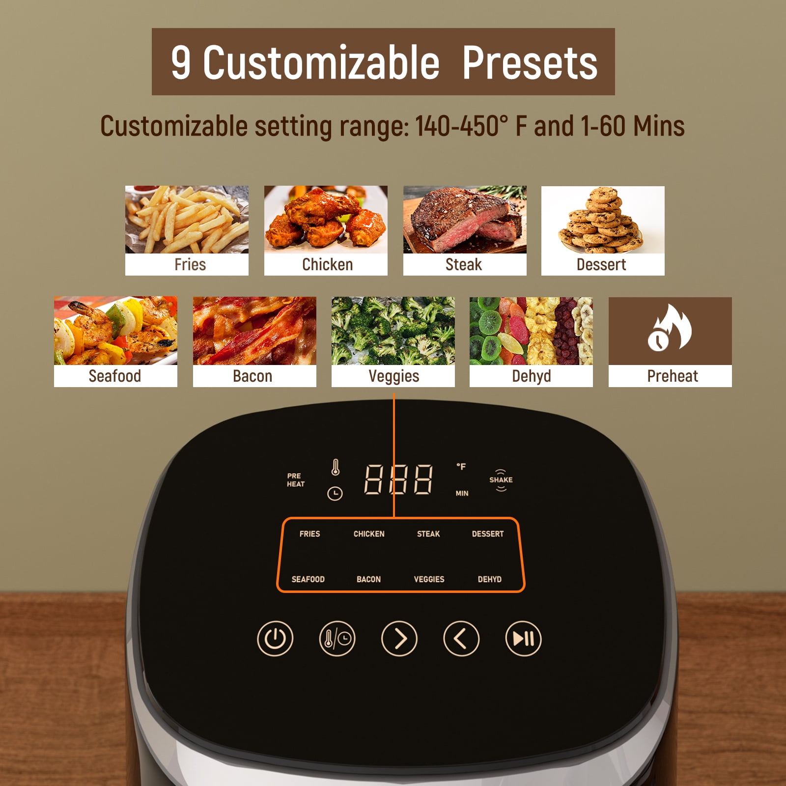 Chef-inspired Recipes and 9 Preset Functions Make Beginners Become Master Chef! We Devoted to Develop Advanced Technology to Upgrade Your Cooking Experience! Compact Size, Large Basket! ?? 9 Easy Programs: 9 programs set according to professional chef recipes offer you more options. In addition, adjustable times (1 to 60 minutes) and temperatures (140℉-450℉) allow you to customize your dishes. Preheat and shake alerts for even heating of your food. ?? 85% Less Oil: Our air fryer features 360° rapid air circulation technology and industry-leading temperature cooking up to 230°C, making it 30% more efficient than ever before to quickly enjoy the same crispy texture as traditional frying, but with 85% less fat. ??Easy to Taste Delicious Food: We use even crisp technology that uses air flow to achieve a golden crisp finish. The device also features a unique juice barrier technology that ensures your food stays fresh inside. As a result, you’ll enjoy perfect cooking results every time. ?? Easy to Clean: The removable non-stick pan is made of food-safe materials PFOA and BPA free and dishwasher safe. Non-slip feet ensure safe and stable cooking, and the square design basket offers more space and flexibility when cooking than the round design. Unique memory feature allows you to pull out the fryer at any time, view your food and continue cooking. ?? A Perfect Gift: ergonomic design for more comfortable use. With a large 4.2QT capacity for 10 wings or 1.5 pounds of fries, this compact hot air fryer is perfect for families of 2 to 4 people. We offer a 24-month warranty and lifetime customer service, so you can rest assured that your questions and concerns will be addressed accordingly.
