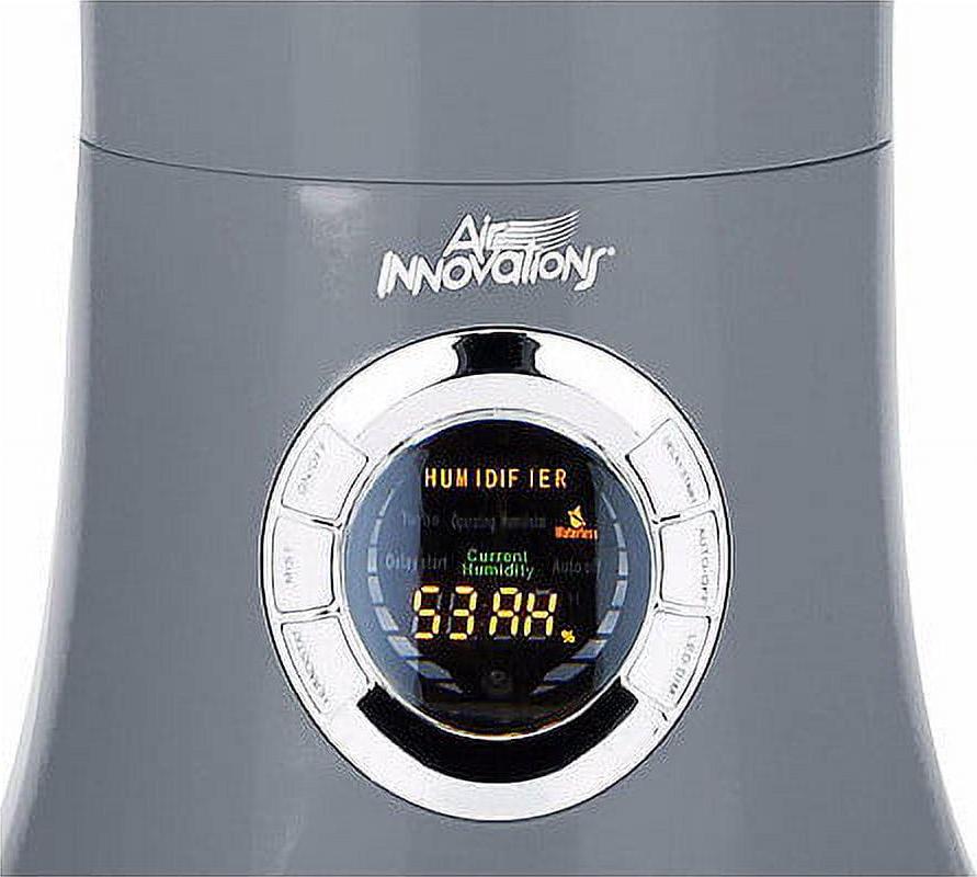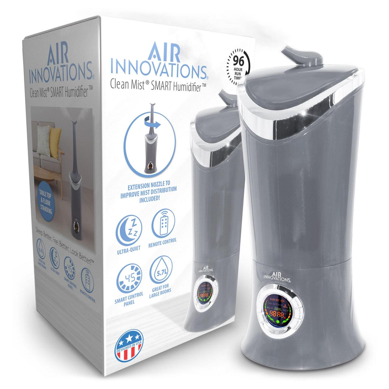 Breathe easier with the Air Innovations Ultrasonic Cool Mist Digital Humidifier Model 701BA. This fully-featured SMART Humidifier includes a remote control and a huge 1.7-gallon tank that lets the unit run up to 96 hours when set to low, that s 12 nights of sleep before you must refill it! The room humidifier is completely silent and safe to the touch so you and your family get a better night s sleep, yet it s powerful enough to add humidity to large rooms up to 600 sq. ft. It also utilizes the soothing aspect of aromatherapy. The humidifier features a fully programmable timer to turn the unit on and off when you want, top and bottom handles for easy carrying, an extra-wide opening for easy filling, and an auto out-of-water shut off when it runs out of water. This cool-mist humidifier will help kids and babies because the extra humidity will relieve dry eyes, rehydrate skin, help scratchy throats, and will help reduce snoring for better sleeping. Unlike other branded humidifiers, this humidifier model can be used on a tabletop or the floor, thanks to its 15-inch extension nozzle. It also protects and rehydrates furniture, wood cabinets & floors, and furniture. Get ready for clean safe breathable air in the comfort of your home with the Air Innovations Ultrasonic Cool Mist Digital Humidifier Model 701BA.