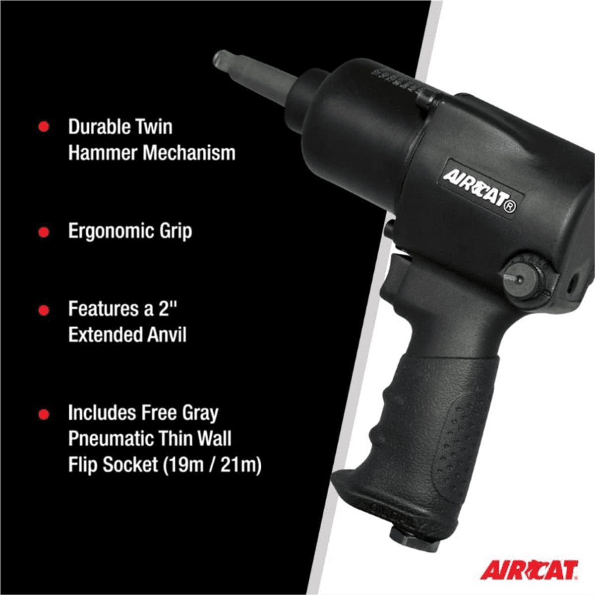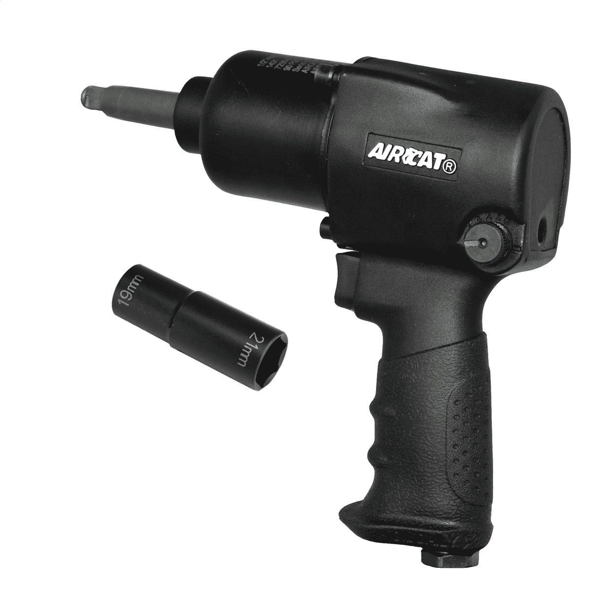 The Aircat 1431-2 is a 1/2″ aluminum pneumatic impact wrench with a 2″ extended anvil designed for passenger car and pick up Truck Tire applications. Included is a grey pneumatic flip socket. It has 800 ft-lbs of torque at 9000 RPM creating 1600 impacts per minute. The 1431-2 carries a 2 year warranty which is twice the industry average and a patented comfort grip for the operator. Other Specs as follows – average air consumption 8 CFM, air inlet is 1/2″ NPT, recommended air hose 3/8″, weighs 6 lbs. Designed to run at 90-100 PSI.