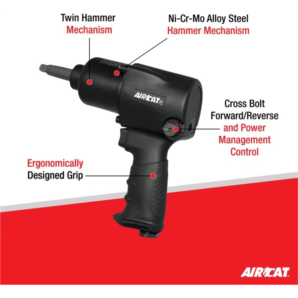 800 ft-lb Maximum torque Brushed aluminum housing Hard hitting twin hammer mechanism Triple heat treated Ni-Cr-Mo alloy steel hammer mechanism parts Ergonomically designed grip for comfort