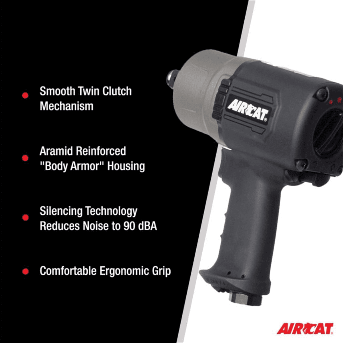 Power and Performance: 1,400 ft-lbs of maximum torque; 1,600 ft-lbs loosening torque Twin Hammer: Refined design increases blow frequency and efficiency Buffers: Molded-in buffers protect the tool from side impact Impact Wrench: With ergonomic handle for the user’s ultimate comfort AIRCAT Line: The most significant advances in the performance of pneumatic power tools