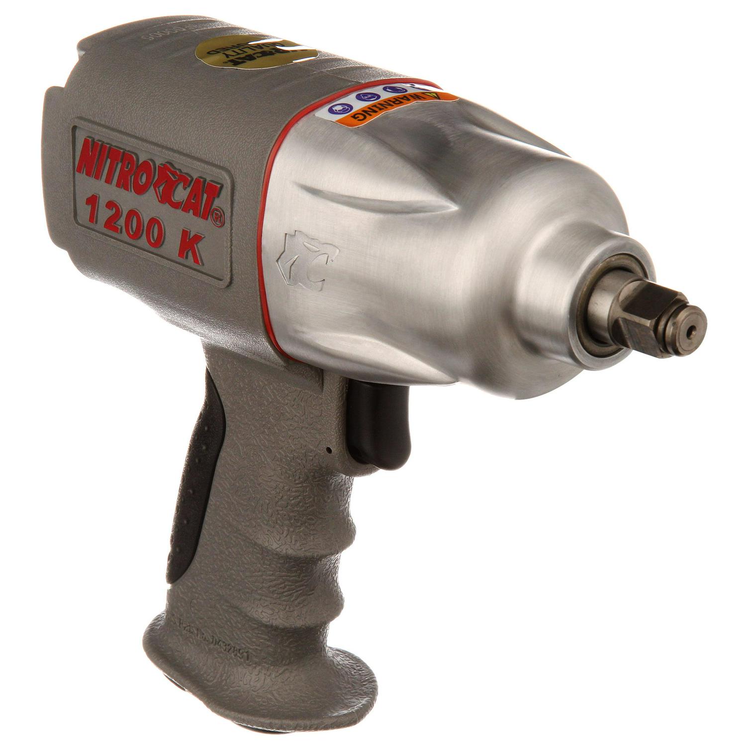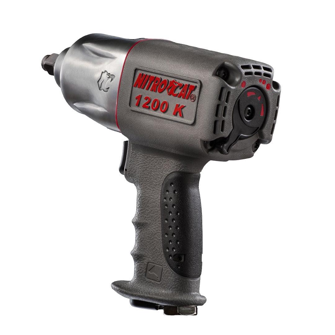 It’s time to modernize your toolkit. The AIRCAT 1200-K 1/2-inch Nitrocat Composite twin-clutch Impact Wrench has 1295 foot-pounds of torque, and the reinforced composite body outperforms anything in its class. It is used by many NHRA Top Fuel race teams. The Nitrocat 1200-K Impact Wrench uses a smooth and powerful twin-clutch hammer design, resulting in harder hitting impacts than a typical twin hammer design. This design makes this wrench perfect for high-torque jobs on heavy-duty trucks and frames. The 1200-K churns out 1,295 foot-pounds of torque, which has made it a favorite of many NHRA Top Fuel race teams. We make top-of-the-line power tools perfect for any handyman or construction professional. This power tool delivers 900 foot-pounds maximum torque and 1,295 foot-pounds of loosening torque. The Nitrocat 1200-K is a no-nonsense, hard-hitting 1/2-inch impact wrench that outperforms anything in its class! It has a powerful, smooth twin-clutch mechanism, durable reinforced composite housing, a patented, ergonomically designed handle, a patented quiet tuned exhaust (86 dBA), and a patented easy-operation flip lever forward and reverse. The twin-clutch is better suited for heavy-duty projects (framework, medium to heavy-duty trucks, etc.). The AIRCAT line represents the most significant advances in the performance of pneumatic power tools in nearly 30 years. Founded in 1998, our tool line has a substantially reduced level of noise while retaining more power and torque. AIRCAT also incorporates a patented ergonomically engineered handle design to relieve stress and fatigue on the operator s hands, wrists, and arms. AIRCAT has the patented tuned exhaust muffler technology in most tools, which allows discharged air to pass without developing back pressure, thus retaining more power, while significantly reducing noise. From the Manufacturer The AIRCAT 1200-K is a no non-sense, hard hitting 1/2-inch impact wrench that outperforms anything in its class! Used by many NHRA Top Fuel Race teams. All the power, half the noise! The AIRCAT tool line has a substantially reduced level of noise while retaining more power and torque. Our tools have been tested and shown to operate at 82-86 dBa (decibels), far below the OSHA guidelines. This feature benefits not only the mechanic but also the overall business. The patented tuned exhaust muffler technology, in all the tools, allows discharged air to pass without developing back pressure, thus retaining more power, while significantly reducing noise. AIRCAT has innovated through-the-handle exhaust design, which incorporates its revolutionary worldwide patented internal muffler/filter. The benefits include reduced hazards from breathing exhausted air particulates, the elimination of blow-by into the operators eyes and lungs as well as reduce noise. AIRCAT also incorporates a patented ergonomically engineered handle design to relieve stress and fatigue on the operators hands, wrists and arms. The patented AIRCAT handle offers better overall distribution of weight for a balanced tool and provides a unique grip that makes it easier to use for prolonged periods of time. AIRCAT offers a full line of pneumatic tools, including impact wrenches, air ratchets, reversible drills, die grinders, and cut-off tools. Established 1998 in Spokane, Washington AIRCAT is a line of high quality pneumatic hand tools that incorporates the unique and multi-patented exhaust muffler/filter technology. The AIRCAT tool line has a substantially reduced level of noise while retaining more power and torque. The AIRCAT impact wrench line offers both twin hammer and twin clutch mechanisms.