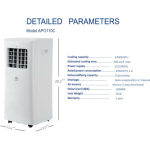– Max Cooling in Compact Design: 10,000 BTU (5,000 BTU DOE) portable air conditioner cools rooms up to 300 square feet. Maximum power keeps you comfortable and compact, space-saving body design saves you room.