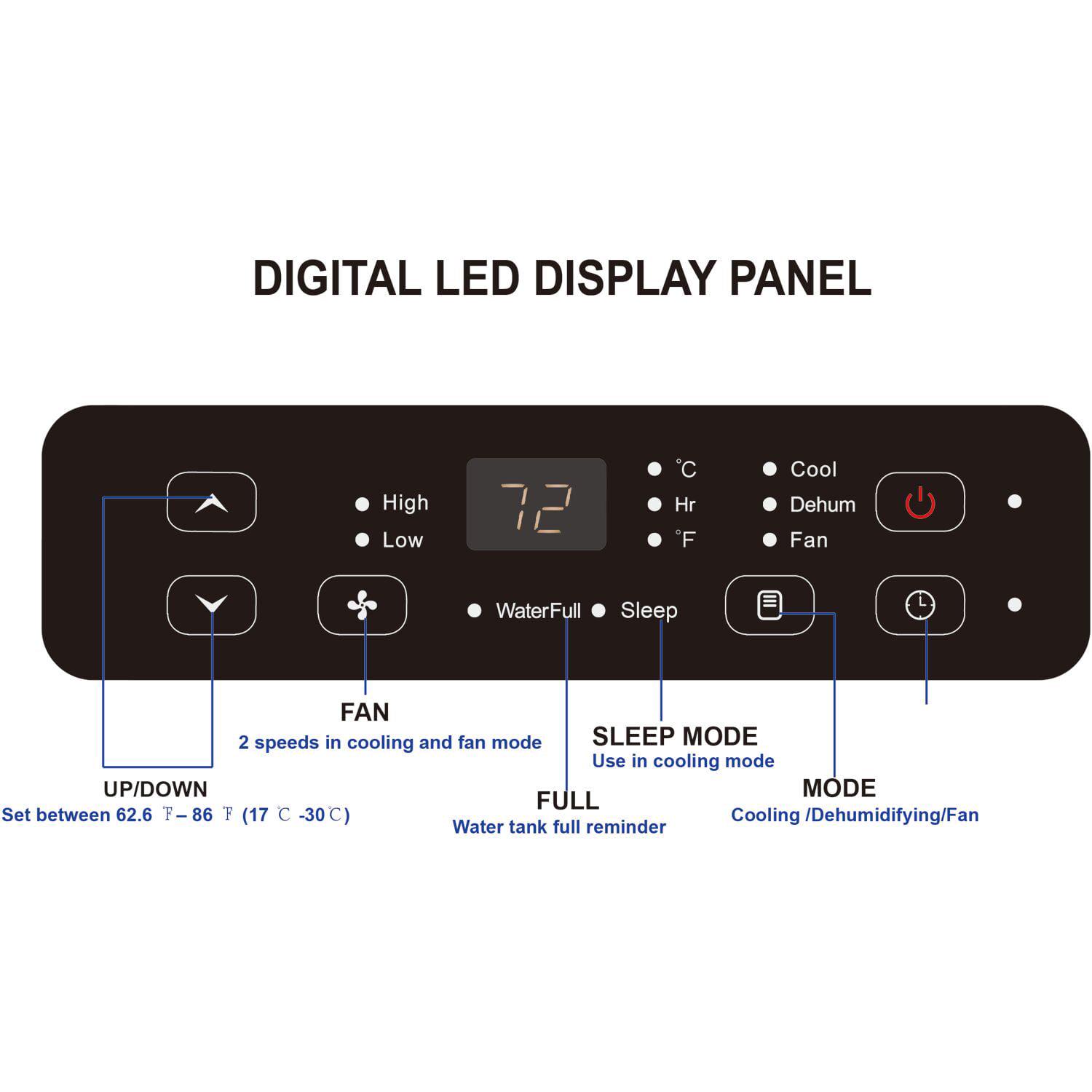 – Digital thermostat control range: 62.6F 86F (17C -30C)