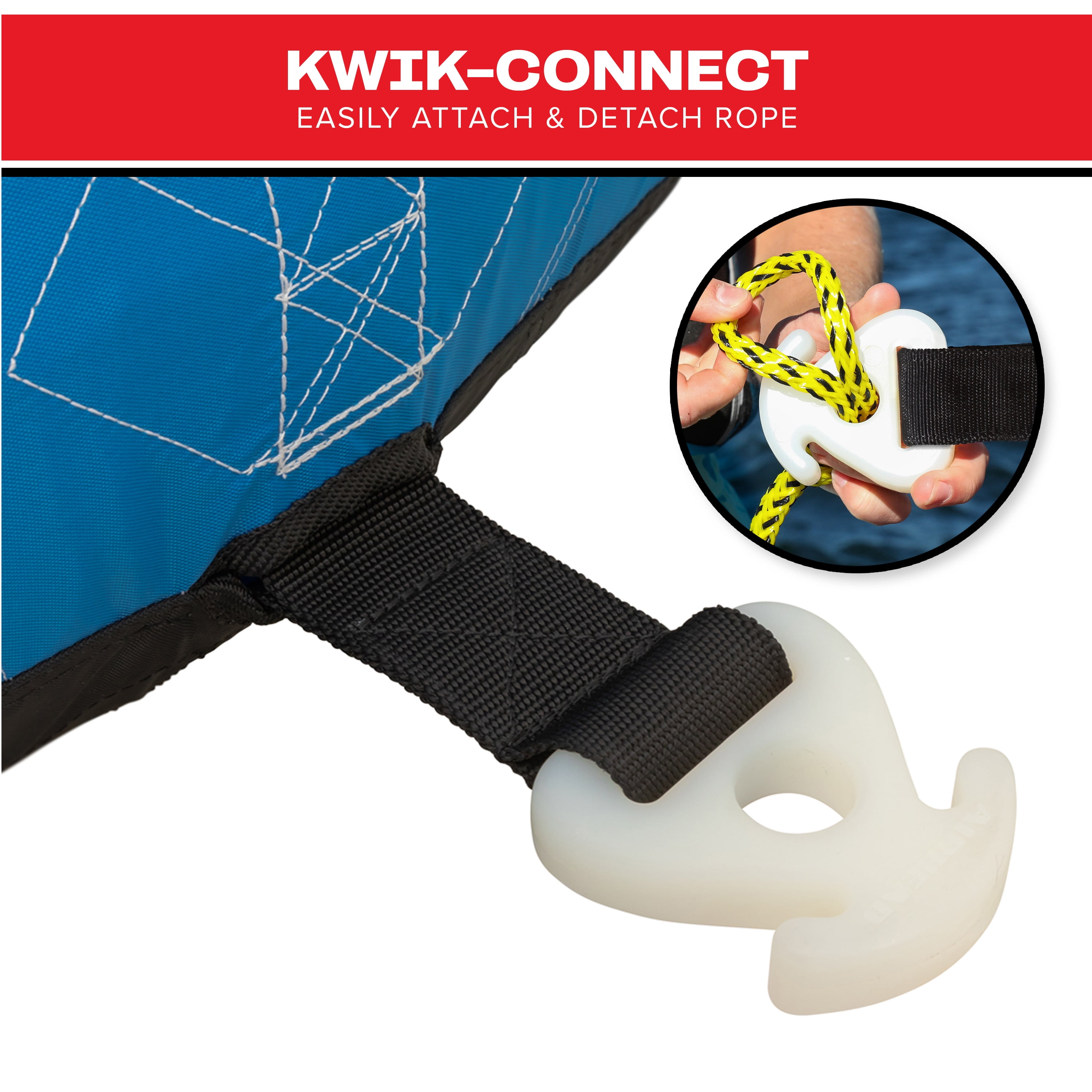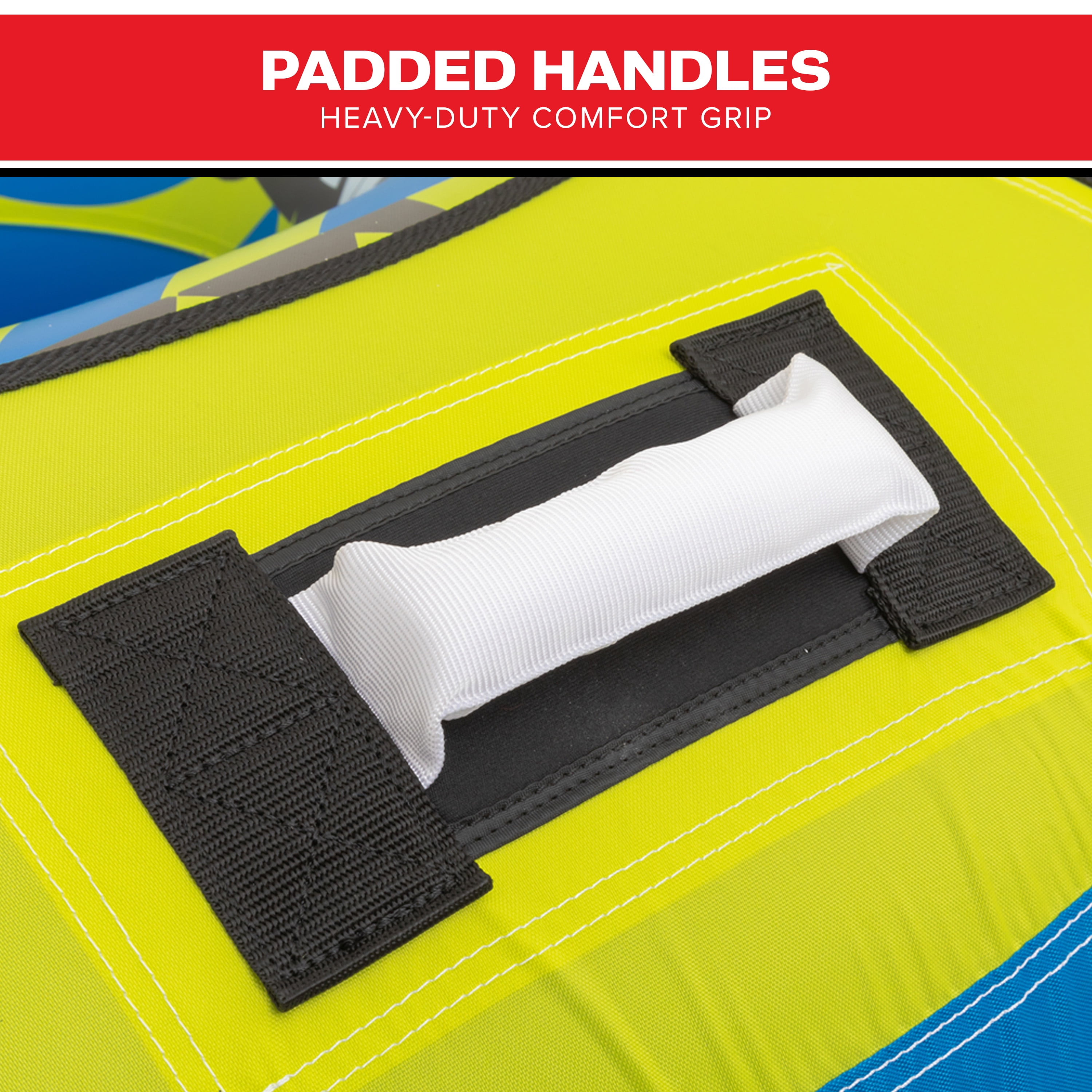 Comfy foam pads that make your ride smooth and enjoyable Kwik-Connect: Our one-of-a-kind tow system lets you quickly and easily connect your tube to the rope Part of the tube is covered with our double stitched nylon for comfort and durability Self-draining floor that keeps riders upright Patented Speed Safety Valve for quick and easy inflating and deflating Tear resistant Max capacity: 1 Person Assembled Product Dimensions: 54.00 x 54.00 x 12.00 Inches