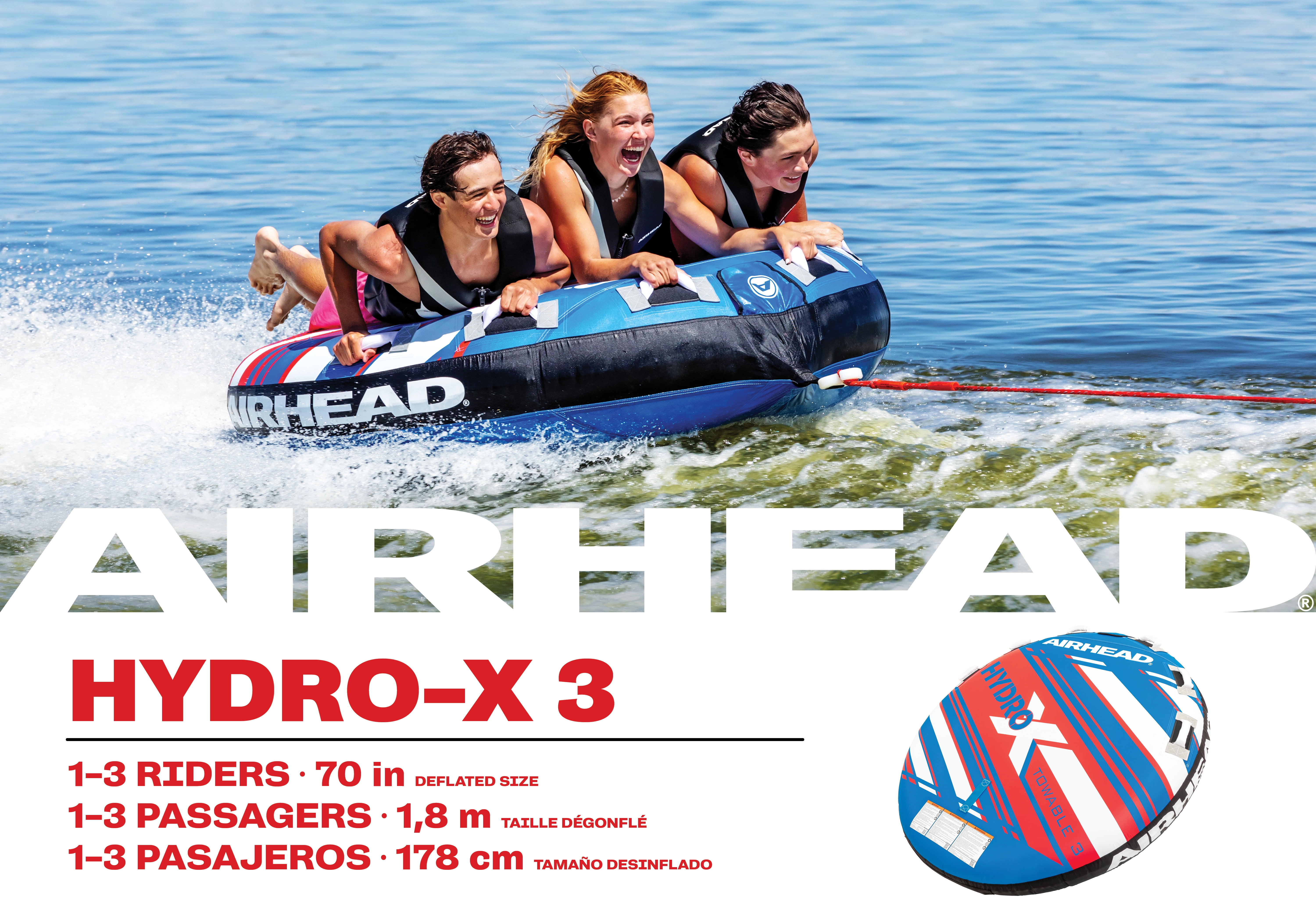 The Airhead Hydro-X 3 person towable tube is built for peak performance on the water! Unlike ordinary deck tubes, the Airhead Hydro X 3 towable tube is made with a tapered design that slopes downward from the front to the back. This style of towable tube provides a host of benefits for riders and boat drivers. The benefits include an improved towing experience, more comfortable ride, and easy boarding from the water. The tapered edge also ensures maximum control both for the boat tower and those being towed. It also comes equipped with our patented Speed Safety Valve for fast and easy inflating and deflating. This towable tube will provide days of unsurpassed fun on the water.