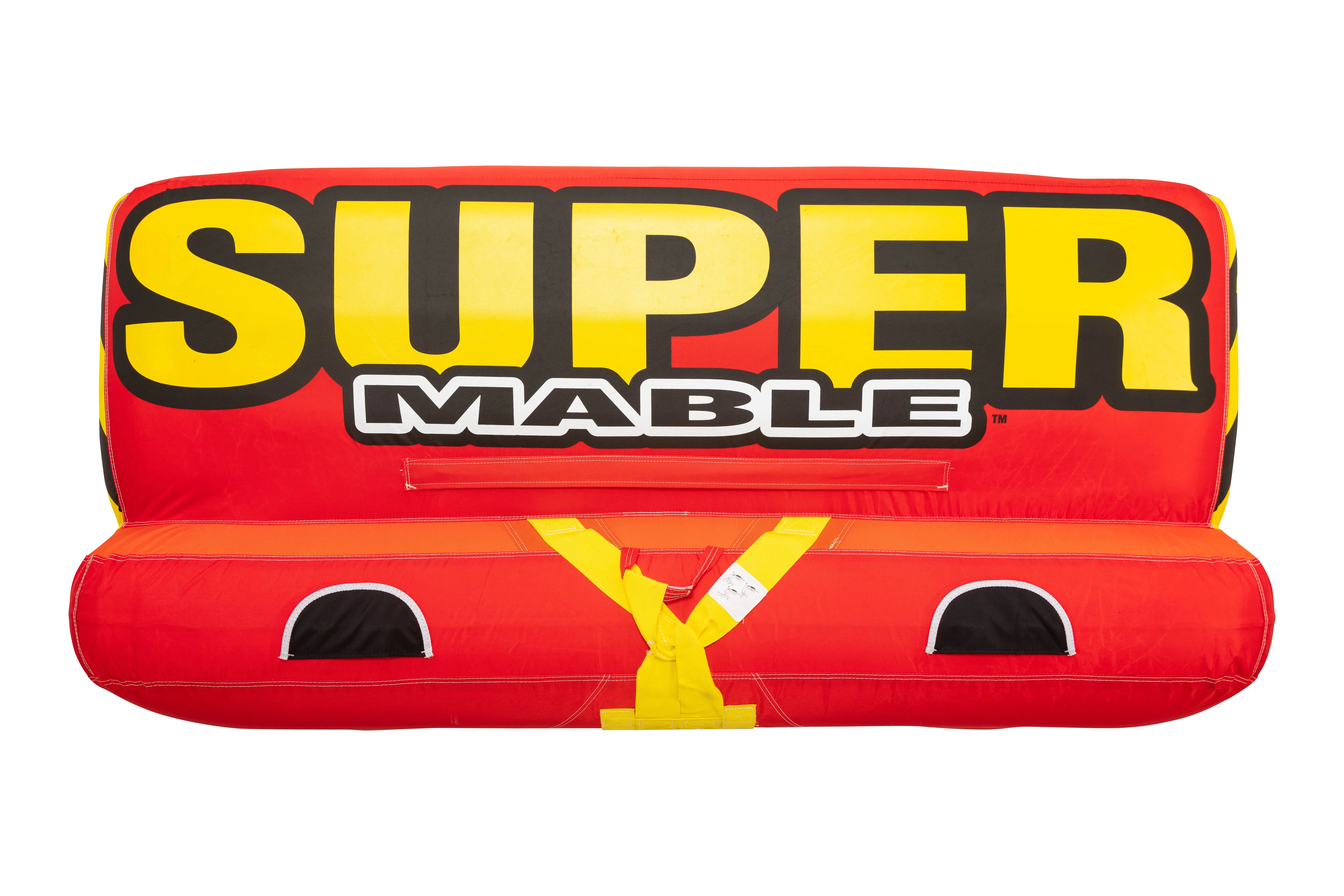 Super Mable is a 3 person towable tube that adds even more to the design we all know and adore. Discover all the classic features that Airhead tube lovers expect from the Big Mable—including a supportive backrest, top-notch safety features, foam seating pads, and dual tow points. This chariot-style towable tube holds up to three riders, making it perfect for family outings. Kids and teens will enjoy the versatility of this tube, which can be ridden two different ways, and 16 foam-filled handles keep riders safe and secure. The bright orange color and racing-inspired design turns heads and inspires both speed and thrills. Plus, the Kwik-Connect tow point makes it easy to attach and detach at a moment’s notice. This large water tube doubles as a floating lounger, so you can kick back and relax after a long day of excitement. Super Mable is one of the most sought-after tubes available, and the Heavy gauge PVC bladder and full nylon cover ensures fun and enjoyment for years to come.