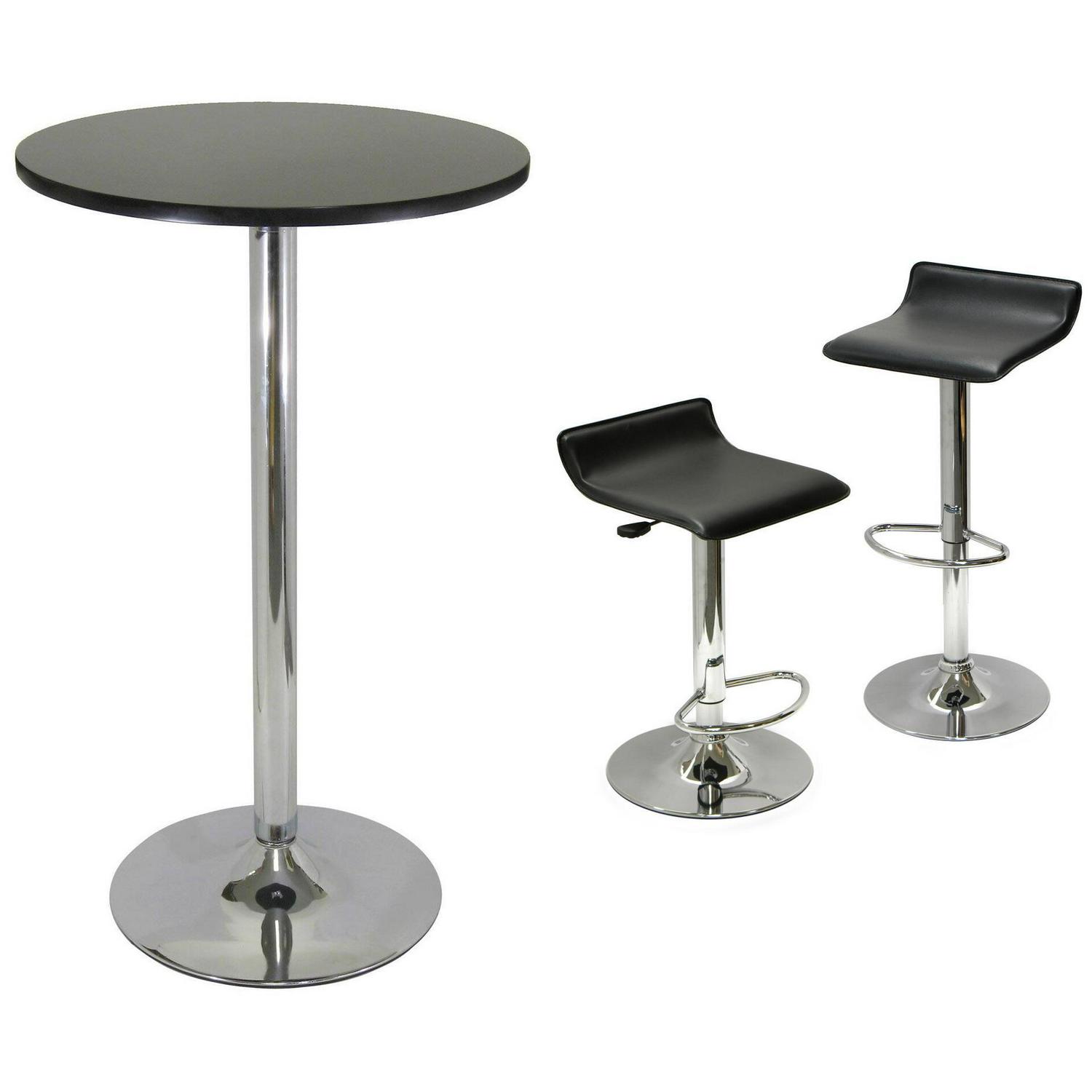 bar area with this contemporary Airlift Adjustable 3 Piece Pub Set in Black and Chrome. This modern set features an MDF-constructed table top and an adjustable shiny chrome leg and stand. The stools in this round pub table set feature a sturdy PVC seat, a full 360-degree swivel, a comfortable footrest ring and an airlift height adjustment from 21″ to 29″. This easy-to-care for set requires some assembly. It is ideal for small apartments and studios. Get more, save more and spend less when you buy these items together.