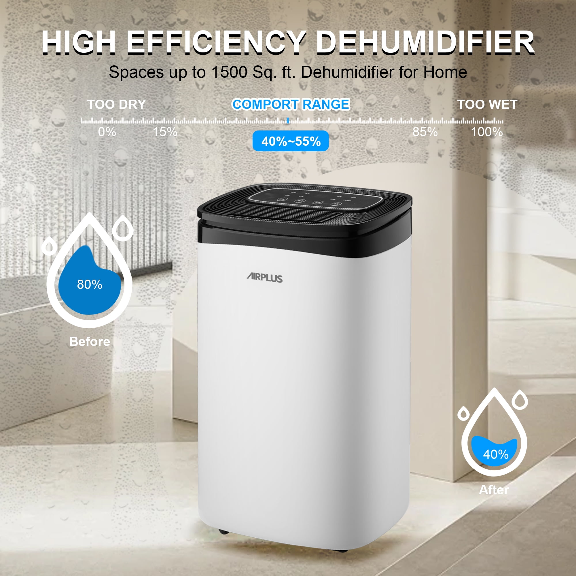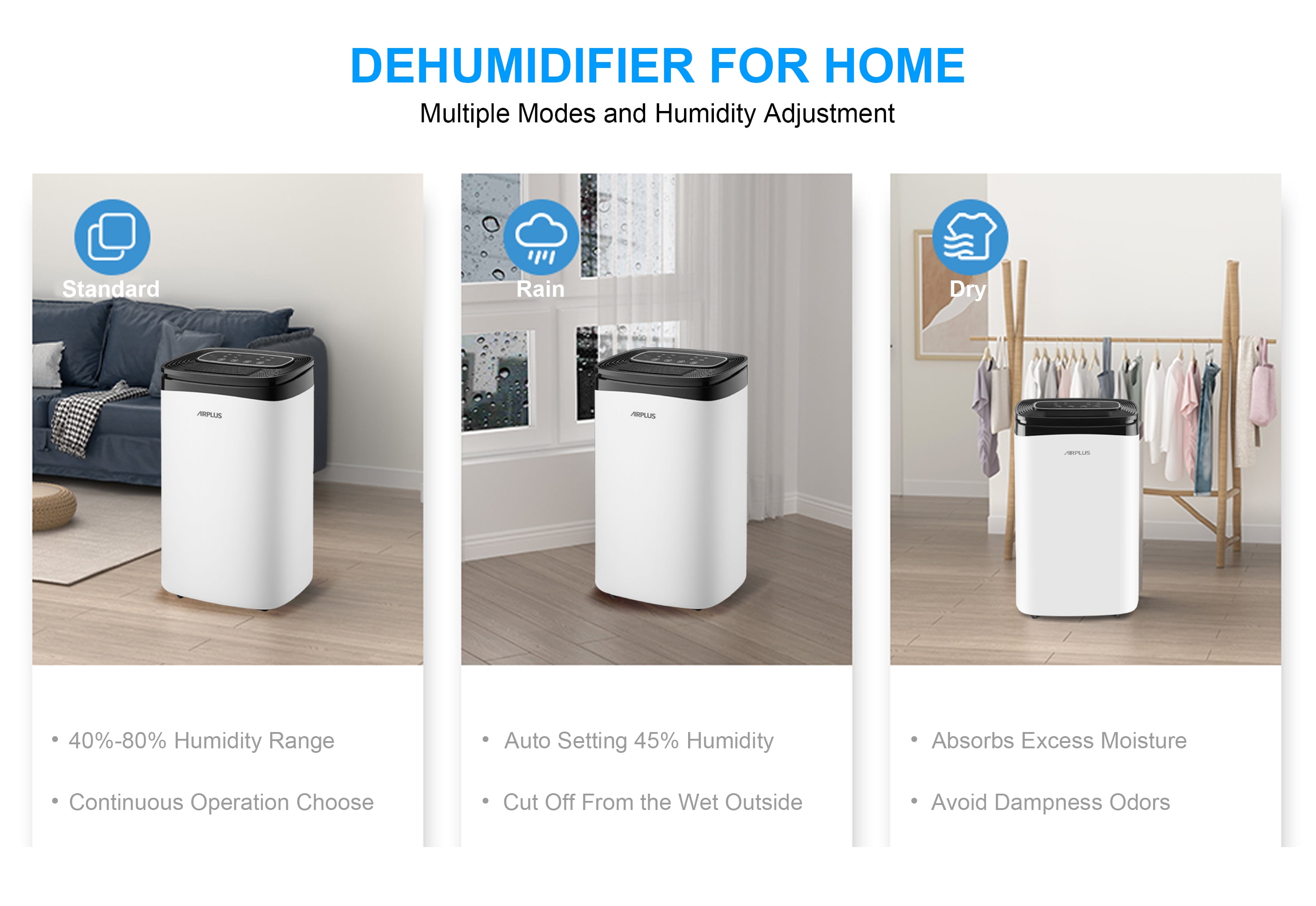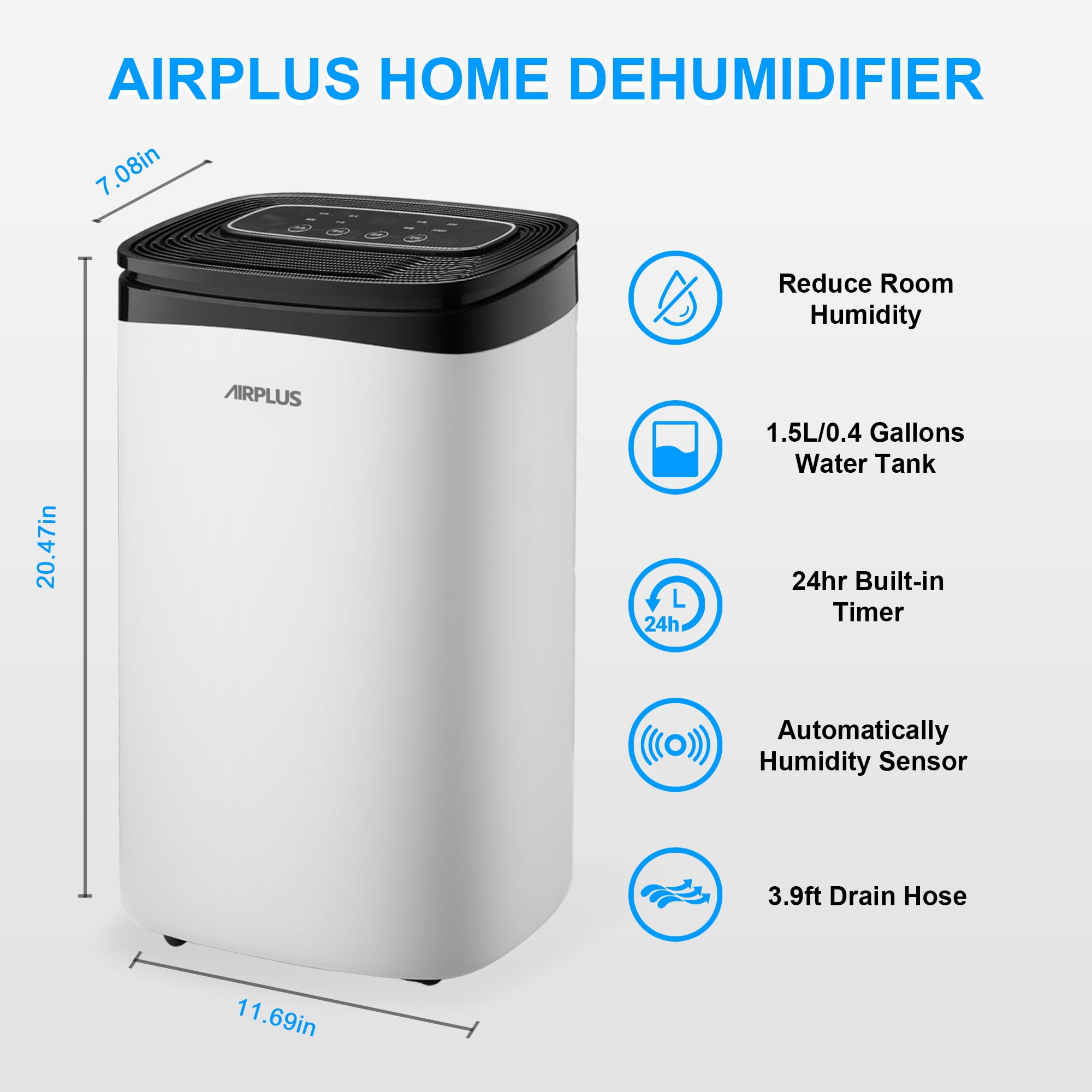 CONVENIENT & EASY TO USE 30 Pint(DOE Rating 7.54 pints/day) Dehumidifiers for bathroom mold provides you with a timing Shutdown/Start-up function – you can program the 24-hour timer to suit your lifestyle. bathroom dehumidifiers with hose What’s more, this large dehumidifiers for basement with hose is surprisingly. dehumidifiers for basement with fast dry And basement dehumidifiers the convenient universal wheels make our home dehumidifiers for home with drain hose easy to move. LOW-NOISE & OPTIONAL MODES The average sound and adjustable fan speed & humidity will get you far away from the disturbing noise when sleeping or studying – suitable for baby, pregnant woman, the old… This house dehumidifier for home also provides drying clothes and dehumidifying mode for you to choose from. Efficiently dry clothes with ONE button. dehumidifiers for basement WIDE APPLICATION The versatile 30 Pint(DOE Rating 7.54 pints/day) dehumidifiers for basement large room suits bedrooms, living rooms, dining rooms, attics, basements, and garages well. Dehumidifiers for home damp efficiently removes moisture while effectively reducing the musty odor in your home, providing you with a dry and comfortable. TWO-WAY TIMING Air 30 Pint(DOE Rating 7.54 pints/day) dehumidifiers with drain hose provides you with a timing boot and shutdown function – you can program the 24-hour timer whenever you need. For example, it can save you money not only by turning the basement dehumidifier for home on at night in areas that have cheaper off-peak electricity rates but also by turning it off as long as your preset time is up for damp clothes. dehumidifiers for basement TWO METHODS OF DRAINAGE 30 Pint(DOE Rating 7.54 pints/day) whole house dehumidifier large room for home 1500 sq ft offers you two drainage methods small dehumidifiers for home and basement. Manual drainage of a 1.5L reservoir as well as continuous auto drainage with a hose. Well connect the hose and your appliance will drain automatically. With home dehumidifiers for large room unique design, you will never be caught by the consequence of a forgotten full water tank. The 3.94ft long hose is included. dehumidifiers for basement Dehumidifier 30 Pint(DOE Rating 7.54 pints/day) Dehumidifier Dehumidifier for Home dehumidifiers for basement Feature Brand: AIRPLUS Model No.: AP2002 Product Color: White Floor Area: 2000 Square Feet Water Tank Capacity: 1.5L Operation Mode: Standard; Drying; Sleeping; Raining Intelligent Constant Humidity: 40%RH-80%RH Timing Setting: 24Hours Timer Function: Auto Shut Off When Tank Full Drainage: Auto Drain/Continuous Drain With Drain Hose Rated Voltage: 115V~ Rated Frequency: 60Hz Rated Input Power: 192W Max. Input Power: 260W Rated Input Current: 2.3A Max. Input Current: 2.8A Sound Pressure Level: <45dB (A) Refrigerant Charge: R134a/3.35oz Net Weight: 20.5 lbs Product Dimensions: 29.7*18.0*52.0cm/11.69*7.08*20.47inch