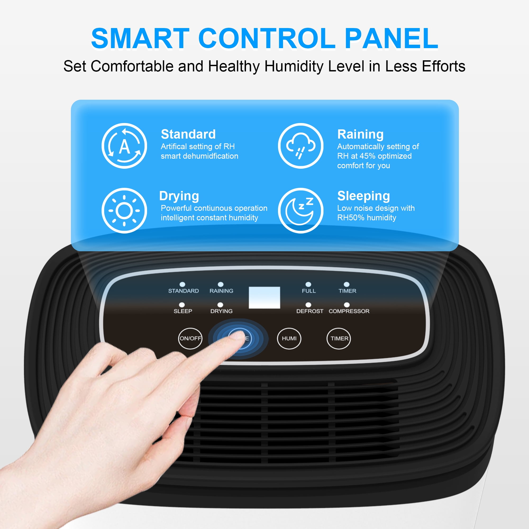 HIGH DEHUMIDIFICATION EFFICIENCY 30 Pint(DOE Rating 7.54 pints/day) dehumidifier for home with fast dry, Compared with the other bathroom dehumidifiers, the 2000 sq ft 30 Pint(DOE Rating 7.54 pints/day) garage dehumidifiers for room-(AP2002) for home with 1.5L capacity can quickly and quietly remove up to 30 pints(DOE Rating 7.54 pints/day) of moisture from the air per day. The effect of dehumidification is affected by the flow of air, the smaller space means a more obvious effect. Besides, the amount of dehumidification may change with temperatures and humidity. INTELLIGENT CONSTANT HUMIDITY & AUTOMATIC ADJUSTMENT basement dehumidifiers with drain hose is a must-have feature for a 30 Pint(DOE Rating 7.54 pints/day) dehumidifiers for large room. With it, you just need to set a target humidity. Then, it can monitor moisture levels in the air and adjust itself to maintain the selected humidity level. This saves you from repeatedly turning your 30 pint(DOE Rating 7.54 pints/day) dehumidifiers for basement with drain hose on and off. dehumidifiers for bedroom
