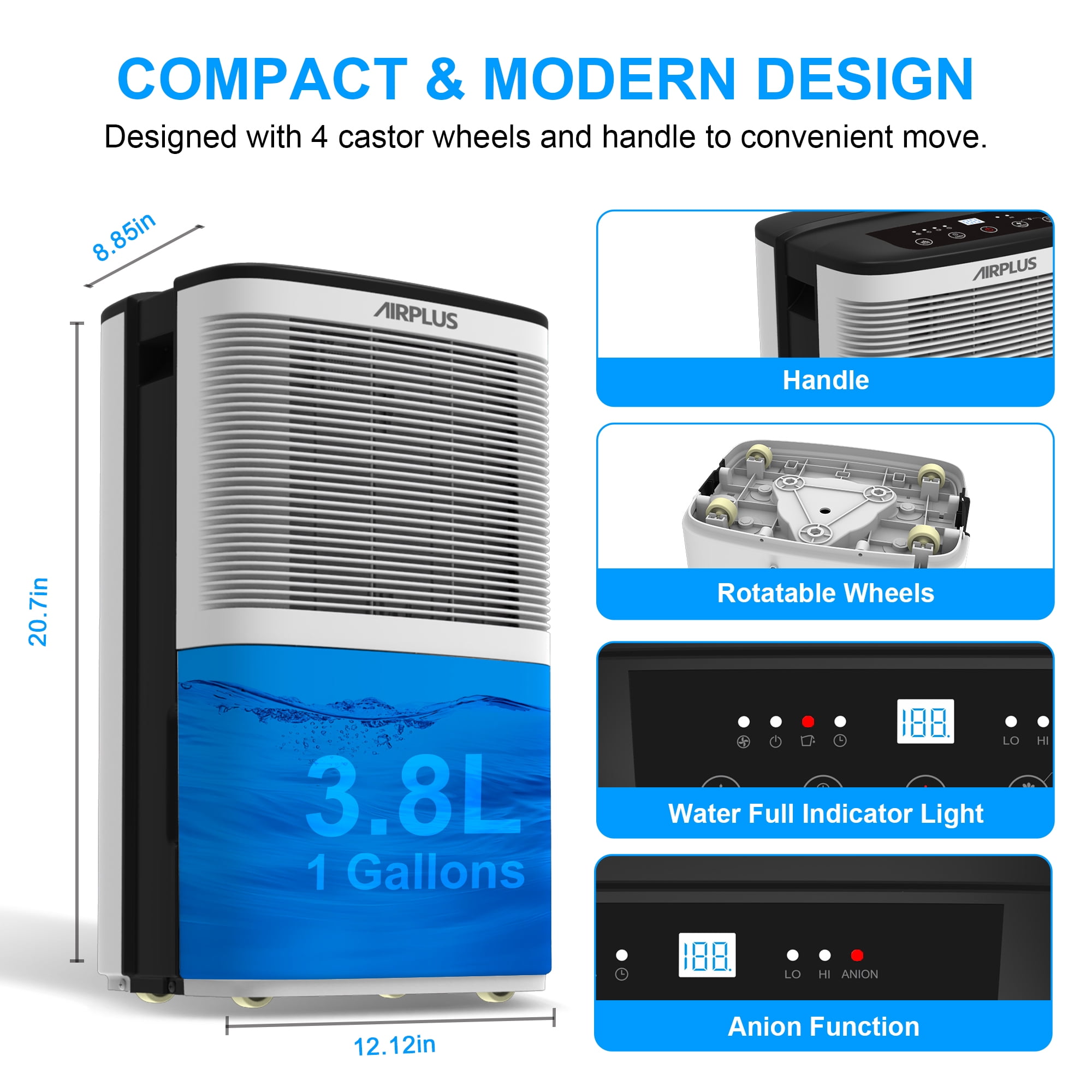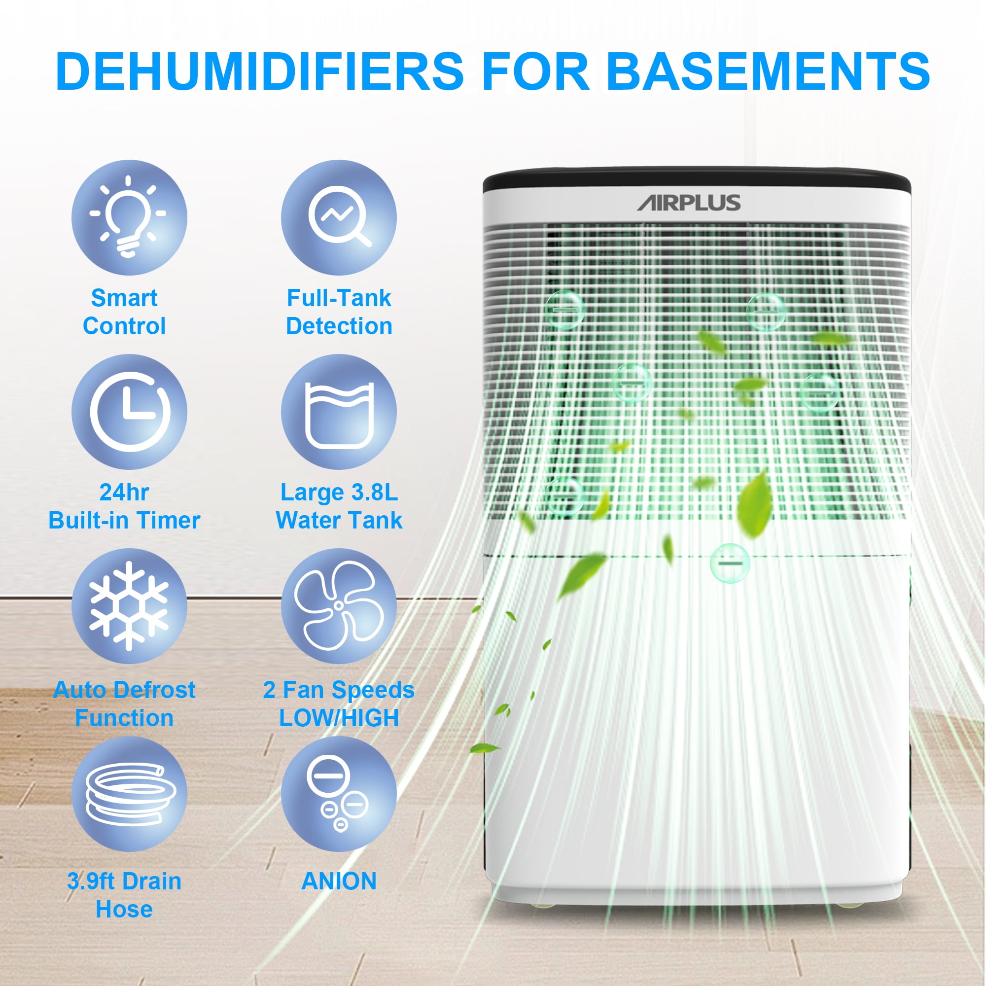 AIRPLUS 9.69 Pint Dehumidifiers for Basements Dehumidifier with Drain Hose for Home, 24 Hr Timer, Auto Drainage, AP16-601EE