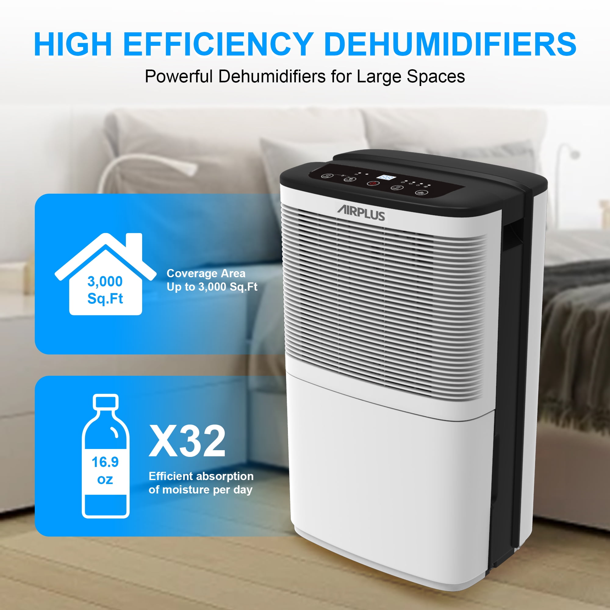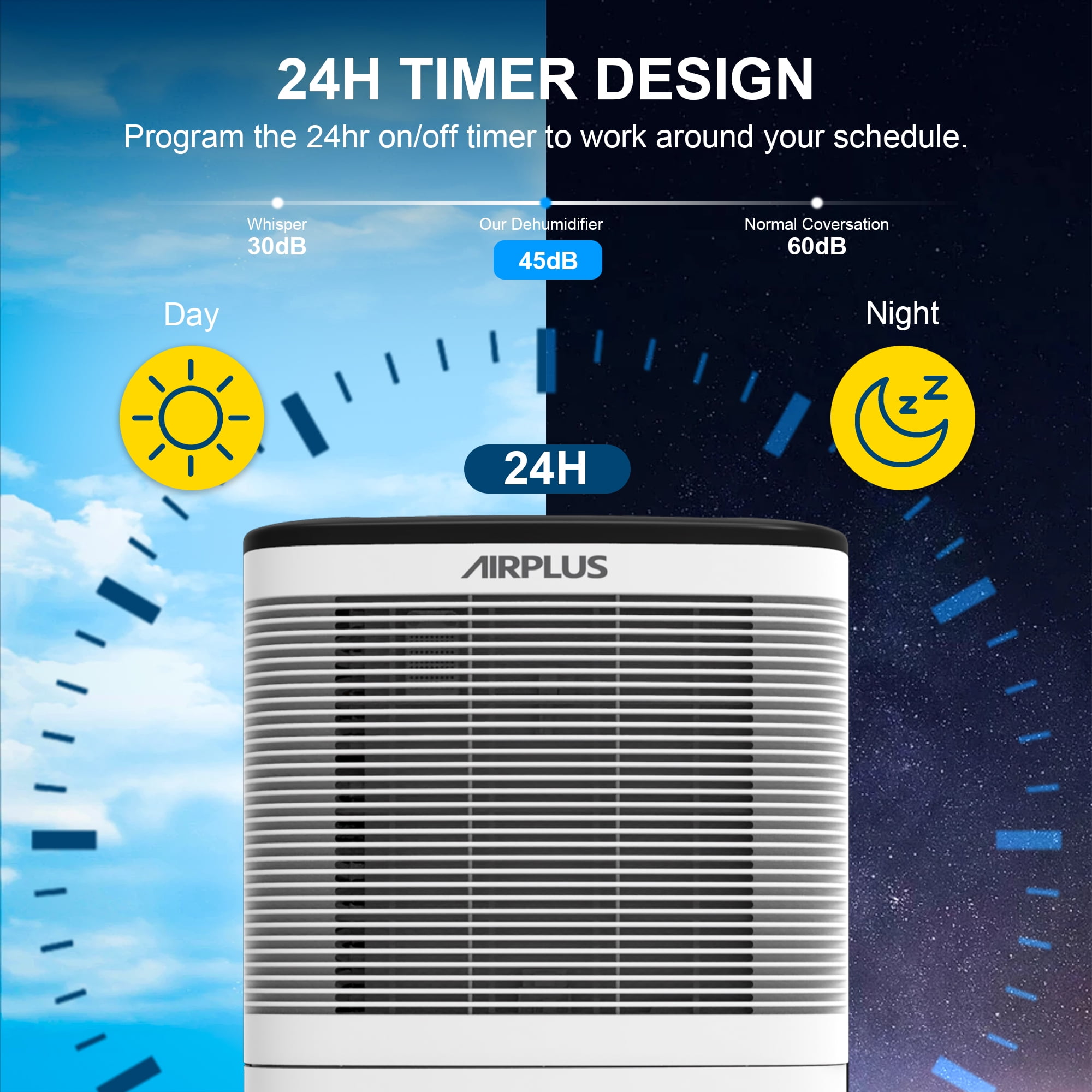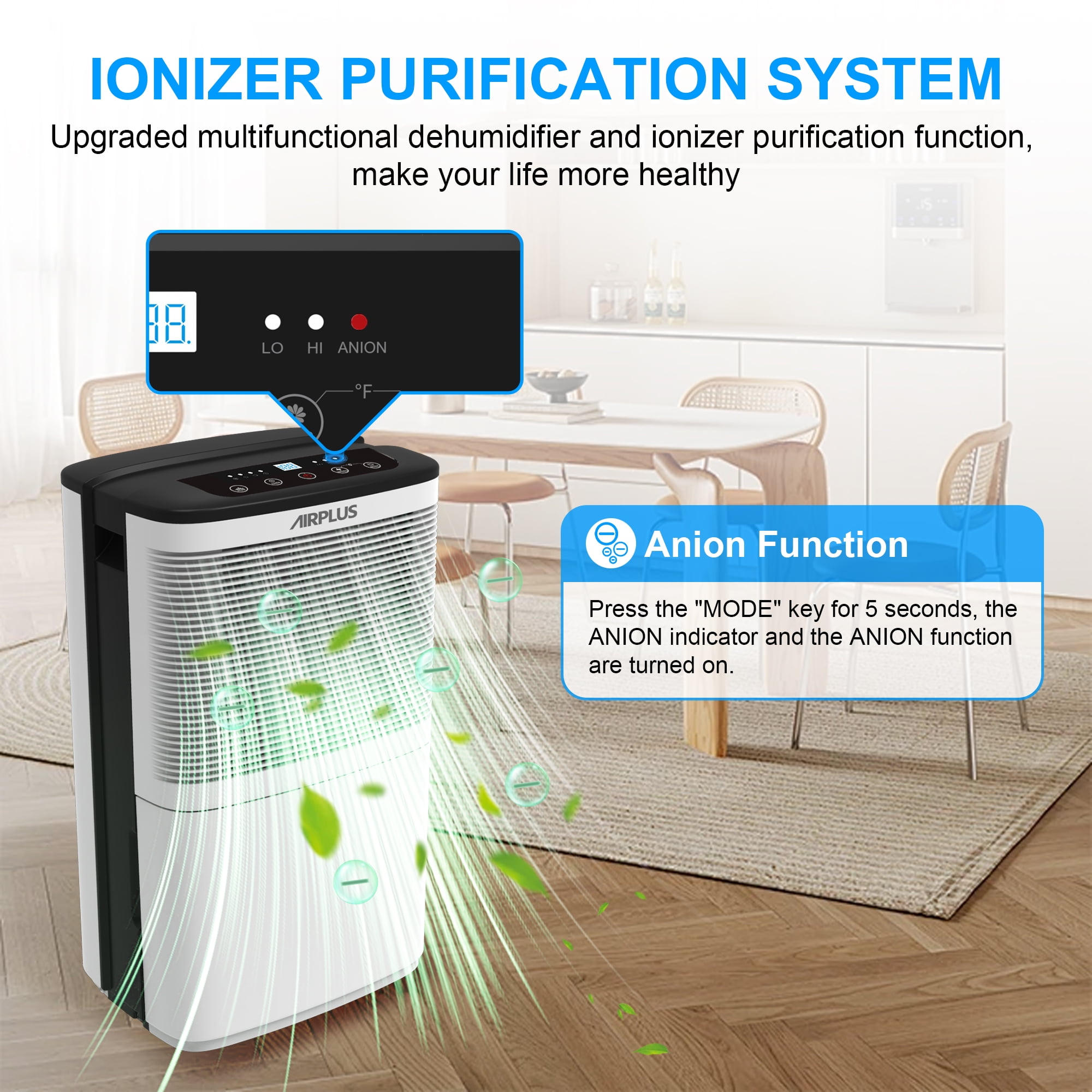 AIRPLUS Compared with the other bathroom dehumidifier for the home, the 3500 sq ft room dehumidifiers for the bathroom-(AP16-601EE) for the home with 3.8L//1Gallon capacity can quickly and quietly remove up to 50 pints(DOE Rating 9.69 pints/day) bathroom dehumidifiers of moisture from the air per day. The effect of dehumidification is affected by the flow of air, the smaller space means a more obvious effect. Besides, the amount of dehumidification may change with temperatures and humidity. The control panel of the AIRPLUS basement dehumidifier for the home features a simple design with informative buttons, including DRYING for stronger dehumidification, HUMIDITY for customized settings, 24H TIMER for auto-start and auto-stop, and IONIZER for purifying the air in your room