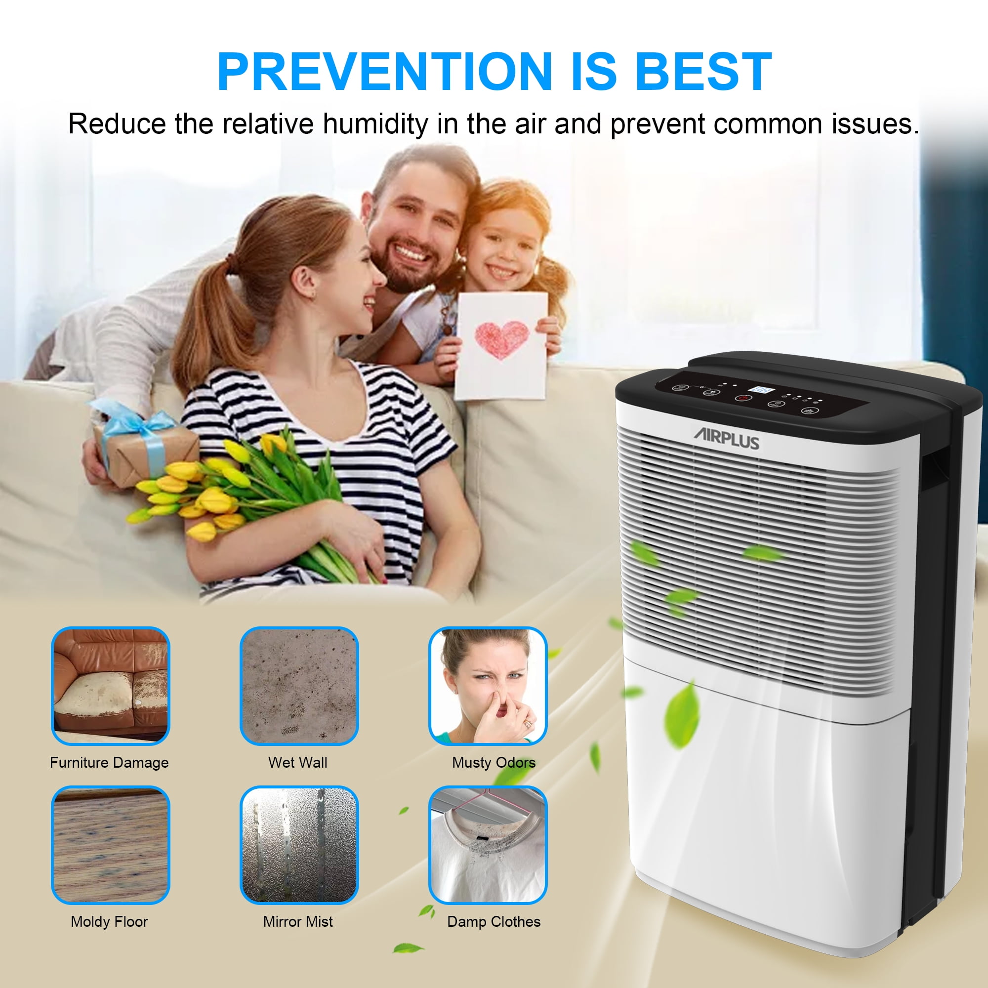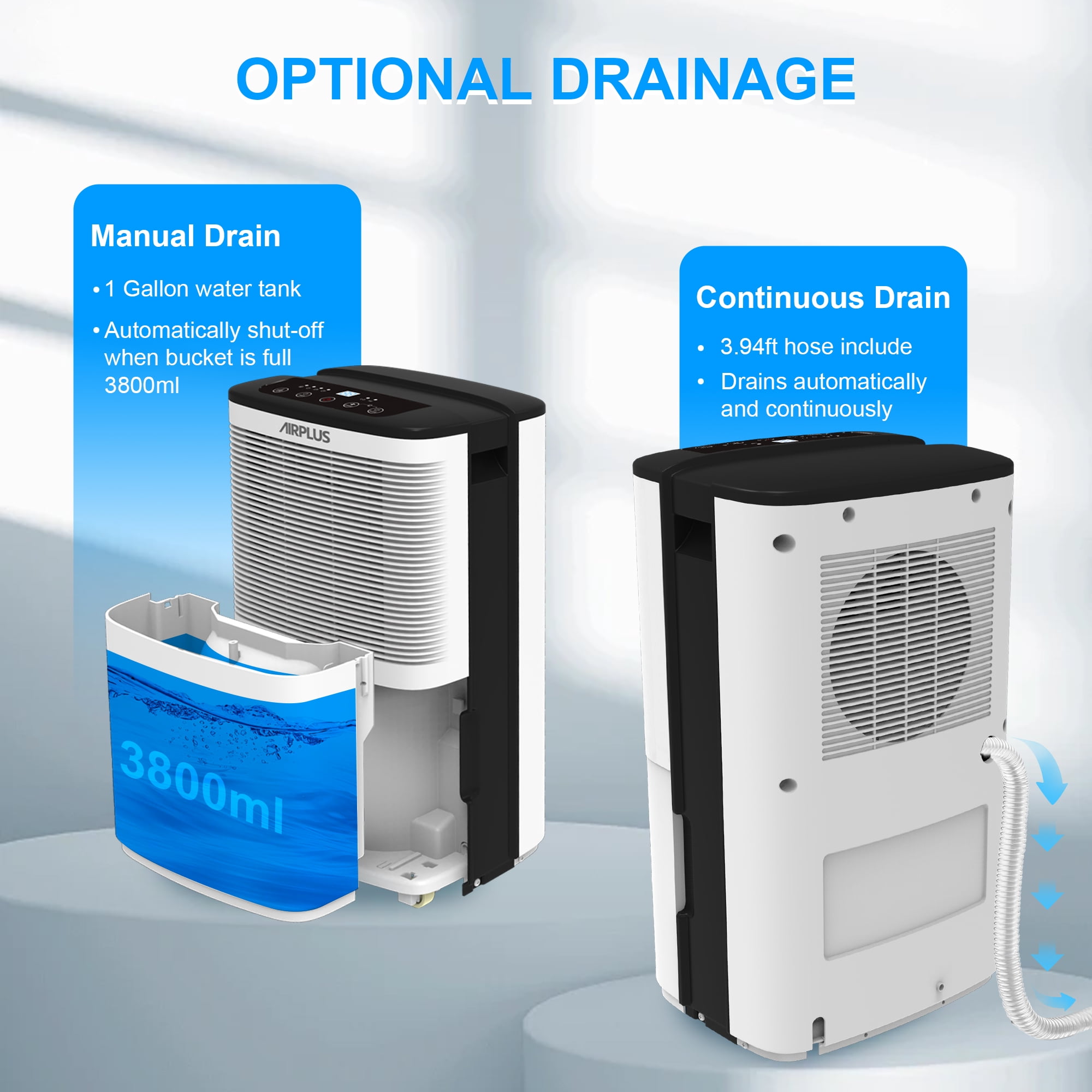 【Efficient Dehumidification】Our 50 pints(DOE Rating 9.69 pints/day) dehumidifiers for large room are able to remove up to 3500 Sq. Ft (under 95°F, 90%RH) of moisture per day and adjust humidity from 40% to 80%. This dehumidifiers for home damp is ideal to dry a damp room up to 2500-3500 sq ft. Perfect dehumidifier for bedroom, homes, basements, offices, living rooms, dehumidifiers for garages, laundry rooms, cellars and other places. The dehumidifiers for basement with hose reaches its optimum performance at room temperatures of 5°C – 35 °C. 【Intelligent Constant Humidity & Automatic】Basement dehumidifiers with drain hose is a must-have feature for a 50 pints(DOE Rating 9.69 pints/day) dehumidifier large room. With it, you just need to set a target humidity. Then, it can monitor moisture levels in the air and adjust itself to maintain the selected humidity level. This saves you from repeatedly turning your 50 pints(DOE Rating 9.69 pints/day) bathroom dehumidifier on and off. 【Optional Drainage】Dehumidifiers with drain hose for basement whole house dehumidifier large room for home 3500 sq ft offers you two drainage methods dehumidifiers for bathroom. Manual drainage of a 3.8L/1Gallon reservoir as well as continuous auto drainage with a hose. Well connect the hose and your appliance will drain automatically. With large dehumidifiers for home unique design, you will never be caught by the consequence of a forgotten full water tank. The 3.94ft long hose is included. 【24H Timer】 Dehumidifiers for home damp with drain hose provides you with a timing boot and shutdown function – you can program the 24-hour timer whenever you need. For example, it can save you money not only by turning the bathroom dehumidifier for bedroom on at night in areas that have cheaper off-peak electricity rates but also by turning it off as long as your preset time is up for damp clothes. low noise dehumidifiers for home. 【Water Full Warning】3.8L/1Gallon Large water tank/Continuous drain. When water tank reaches the maximum capacity, the 50 pints(DOE Rating 9.69 pints/day) dehumidifiers for basement with drain hose will automatically stop and the “tank full” indicator will light up until the water tank is emptied. No worries about the risk of the water overflowing. Dehumidifiers for home and room dehumidifiers for bedroom is equipped with a 3.94ft drain hose that connect to the drain pipe hole to continuously drain the water without emptying the water tank multiple times. 【Low Noise & Multiple Features】Smart basement dehumidifiers for bedroom have Low/High speed mode with sound levels of less than 40 dB allows you to work, read or sleep undisturbed. With the designed 360° rotatable wheels and built-in grip, you can move our dehumidifier for laundry drying around easily without scratching the floor. Meanwhile, dehumidifiers for bedroom is easy to use Common Problem Q: What if the dehumidifier you receive does not dehumidify? A: Firstly, check if the machine is in fan mode. Please switch to dehumidification mode according to the instructions to ensure normal dehumidification. If you still have any questions, you can contact the after-sales email on the instruction manual, and we will provide assistance for you. Brand: AIRPLUS Model No.: AP16-601EE Product Color: White Floor Area: 3500 Square Feet Water Tank Capacity: 3.8L//1Gallon Operation Mode: DRYING; Low/High SPEED; HUMIDITY; IONIZER; TIMER Intelligent Constant Humidity: 40%RH-80%RH Moisture Removal(95掳F,90%RH): 50Pints(DOE Rating 9.69 pints/day) Timing Setting: 24Hours Timer Function: Auto Shut Off When Tank Full Drainage: Auto Drain/Continuous Drain With Drain Hose Drain Hose: 3.94ft/1.2m Rated Voltage: 115V~ Rated Frequency: 60Hz Rated Input Power: 360W Max. Input Power: 470W Sound Pressure Level: <48dB (A) Net Weight: 21.38 lbs Product Dimensions: 30.8*22.5*52.6cm/12.12*8.85*20.7inch