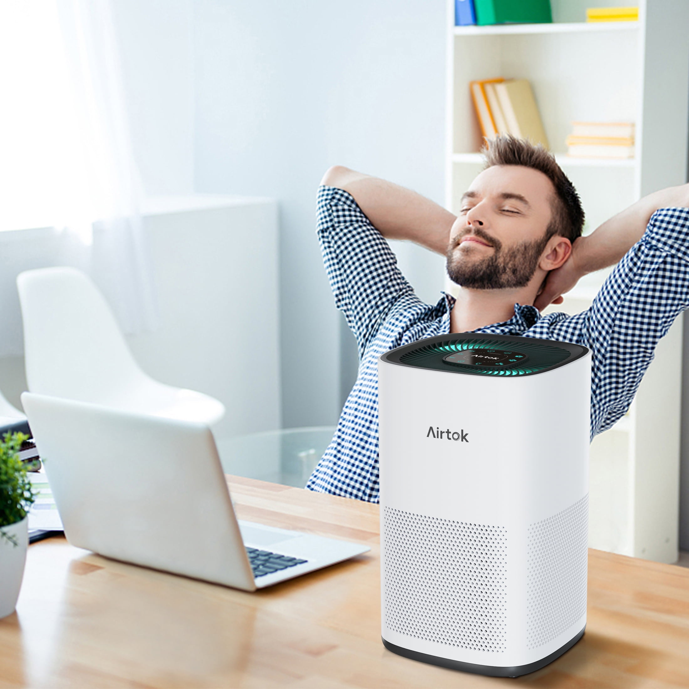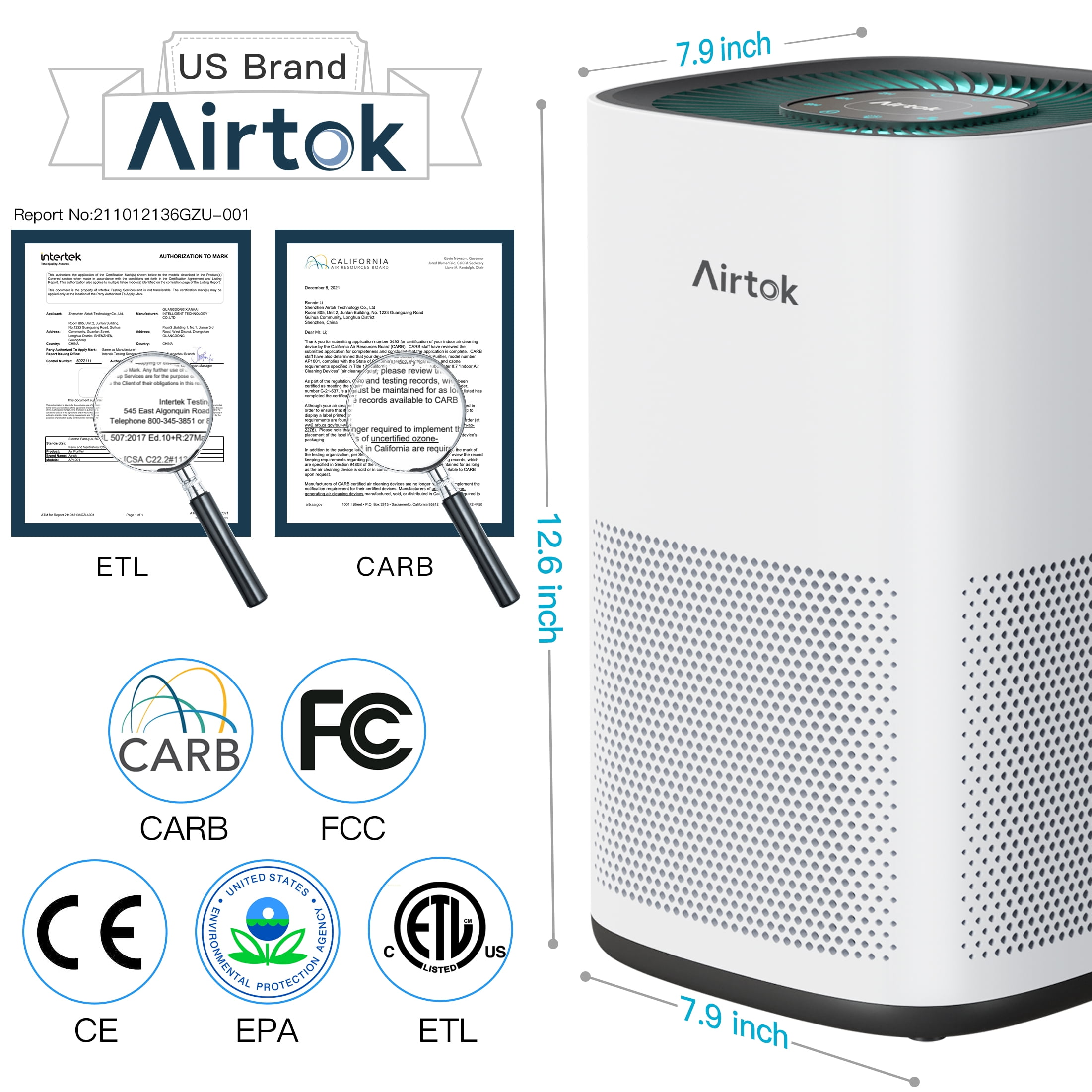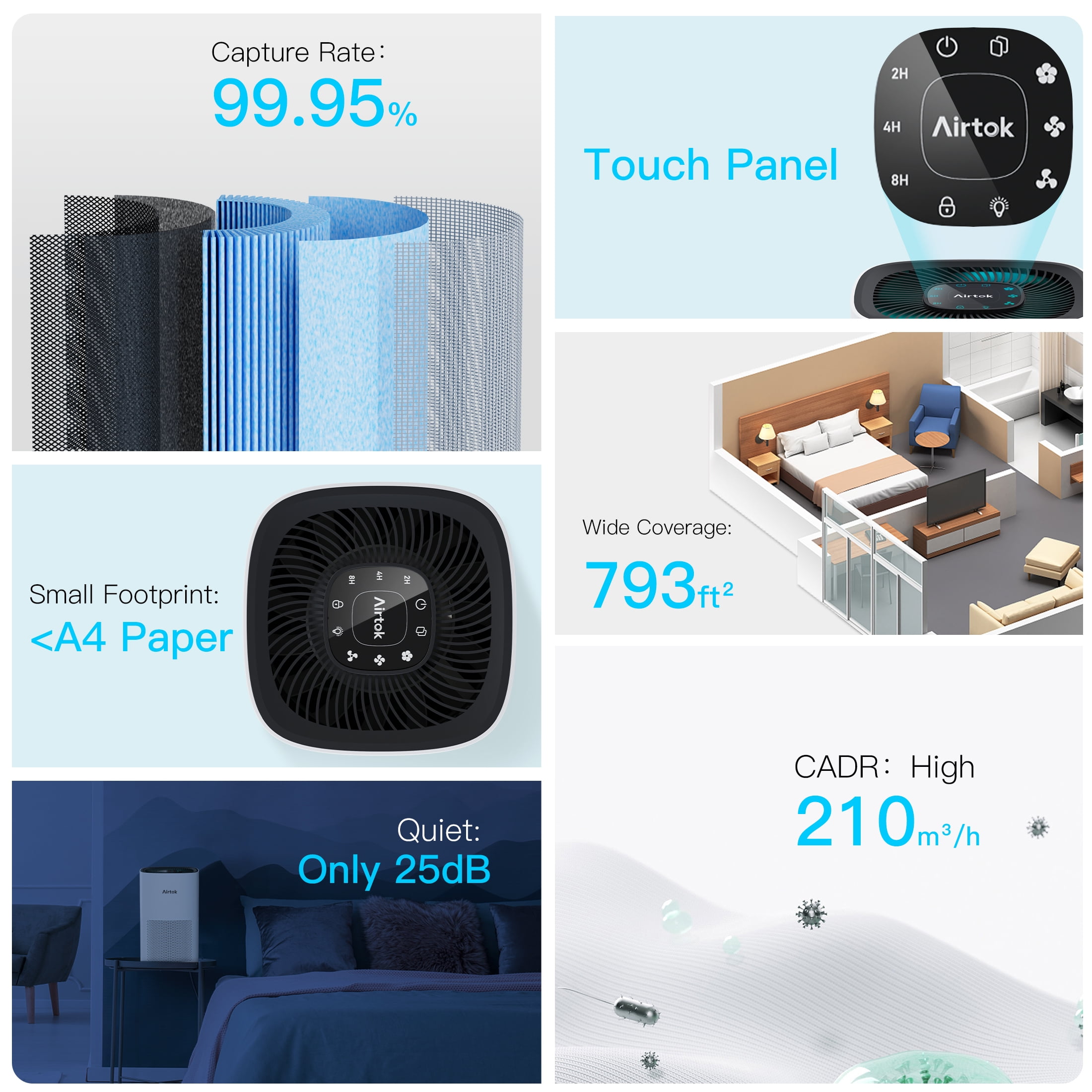 【True HEPA Filter】: AP1001 HEPA Air Purifiers use advanced H13 filter technology to trap up to 99.95% of harmful particles as small as 0.1 microns in diameter. Protect you from allergies, mold, smoke, and relieve odors. 【Powerful and Compact】: Our air purifiers are small in size but pack a punch with a CADR of 110 CFM/190 m³/h, circulating air 1.5 times per hour in rooms up to 793ft²(75m²). Whether it’s your living room, bedroom, or office, it can effectively purify the air and improve your overall well-being. 【Energy Saving and Quiet】: AIRTOK air purifiers use advanced DC Brushless Motors, powerful and energy-efficient with a rated power of 18W. With a noise level as low as 25 dB, the night light is optional. It won’t disturb your peaceful sleep, making it perfect for bedrooms. 【Smart and User-Friendly】: With 3 fan speeds, a child lock feature, and customizable timer settings, the AIRTOK air purifier is both smart and user-friendly. 【Tested and Trustworthy】: AP1001 Air Purifiers are CARB, FCC, CE, EPA, and CA65 certified, ensuring high-quality performance and safe use. Explore More AIRTOK Products: