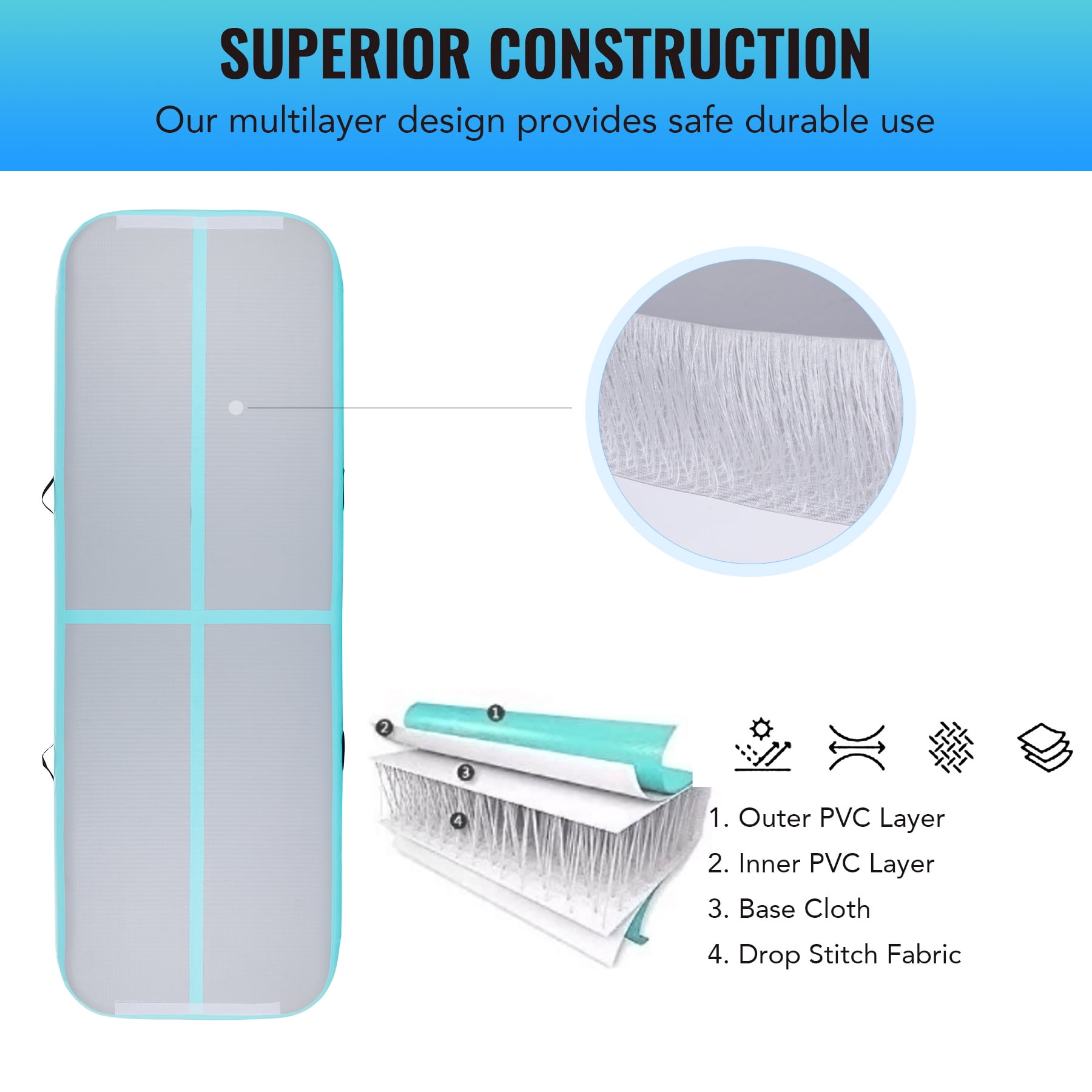 Our nearly 10 ft. (3 m) air track mattress is 4 inches (10 cm) thick and can be variably inflated for rock hard firmness or a soft springy bounce. As a gymnastics mat, cheerleading mat, or tumbling mat, it provides ample room for routines while protecting you and your family from the repetitive motion and impact injuries caused by exercise on the ground or traditional gym floor mats. The non-toxic and 500D vinyl material provides excellent traction and grip for you to hold your poses with ease, and the same goes for use in home gym flooring or as a luxuriously comfortable yoga mat at home or professional yoga studio.