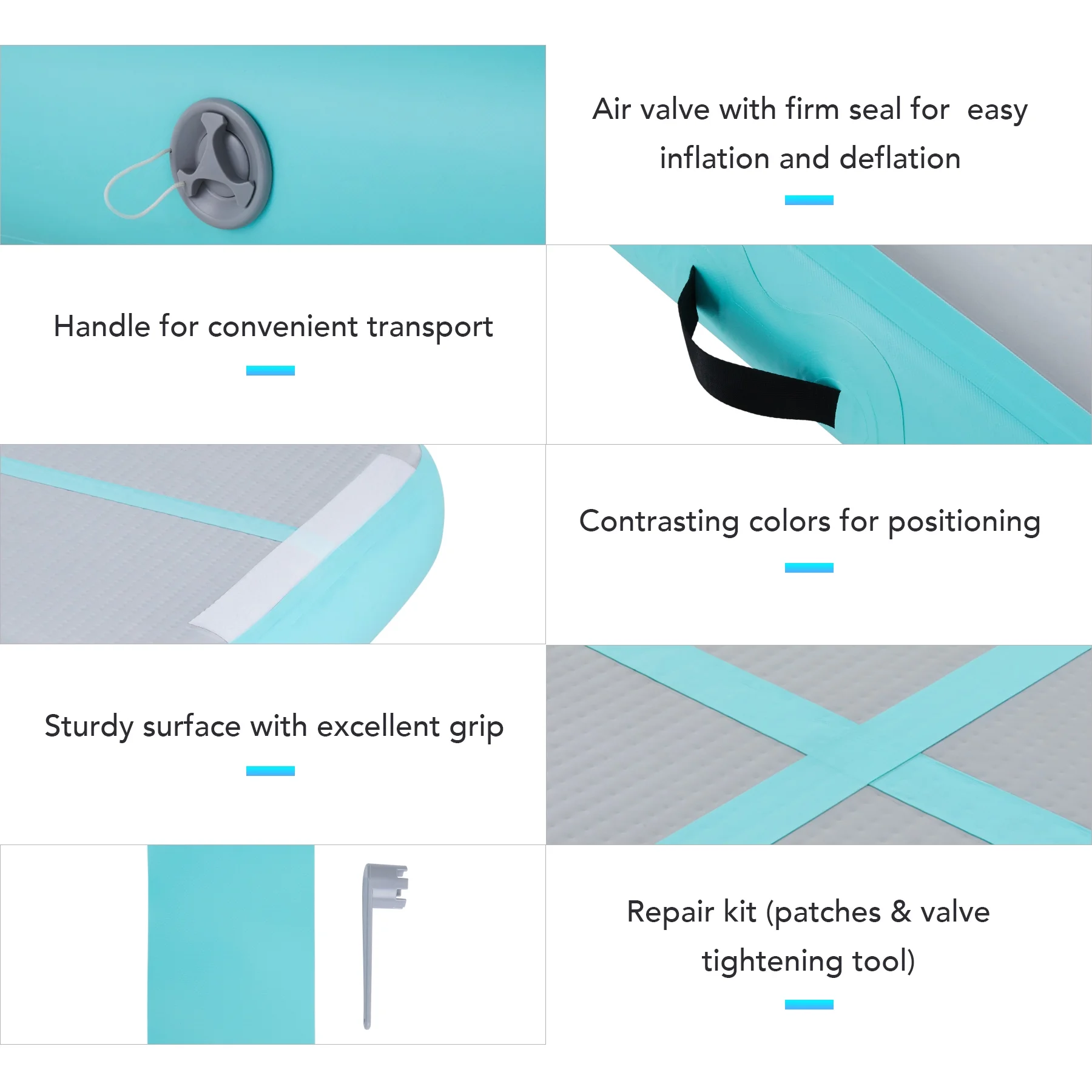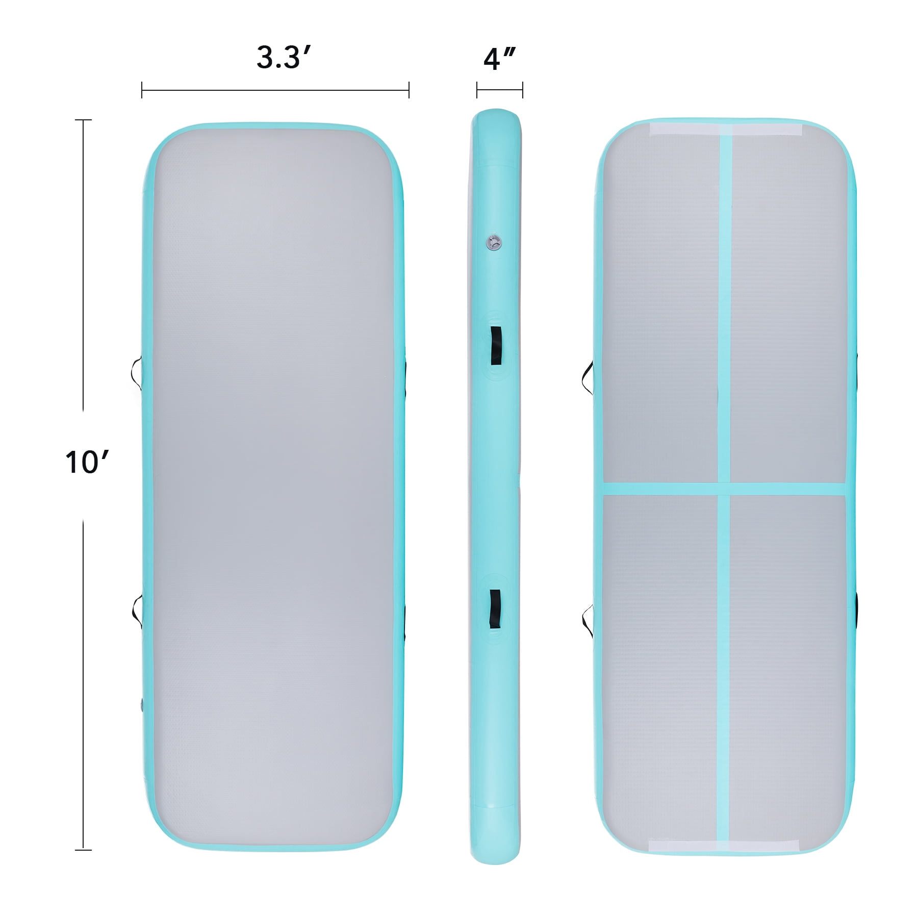AirTrack Inflatable Home Gymnastics Tumbling Mat 1min Inflation& Deflation: Nearly 10 feet long (3 m), over 3 feet wide (1 m), and 4″ thick (10 cm) at full inflation A safe and luxuriously comfortable workout & yoga mat Highly resistant to wear, tear, and abrasion w/ eco-friendly non-slip 1.2mm-thick vinyl fabric
