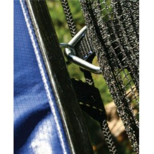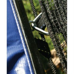 – Legs of 8′ trampoline with enclosure are W-shaped, creating 2 contact points for each leg for additional stability