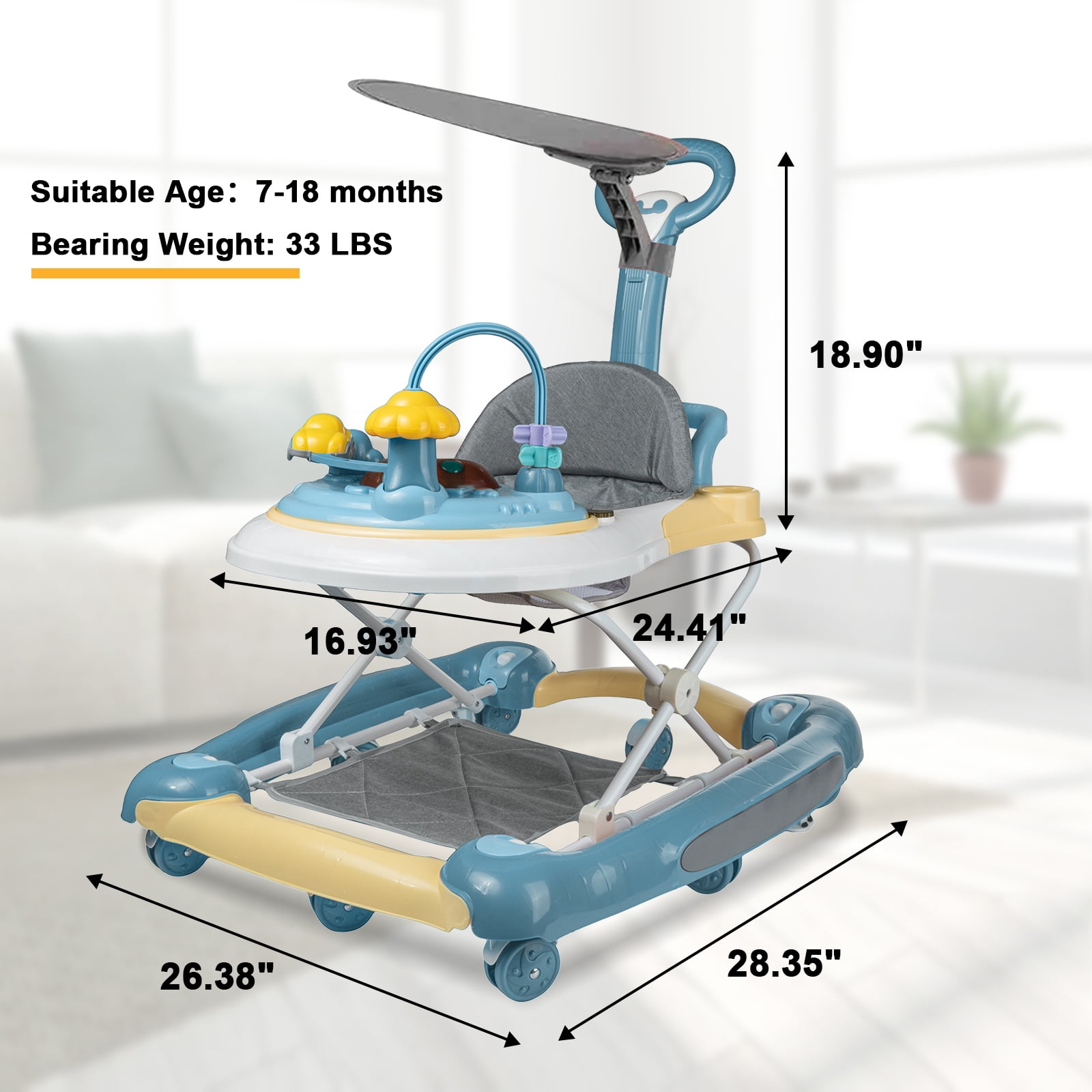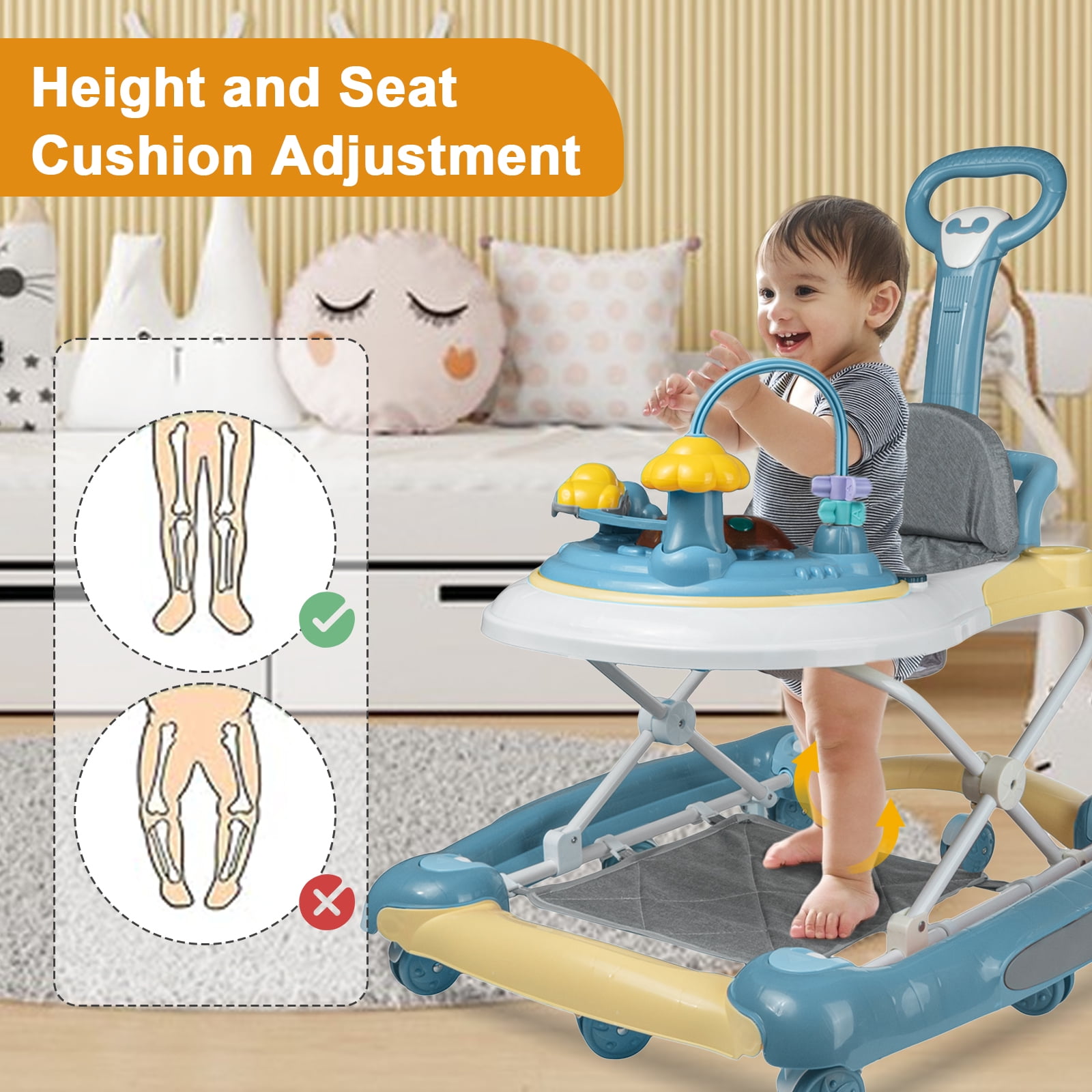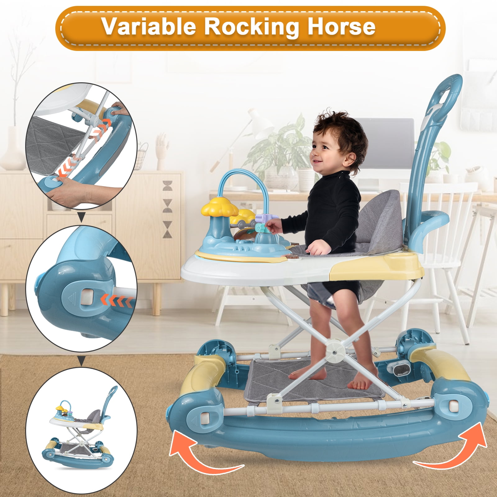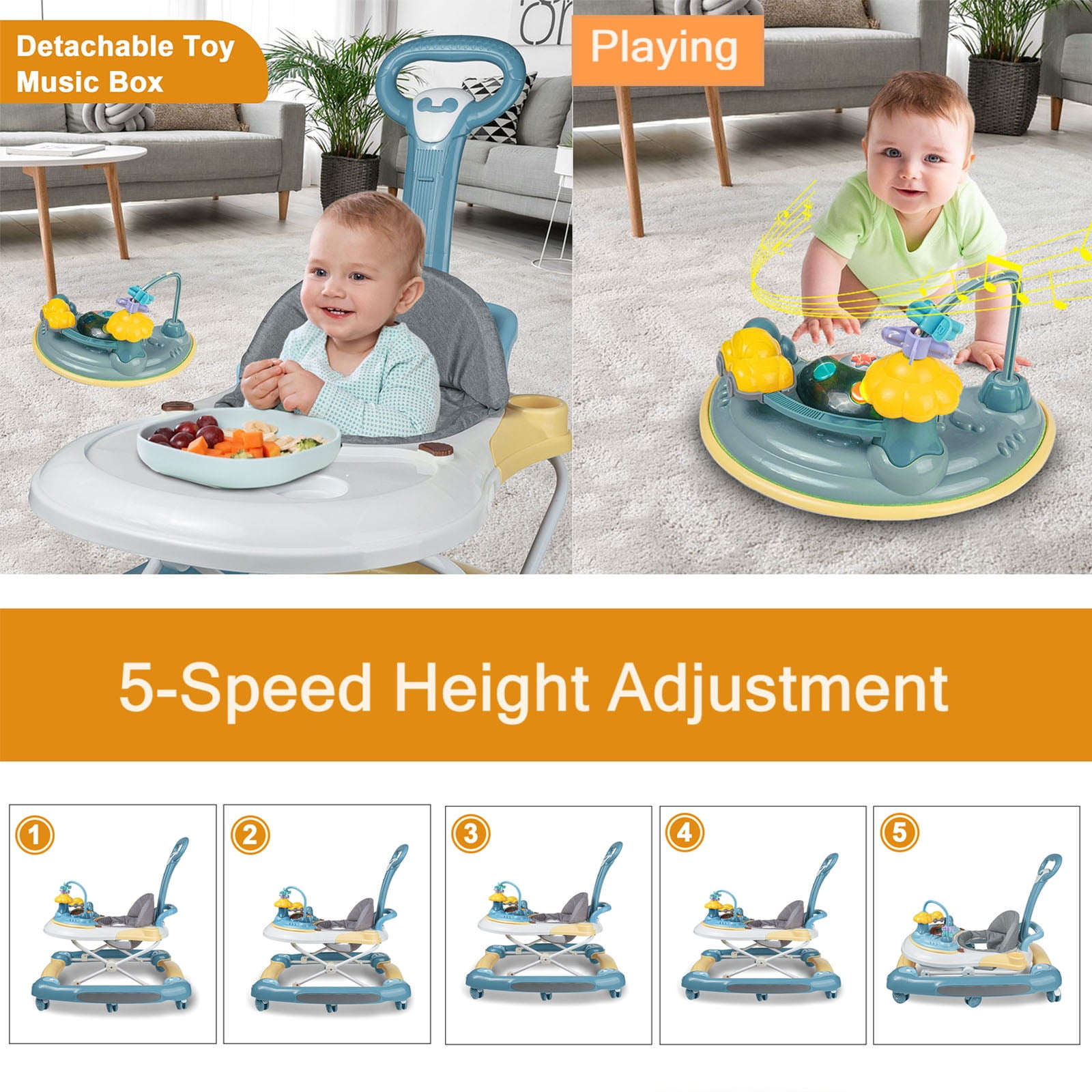 The AJONALAA unisex baby walker helps babies balance, stand and walk, it features four distinct modes to accommodate your growing child. The 360-Degree Activity Center Mode allows the baby to interact with all the toys, sounds, colors, shapes, on the walker by spinning all the way around in the comfy seat. Walker Mode encourages babies to simulate walking movements, and the Push Behind Mode provides balance for new walkers with a sturdy handle on the back. A great toy for babies, the 5-in-1 Discover & Play Musical Walker will drum up some fun every time you use it.